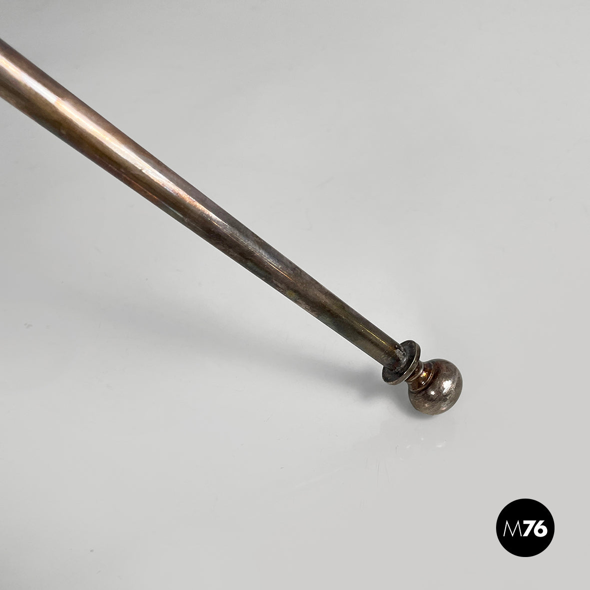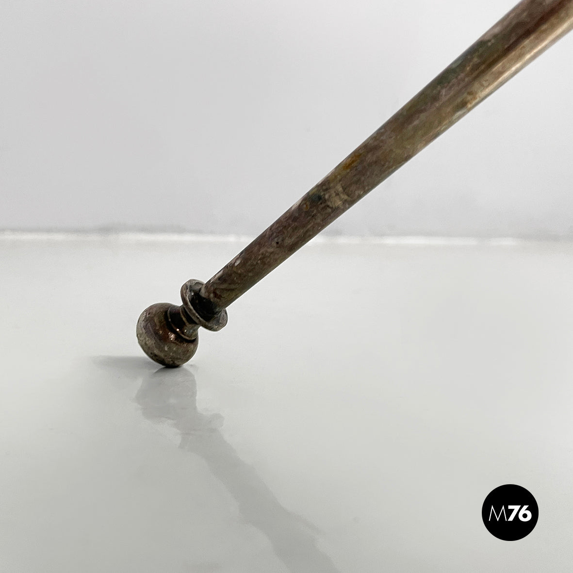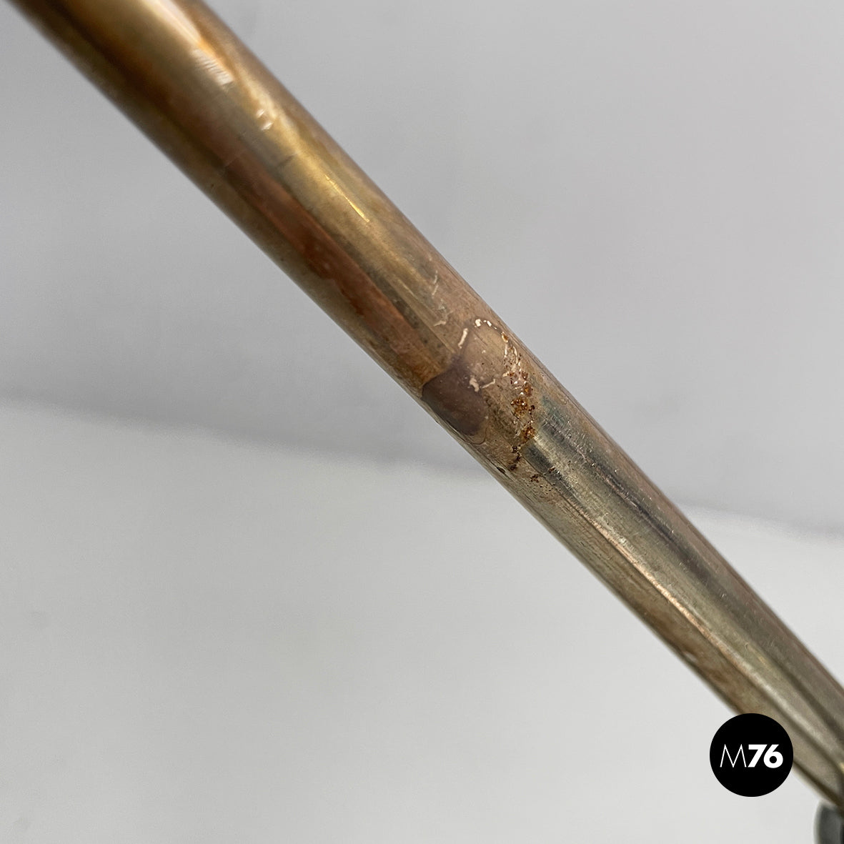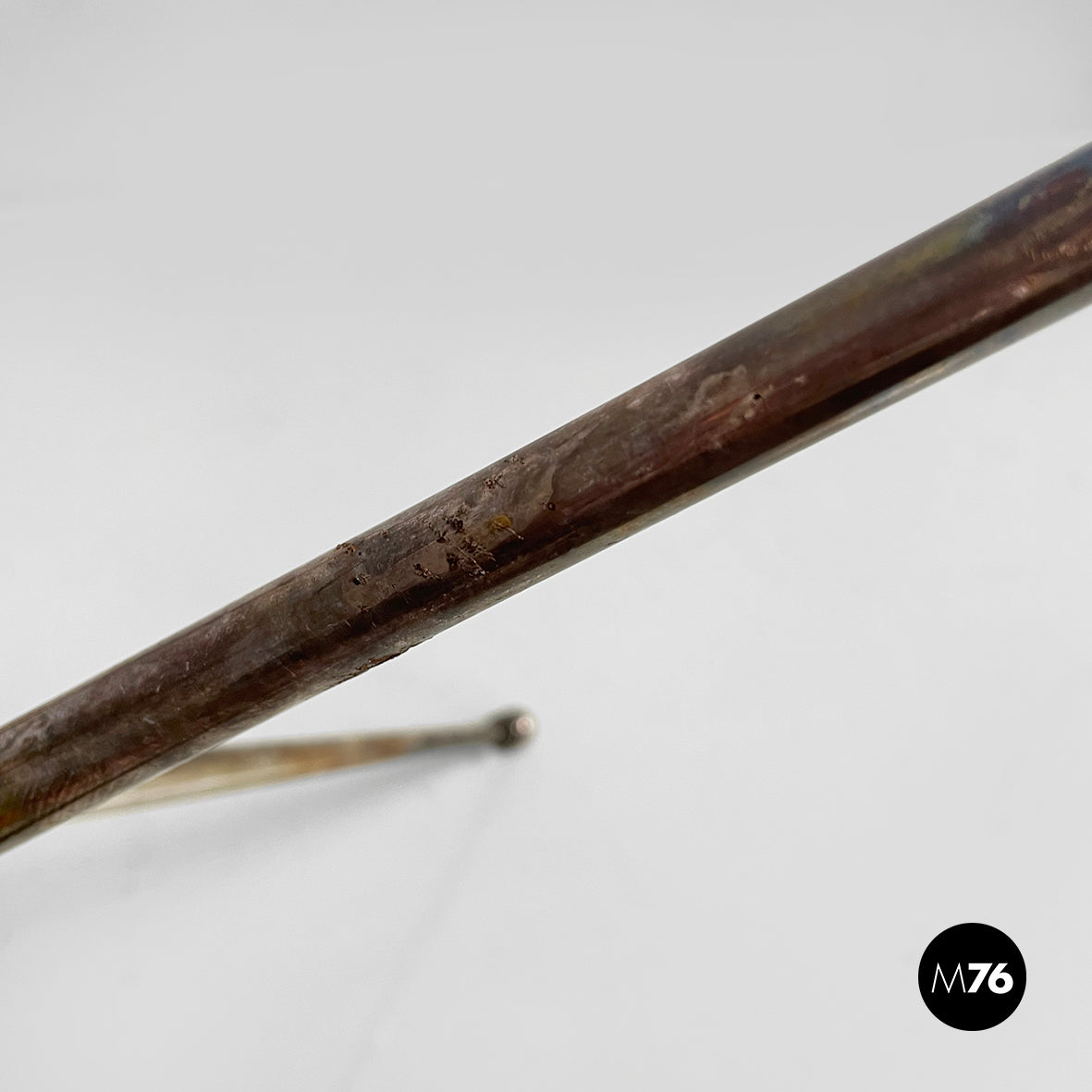 Coffee table with round top in thick glass. The base is composed of three burnished metal rods joined at the center by a ring. Spherical feet.