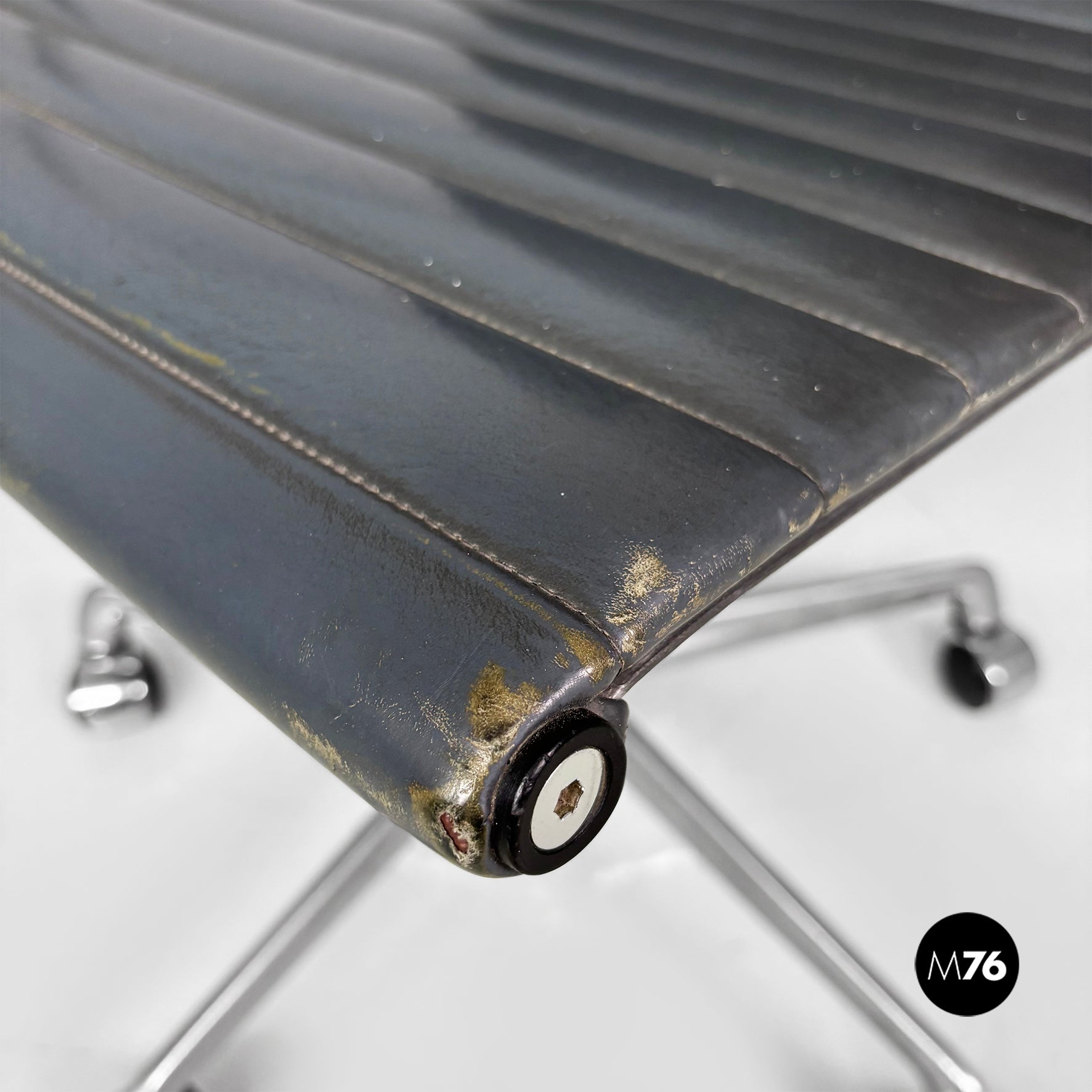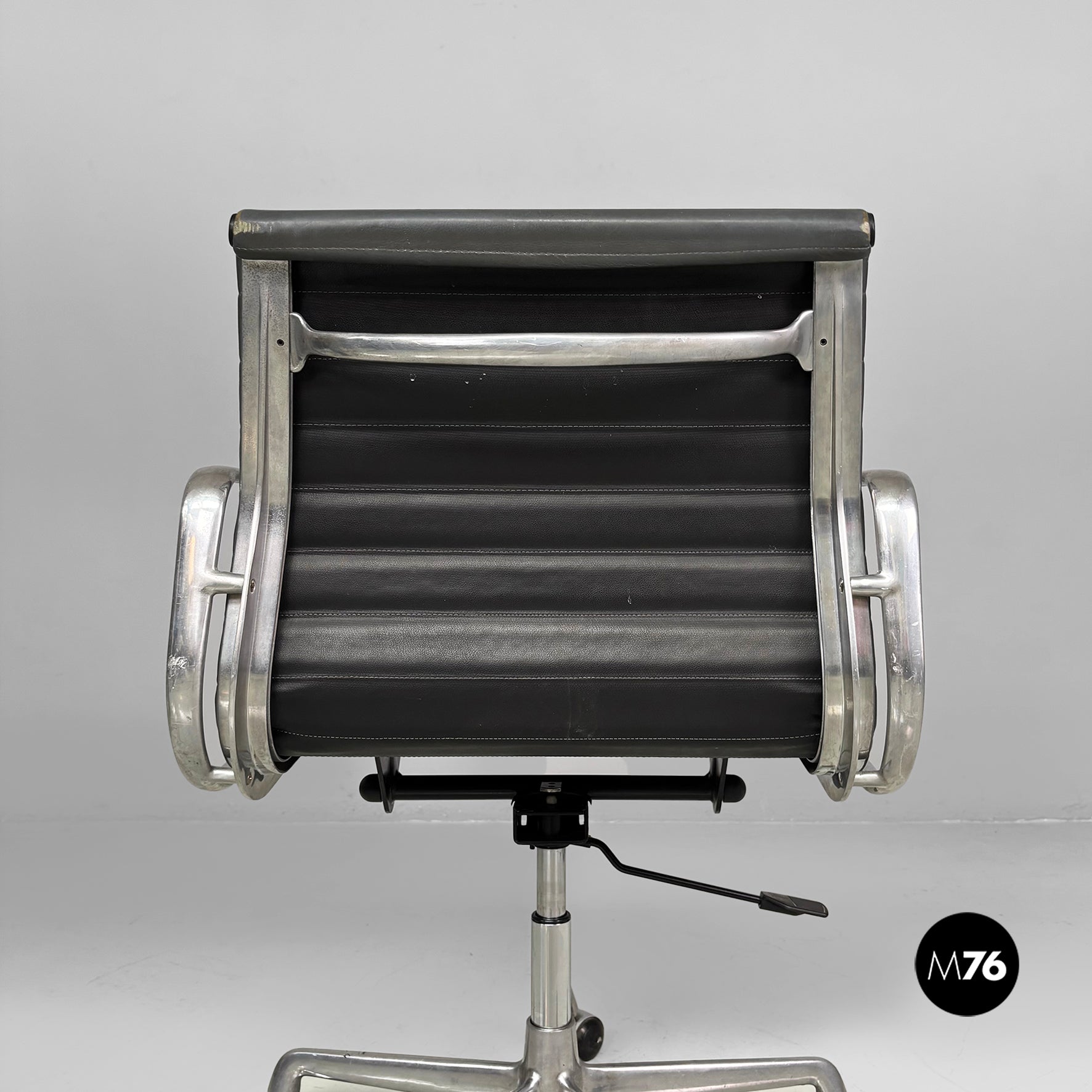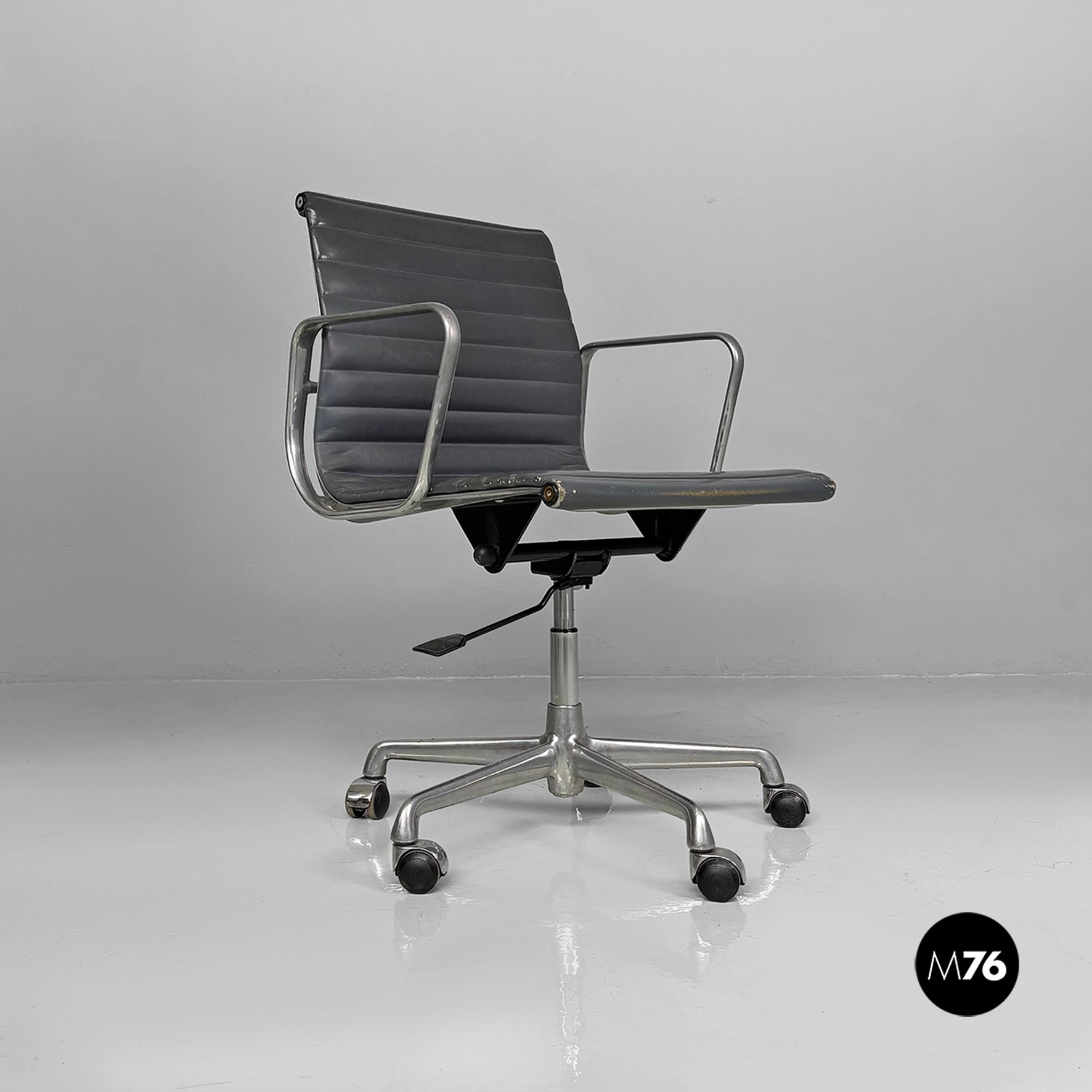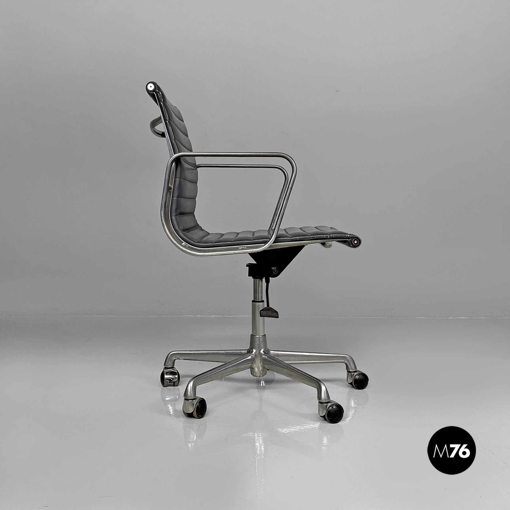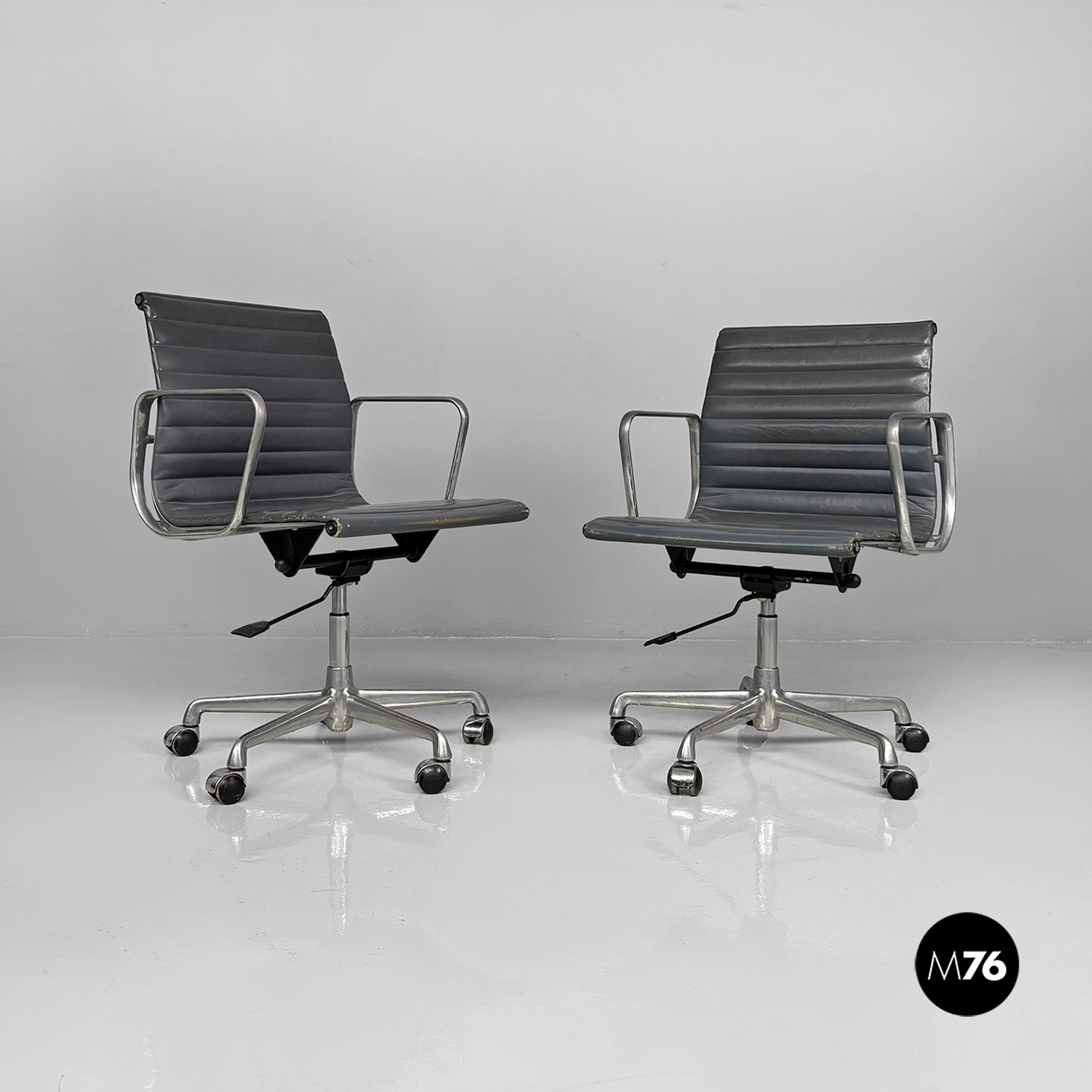 Pair of office chairs, model EA108 in metal and leather. The seat and backrest are upholstered in dark gray with horizontal stitching. The frame is made of silver-plated metal and features five spokes with rubber feet.