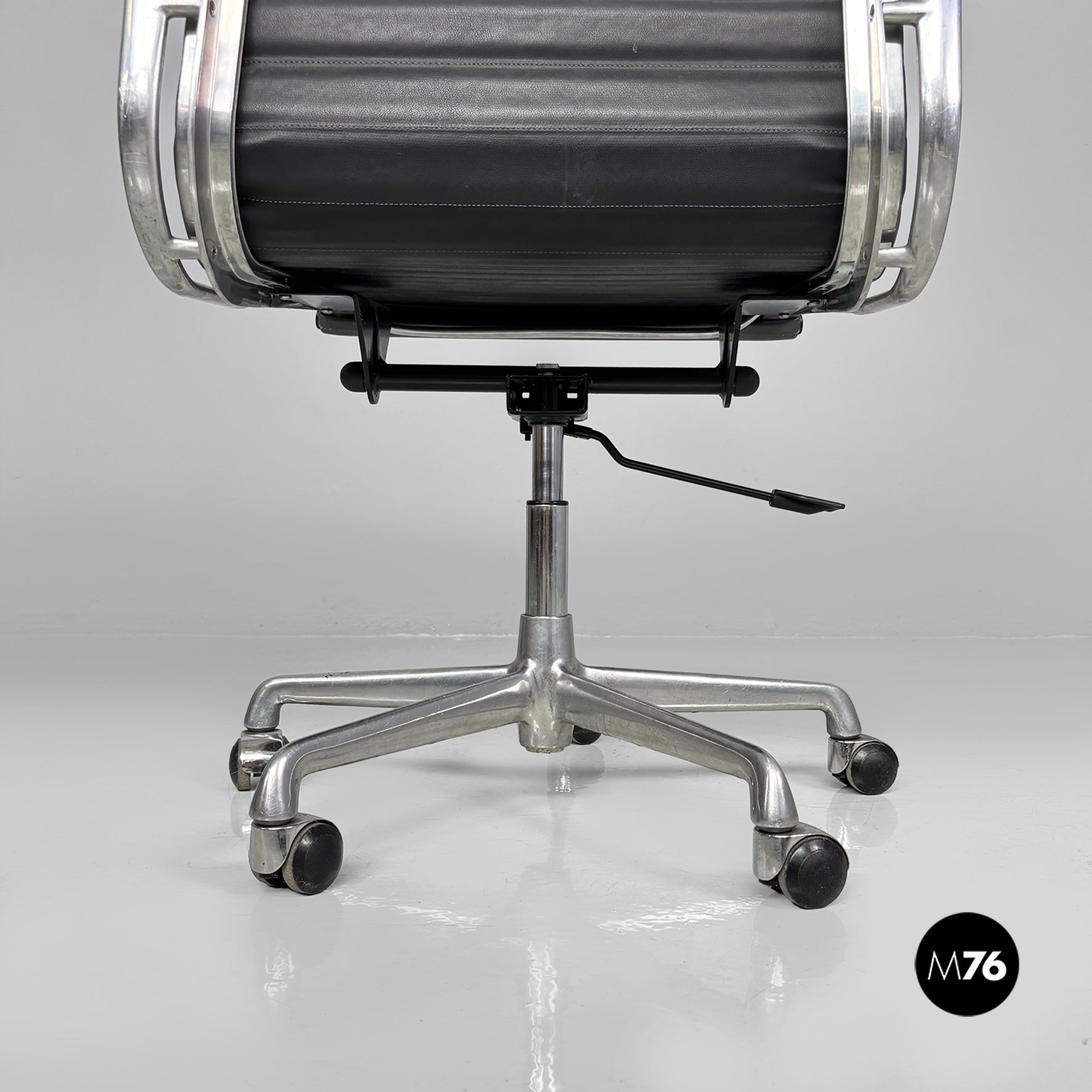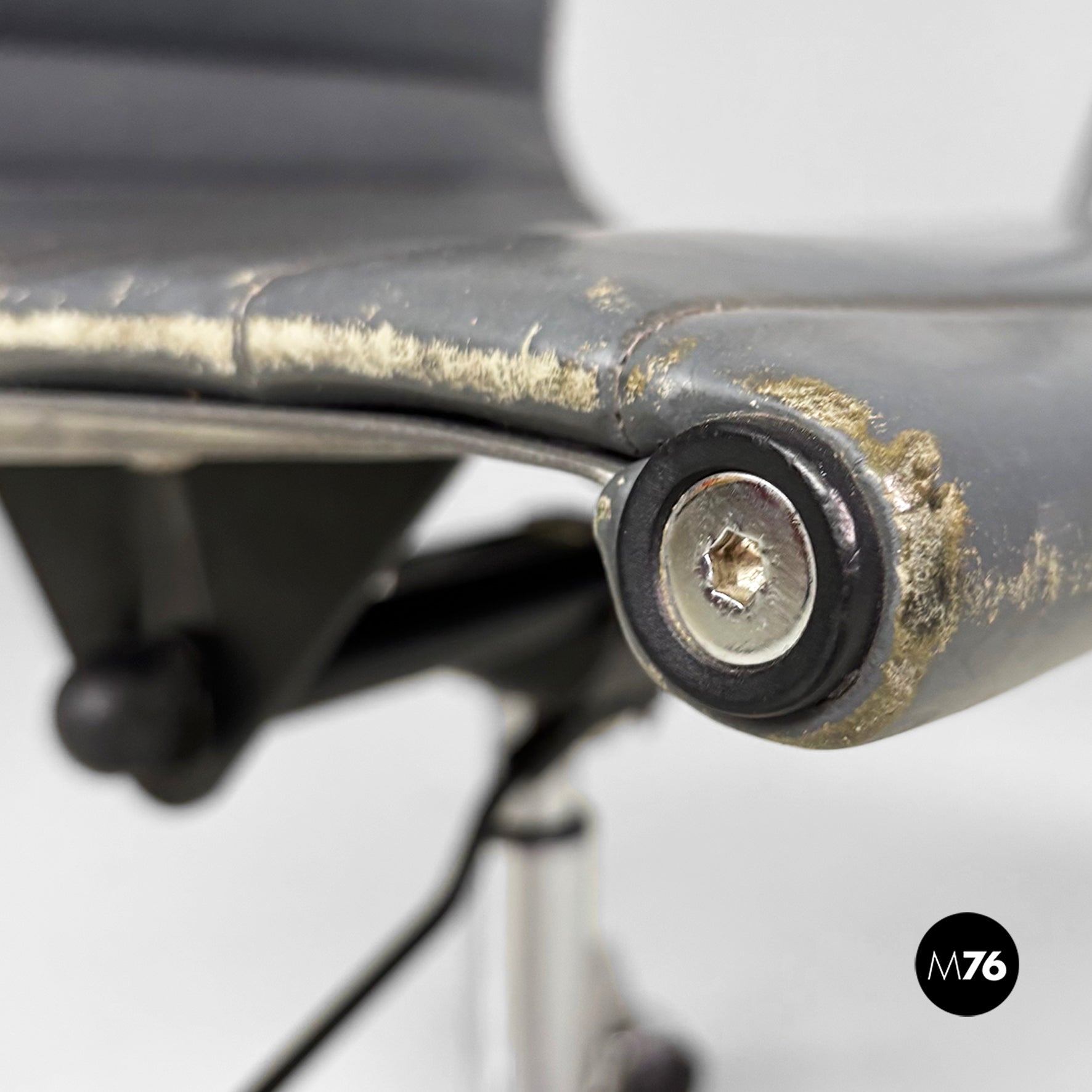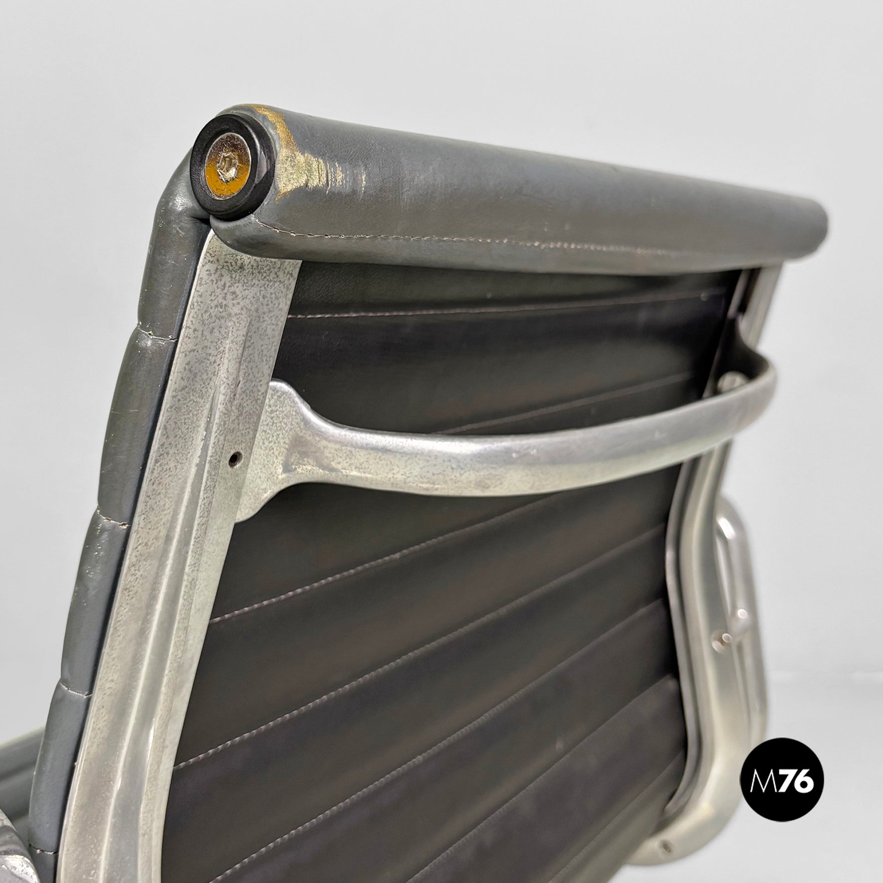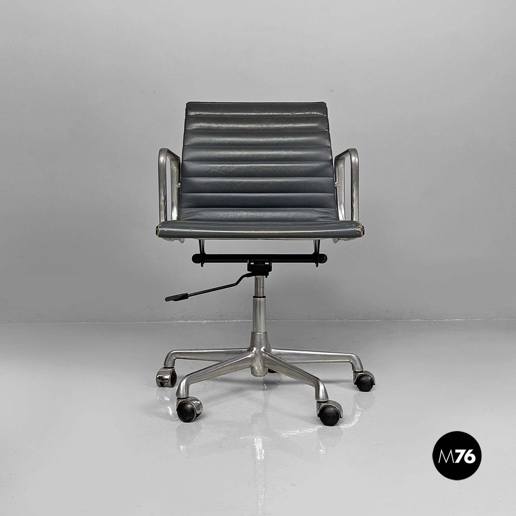 Pair of office chairs, model EA108 in metal and leather. The seat and backrest are upholstered in dark gray with horizontal stitching. The frame is made of silver-plated metal and features five spokes with rubber feet.