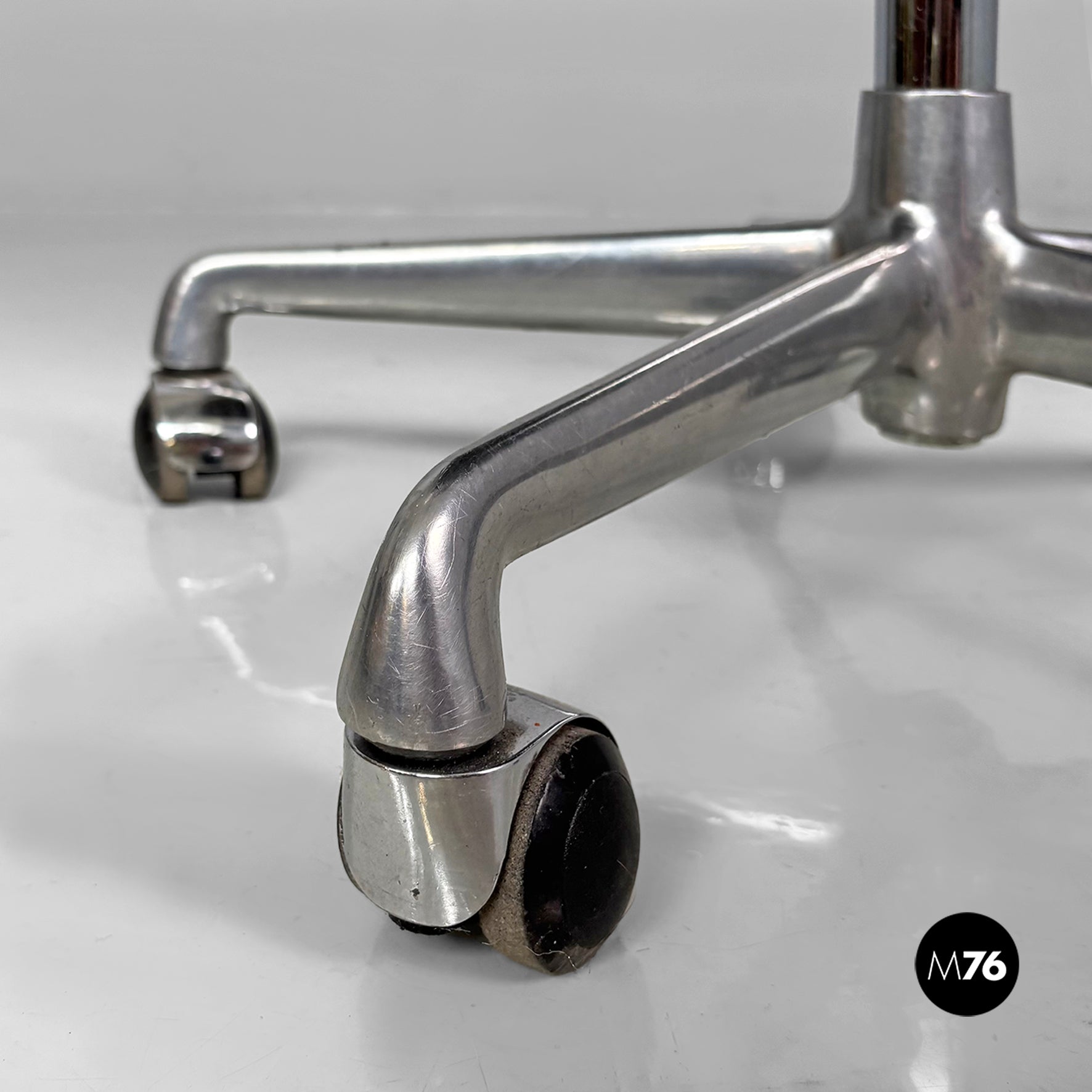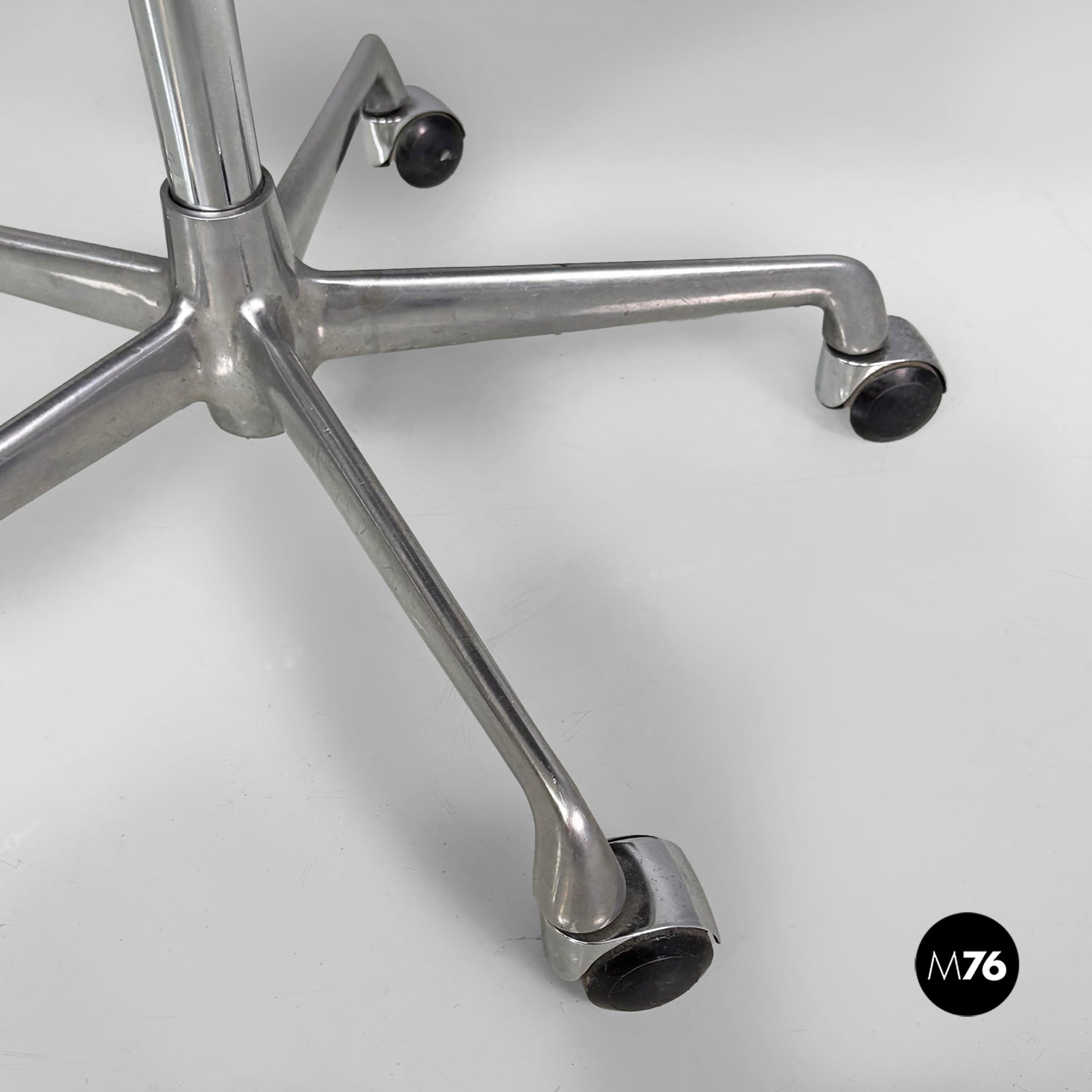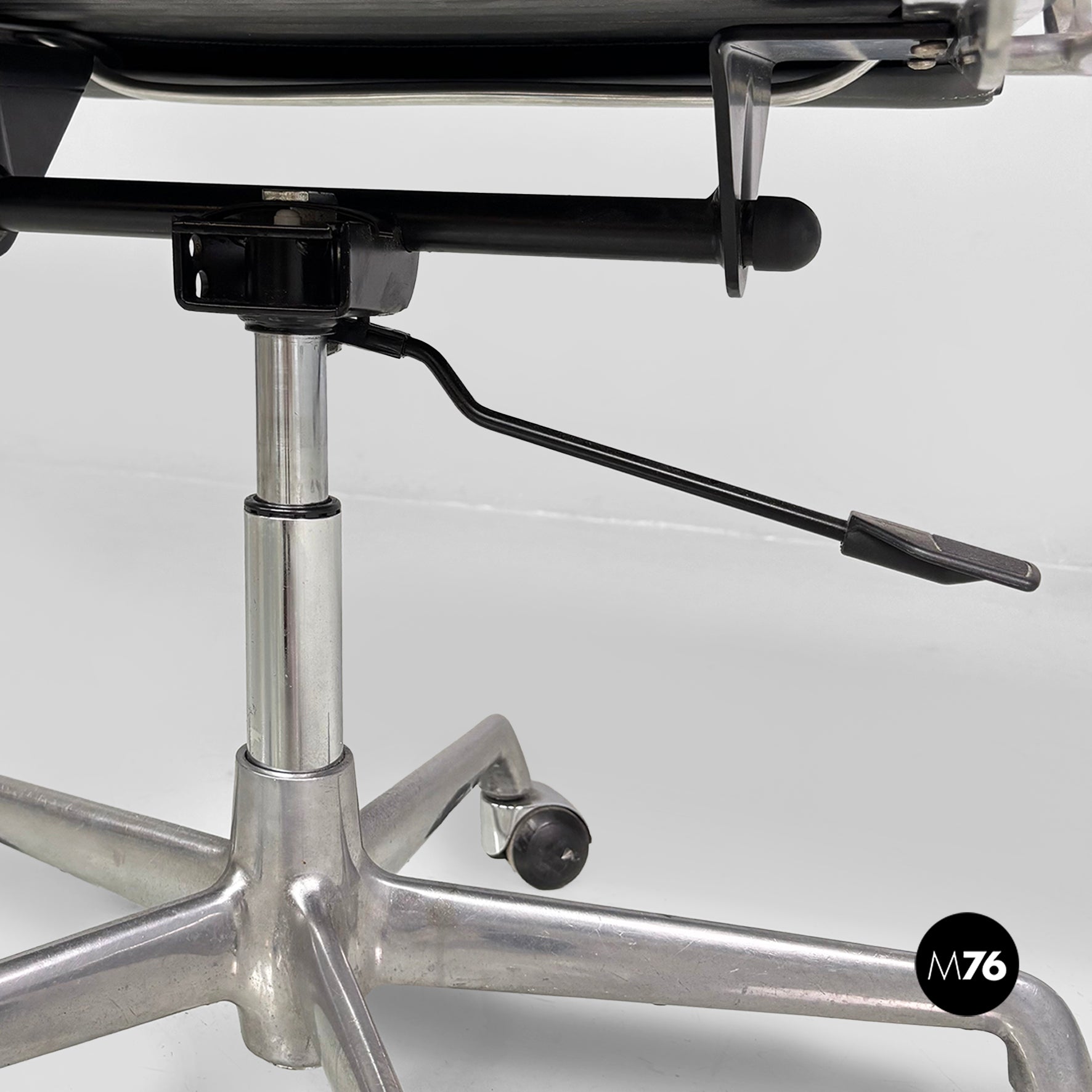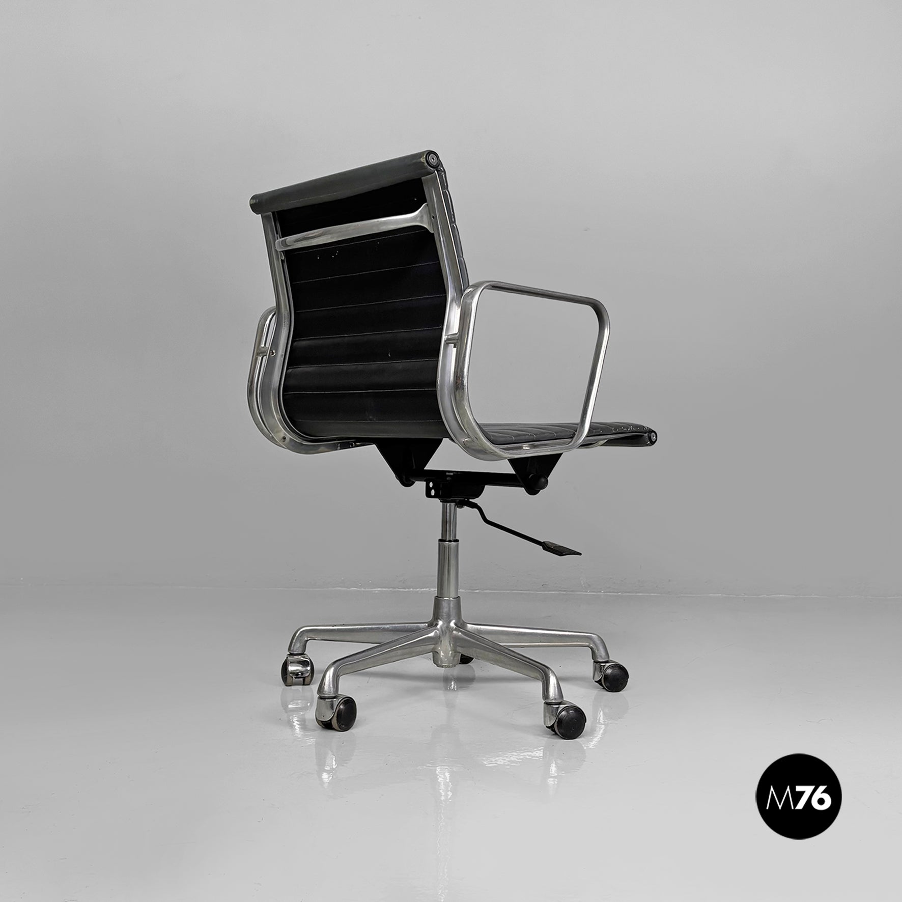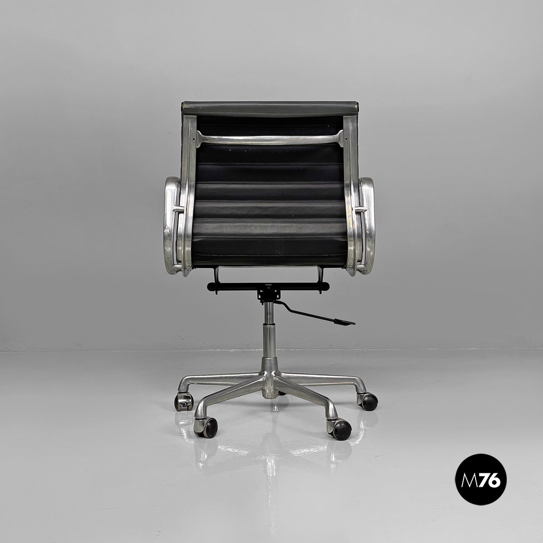 Pair of office chairs, model EA108 in metal and leather. The seat and backrest are upholstered in dark gray with horizontal stitching. The frame is made of silver-plated metal and features five spokes with rubber feet.