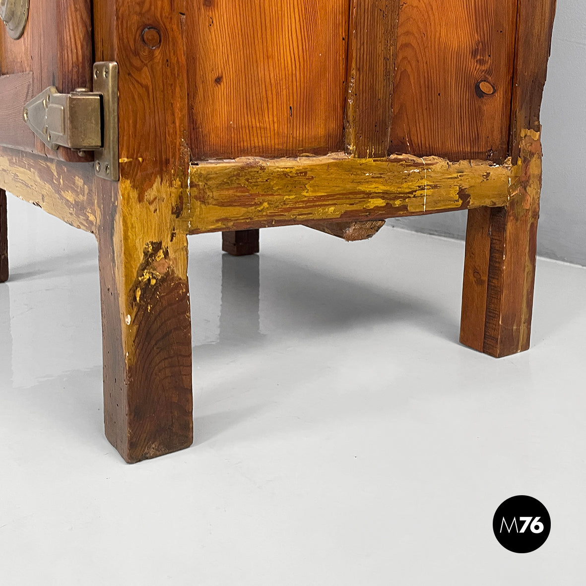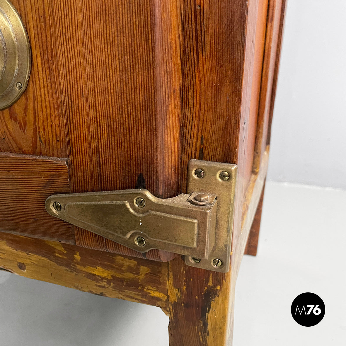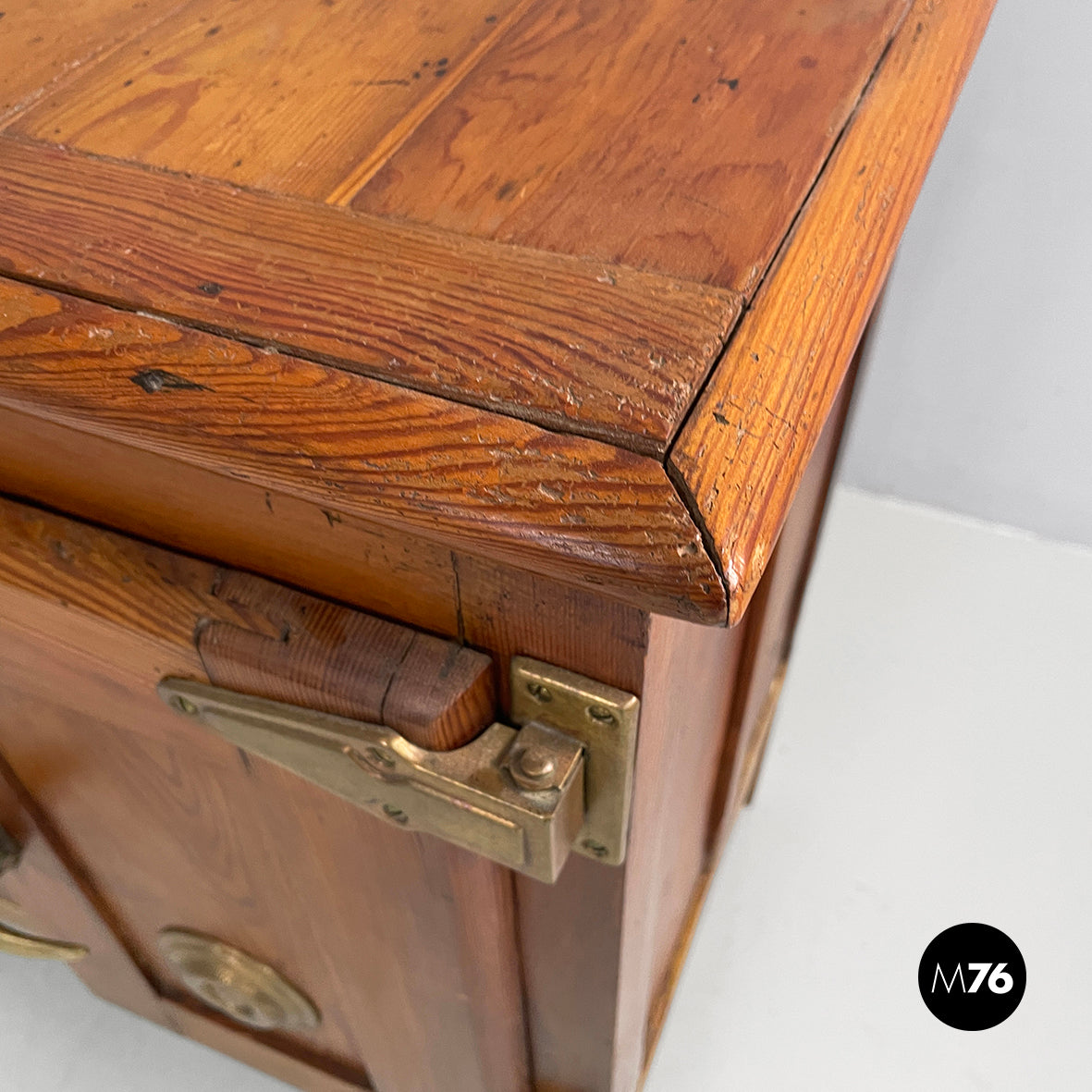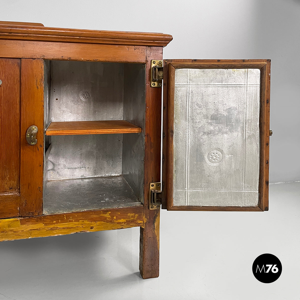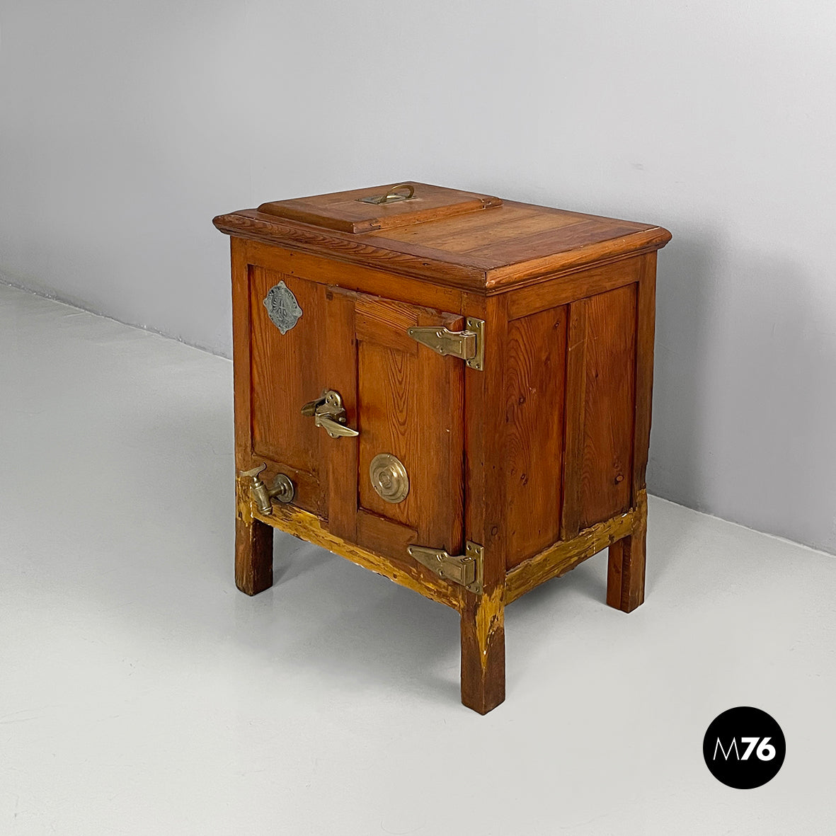Rectangular icebox in wood. The top features a zinc compartment with a brass handle. The front features a hinged door with a brass handle and hinges: inside, there is a wooden shelf. The bottom features a brass faucet. Squared feet.