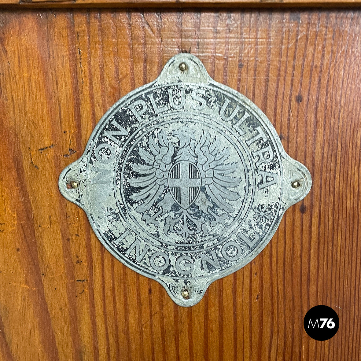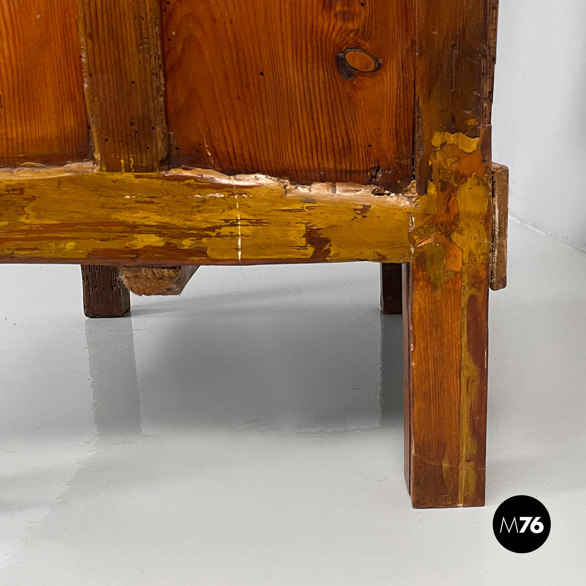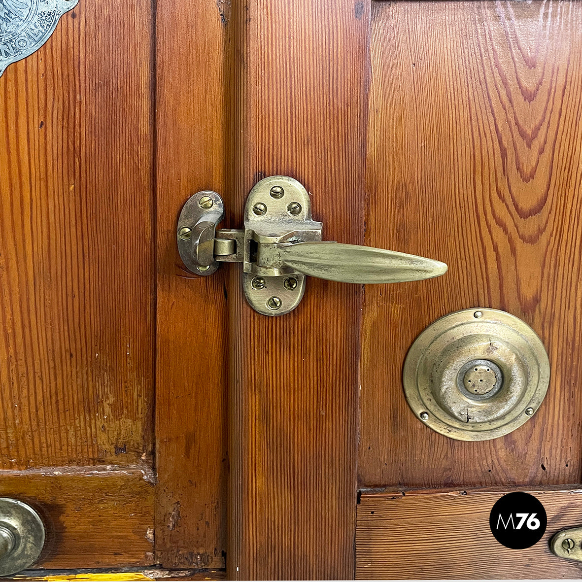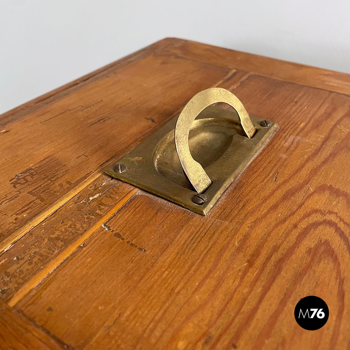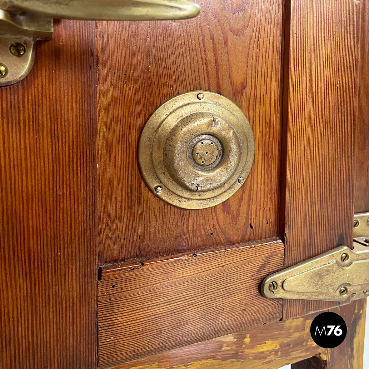 Rectangular icebox in wood. The top features a zinc compartment with a brass handle. The front features a hinged door with a brass handle and hinges: inside, there is a wooden shelf. The bottom features a brass faucet. Squared feet.