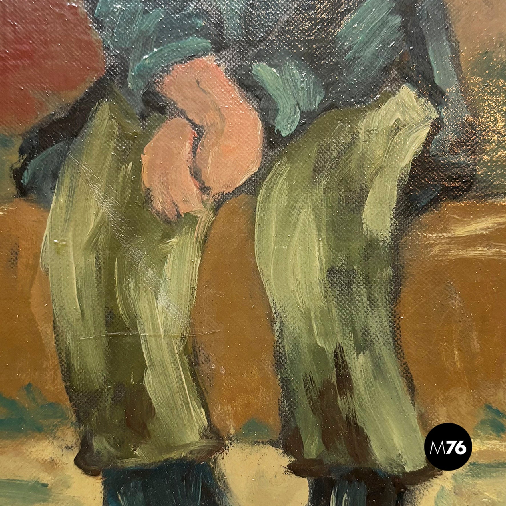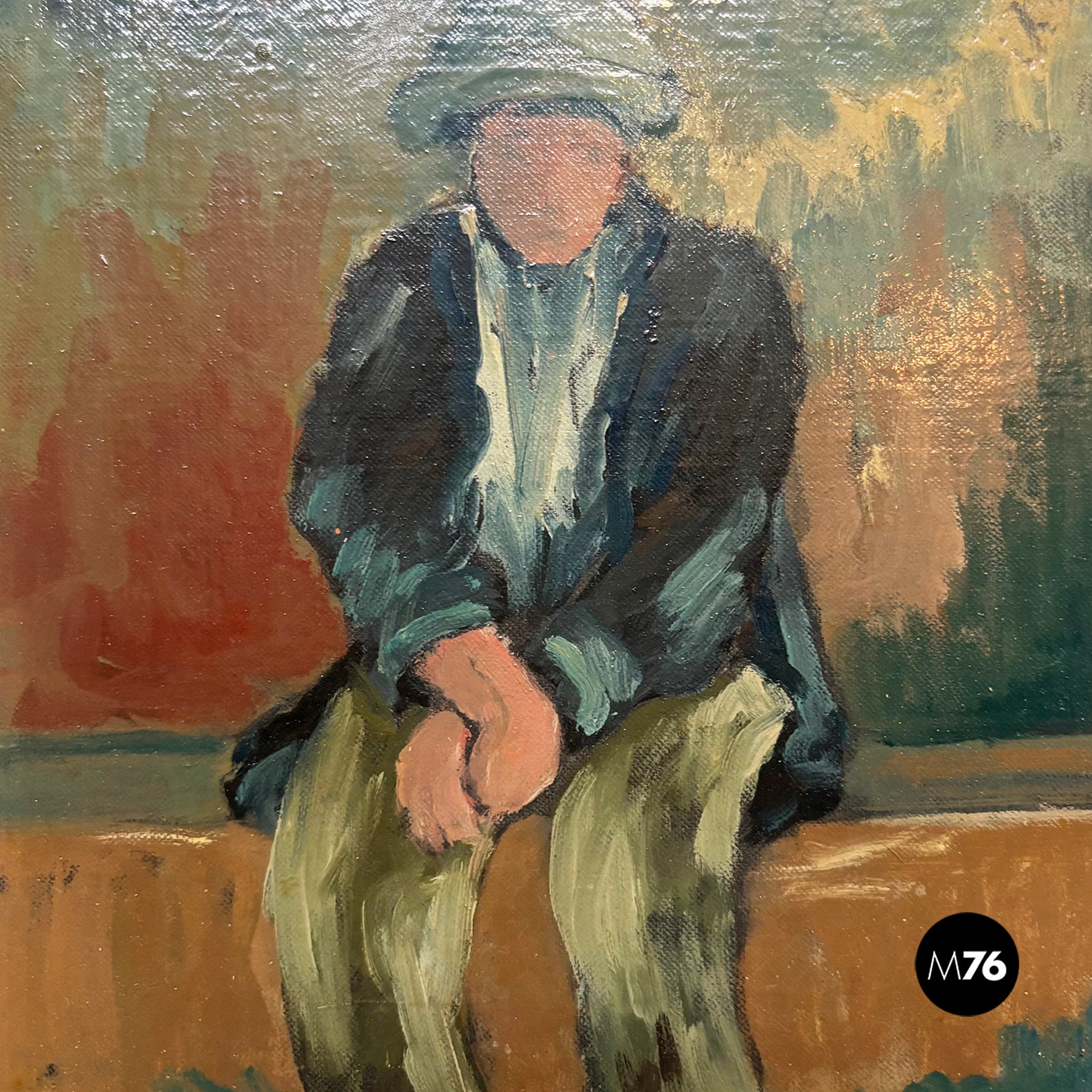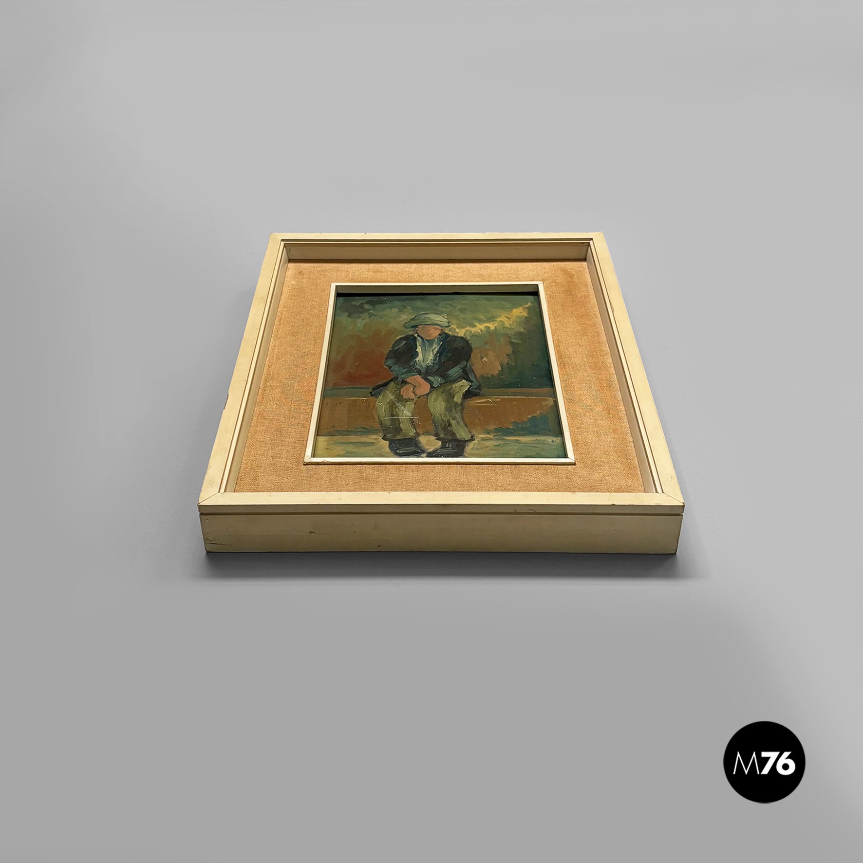 Oil painting on canvas titled Malinconia, depicting a seated man. The predominant colors are blue, brown and green. Brown fabric mount board and frame in beige wood.