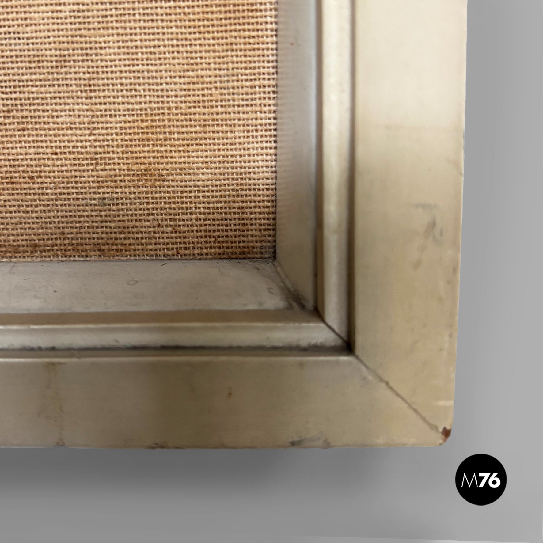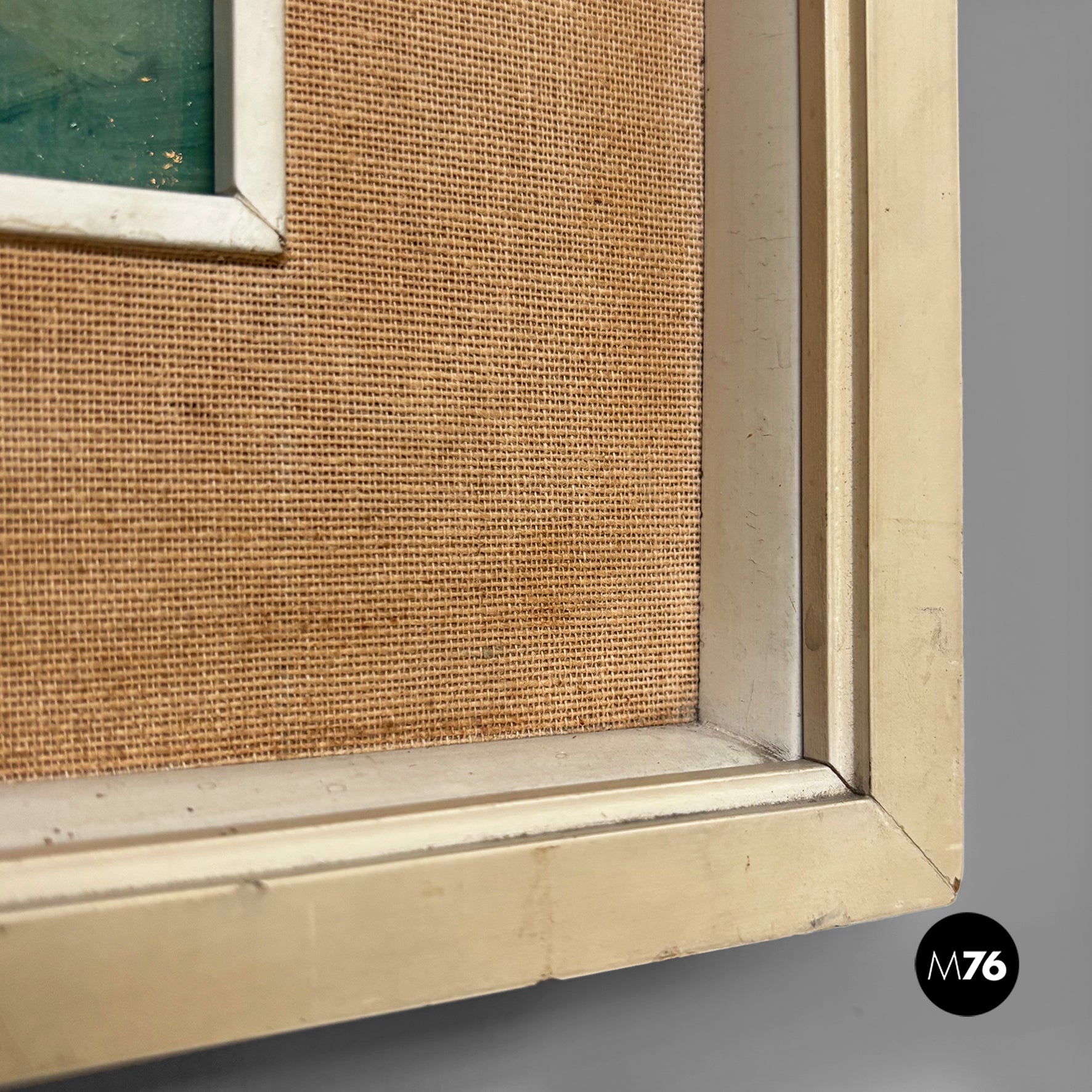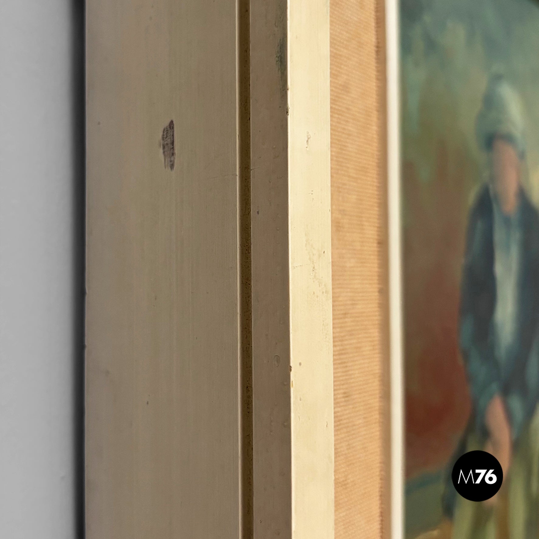 Oil painting on canvas titled Malinconia, depicting a seated man. The predominant colors are blue, brown and green. Brown fabric mount board and frame in beige wood.