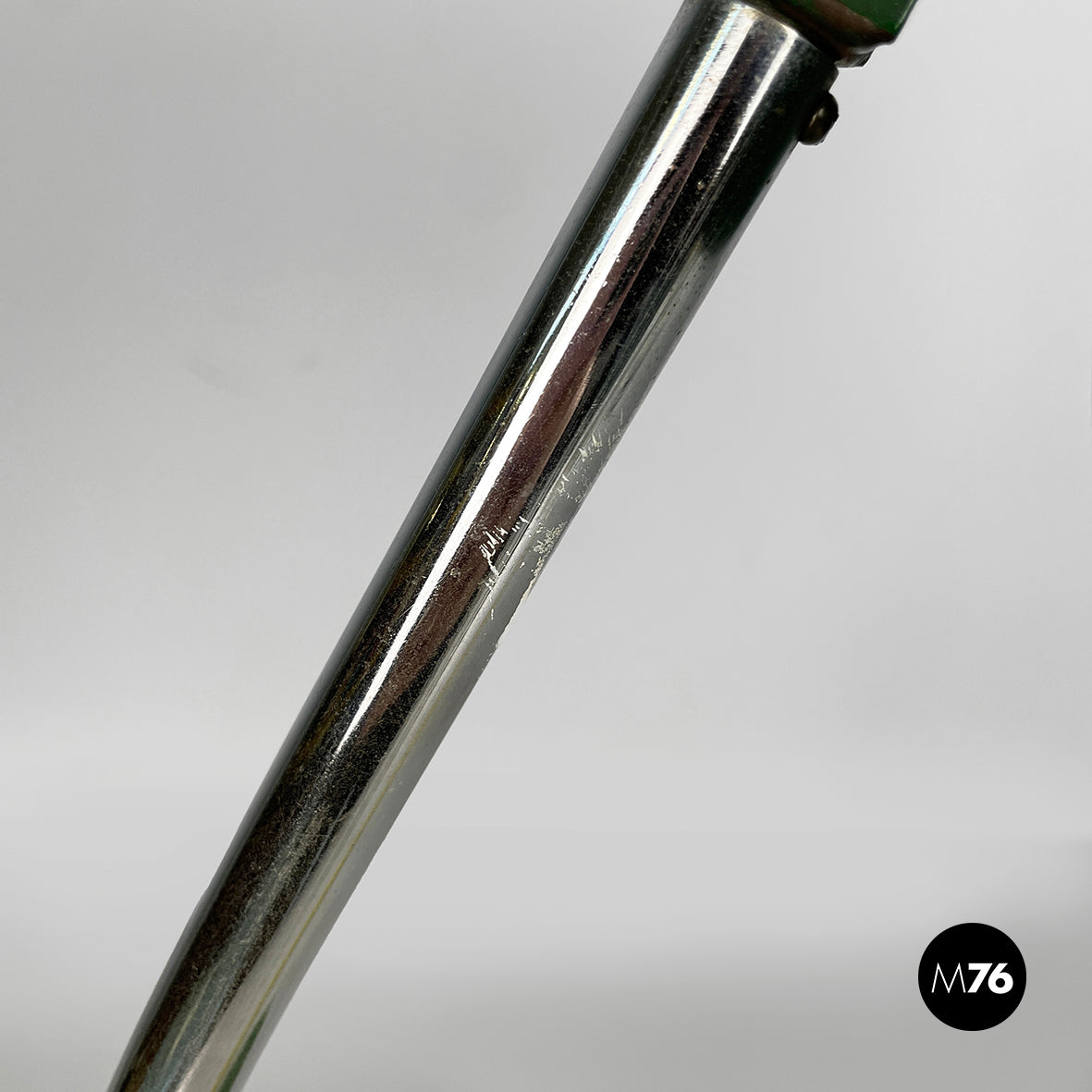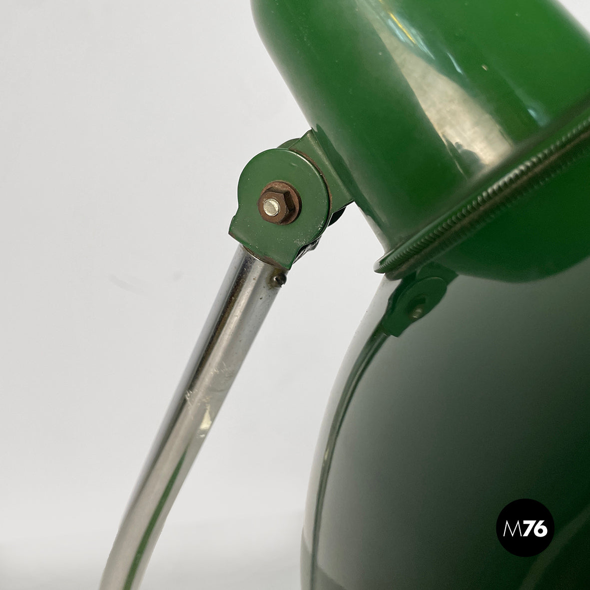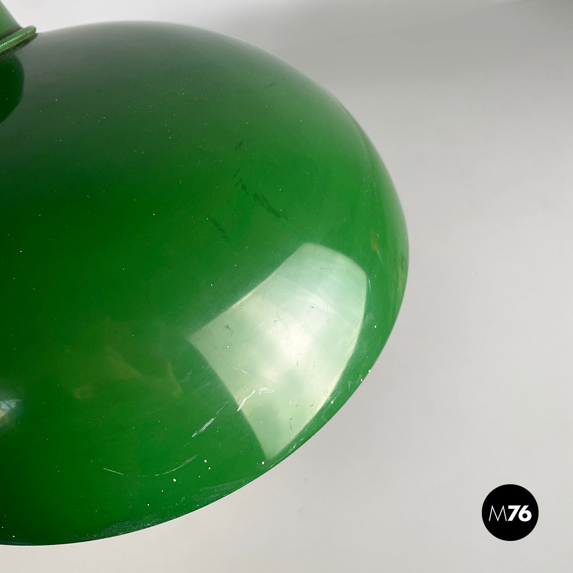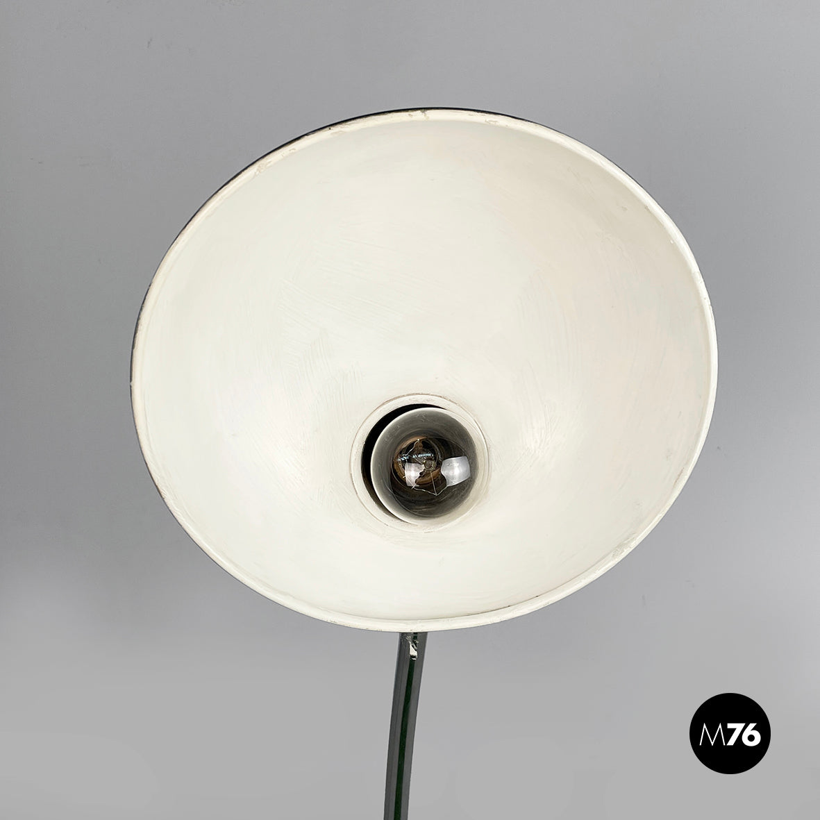 Table lamp with adjustable lampshade in metal painted green on the outside and white on the inside. The metal rod structure is also adjustable. Rounded base in green painted metal. White switch on the base.
