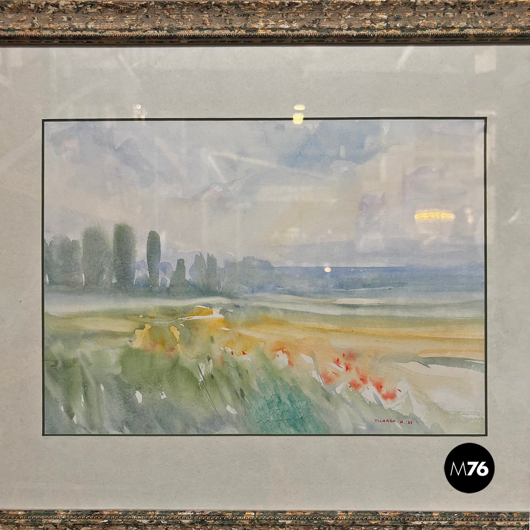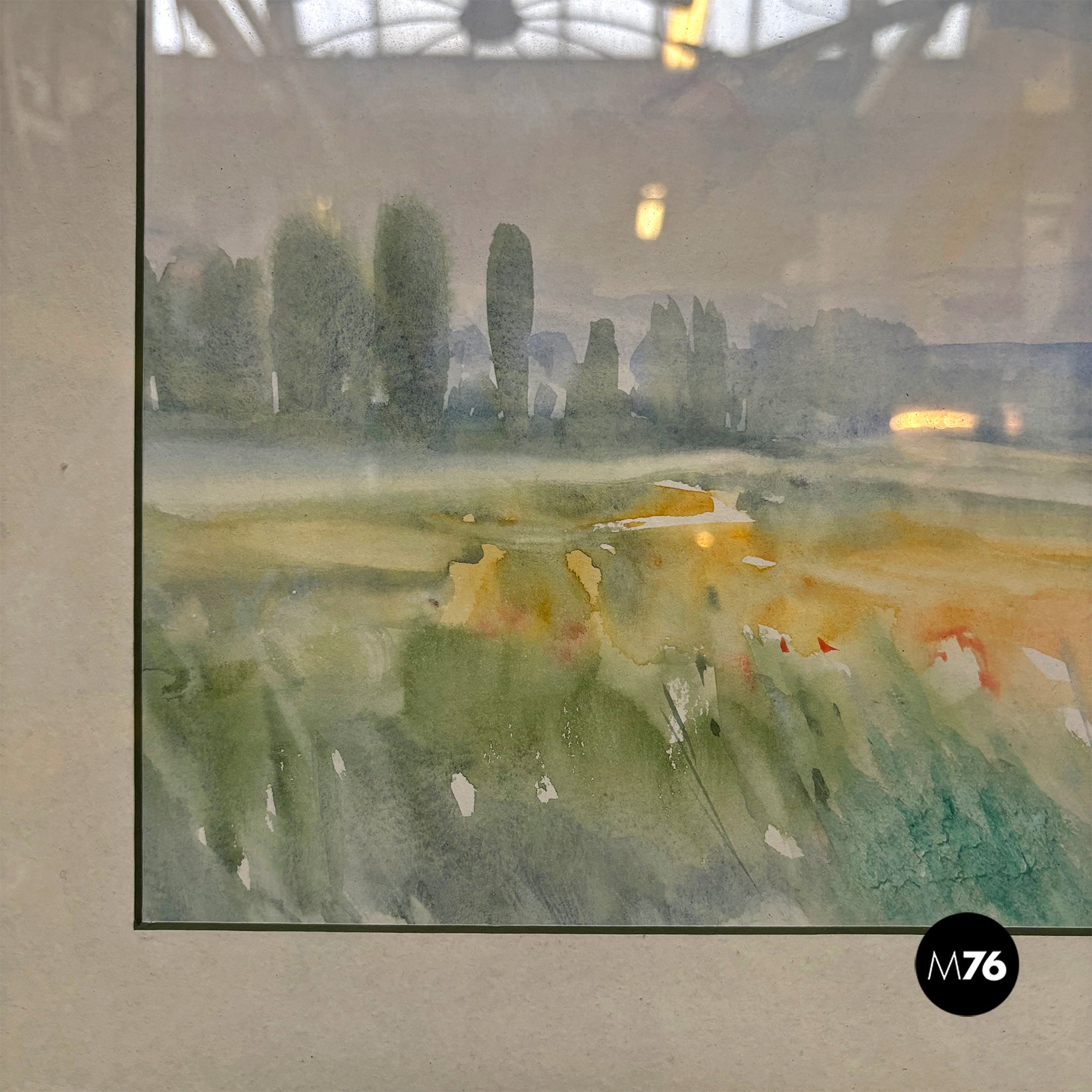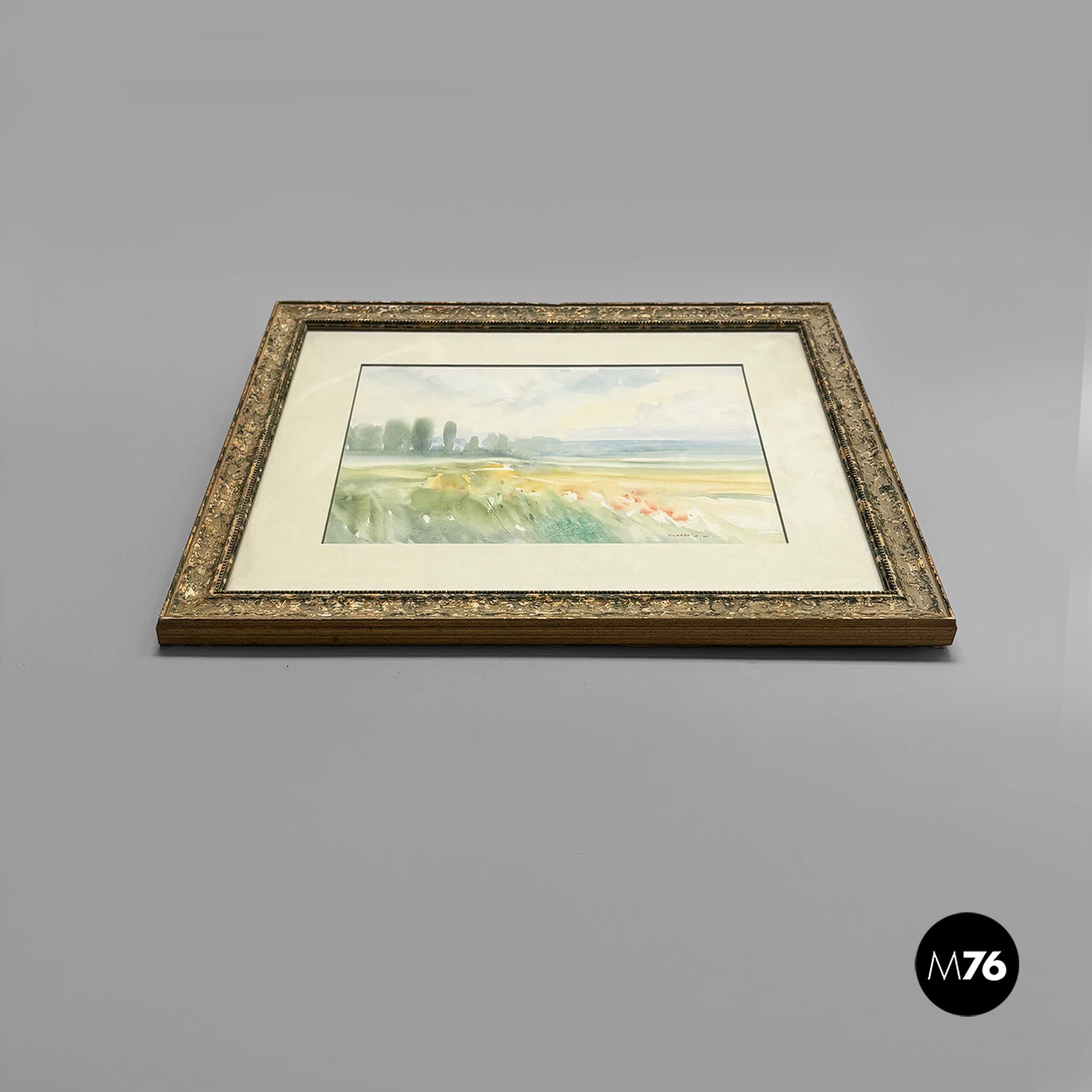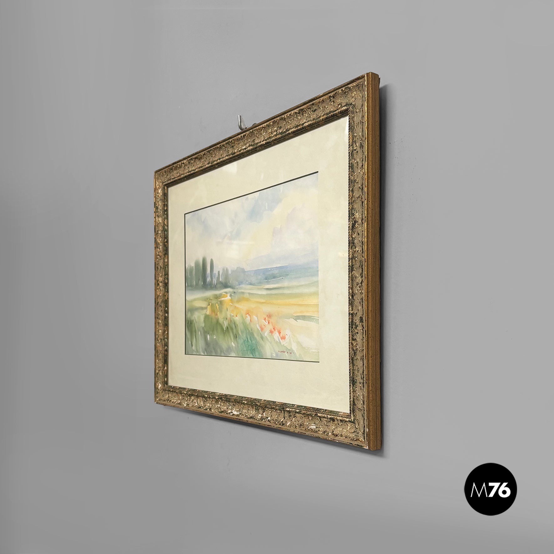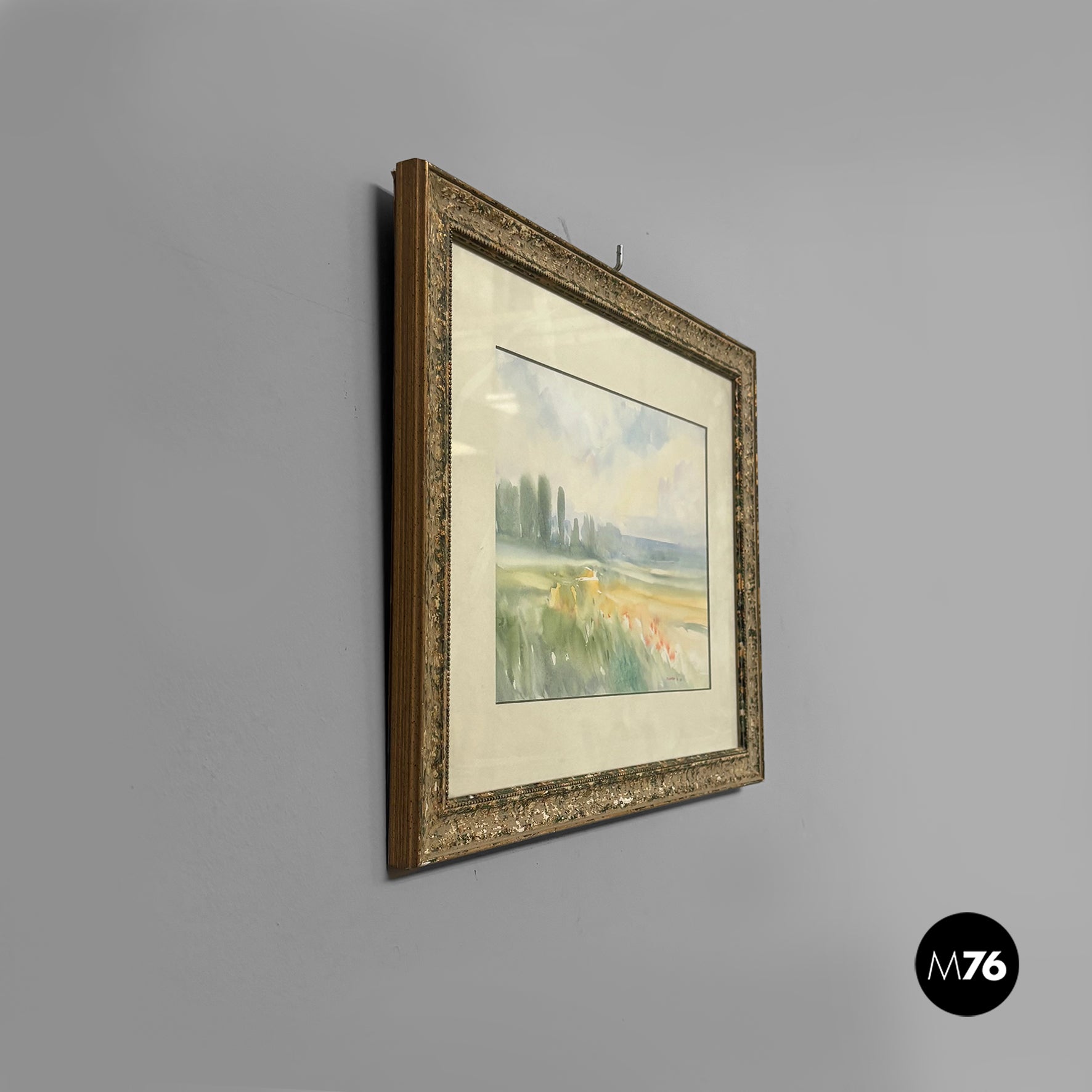 Watercolor painting on paper, depicting a countryside landscape with green trees and a blue sky. White paper mount board, frame in wood with golden and green finish and glass.