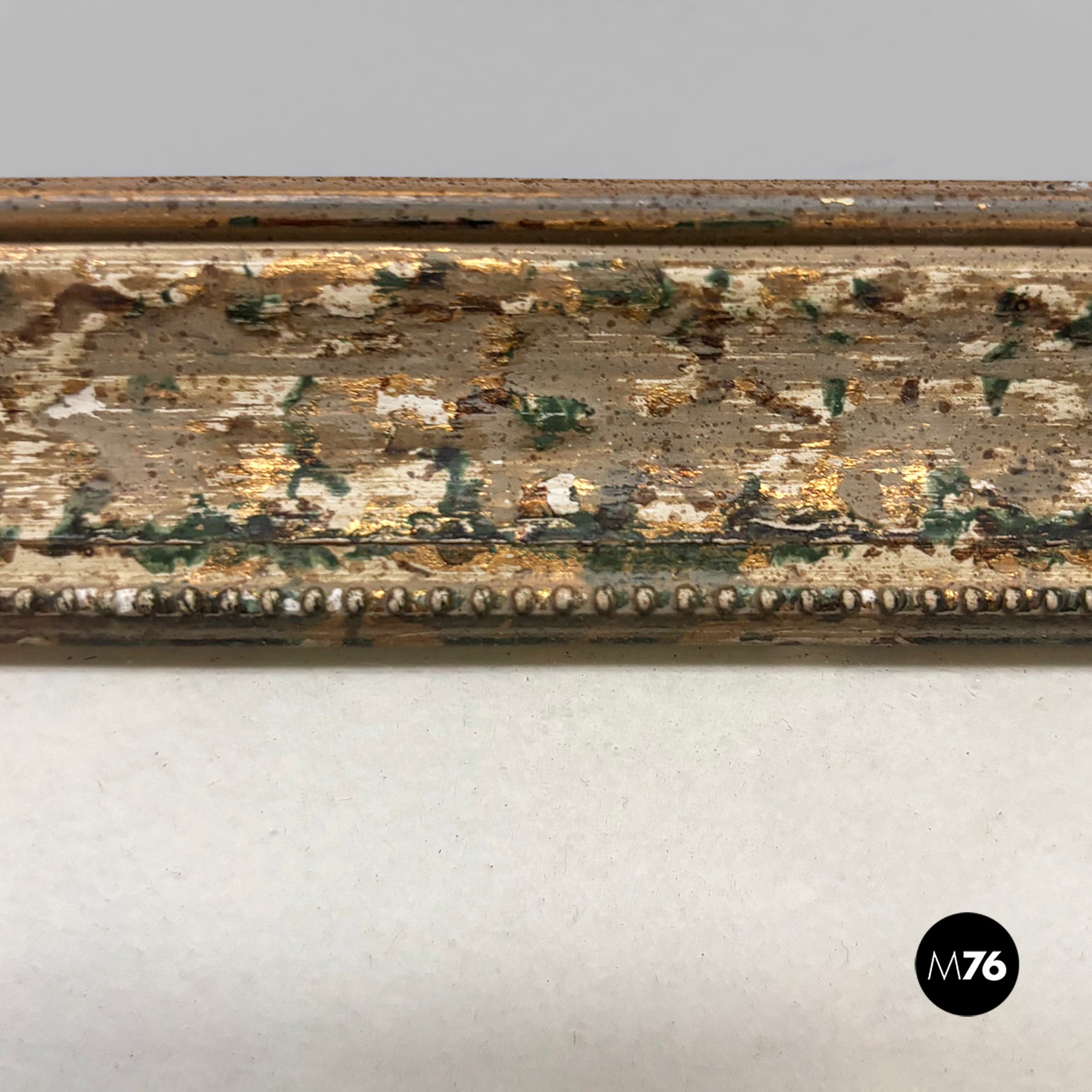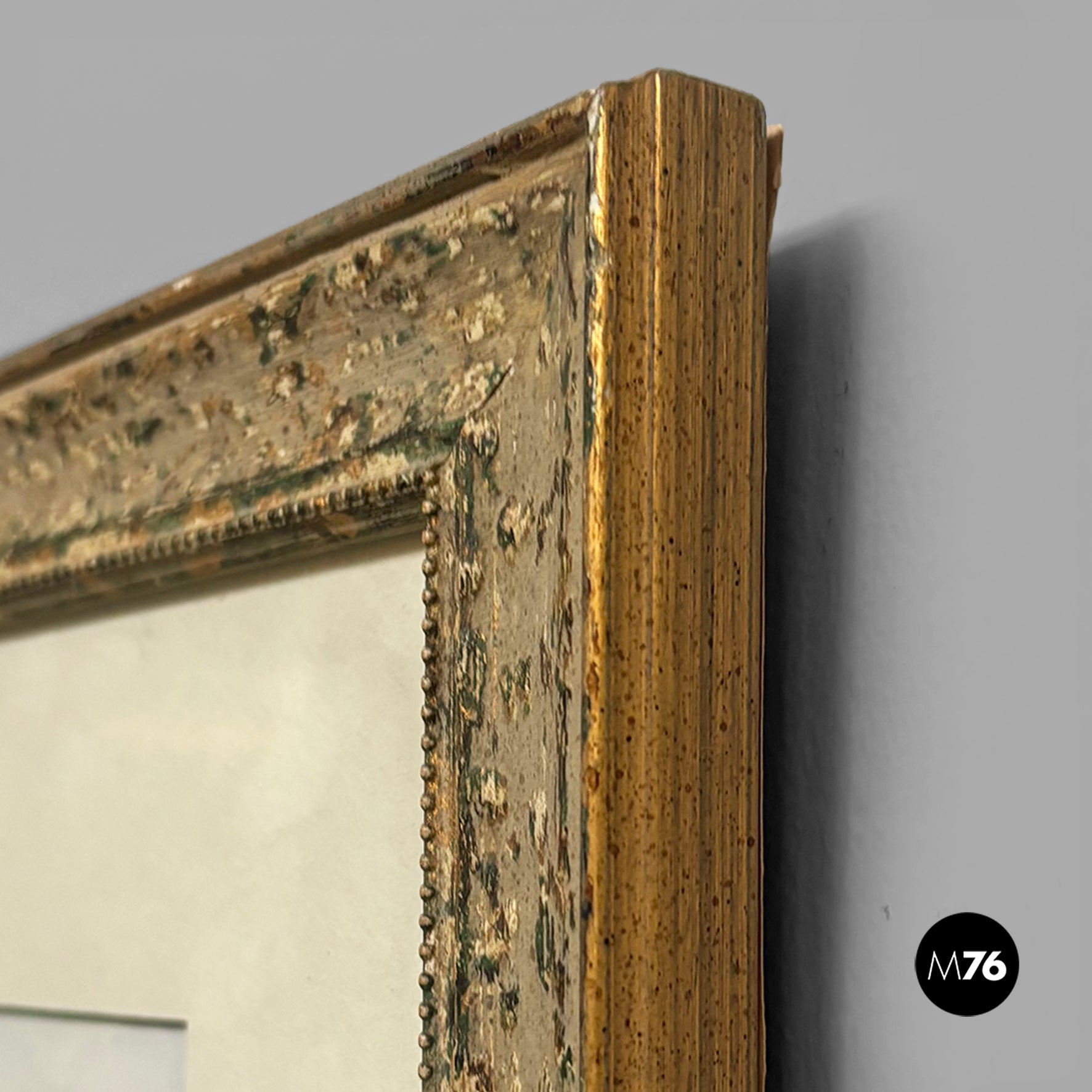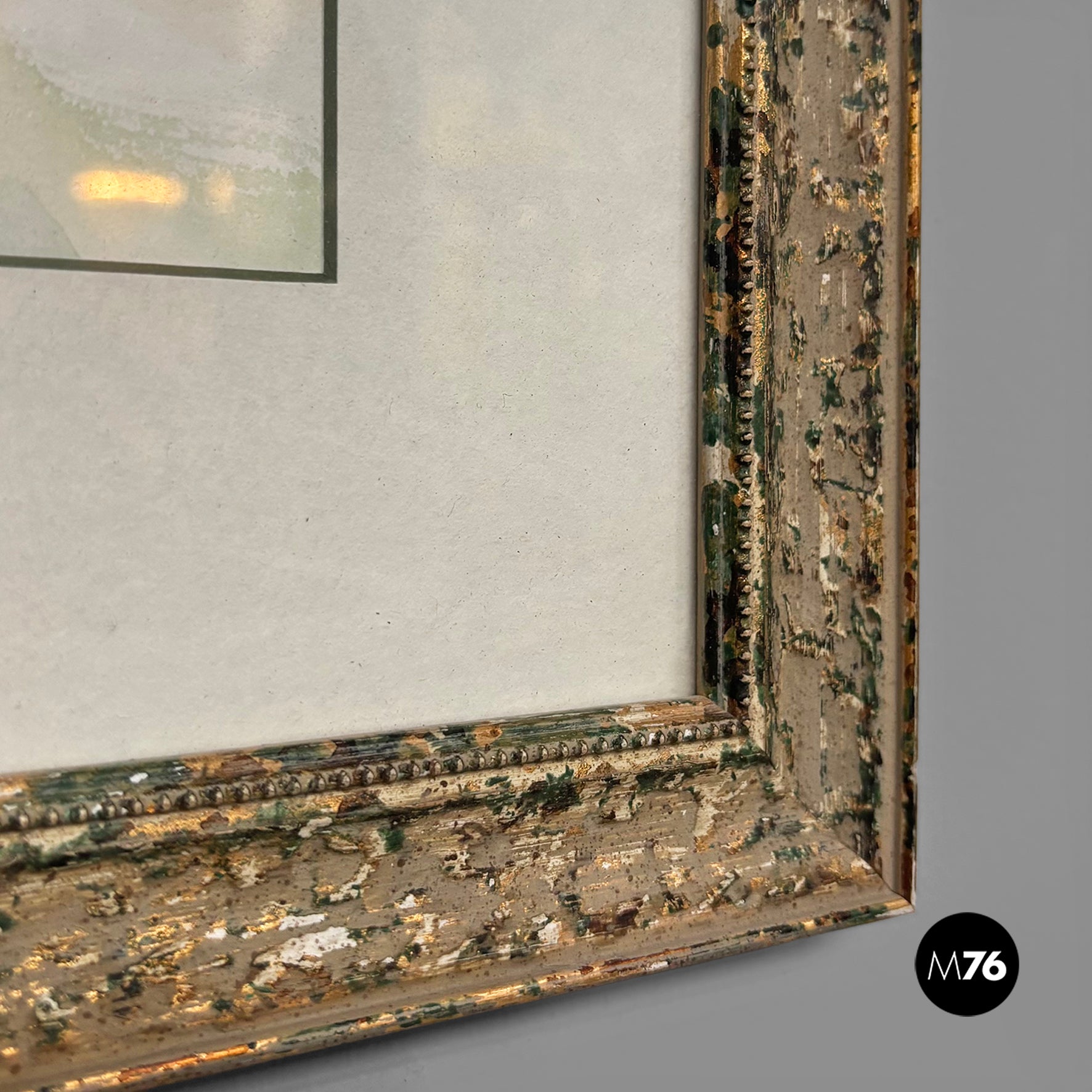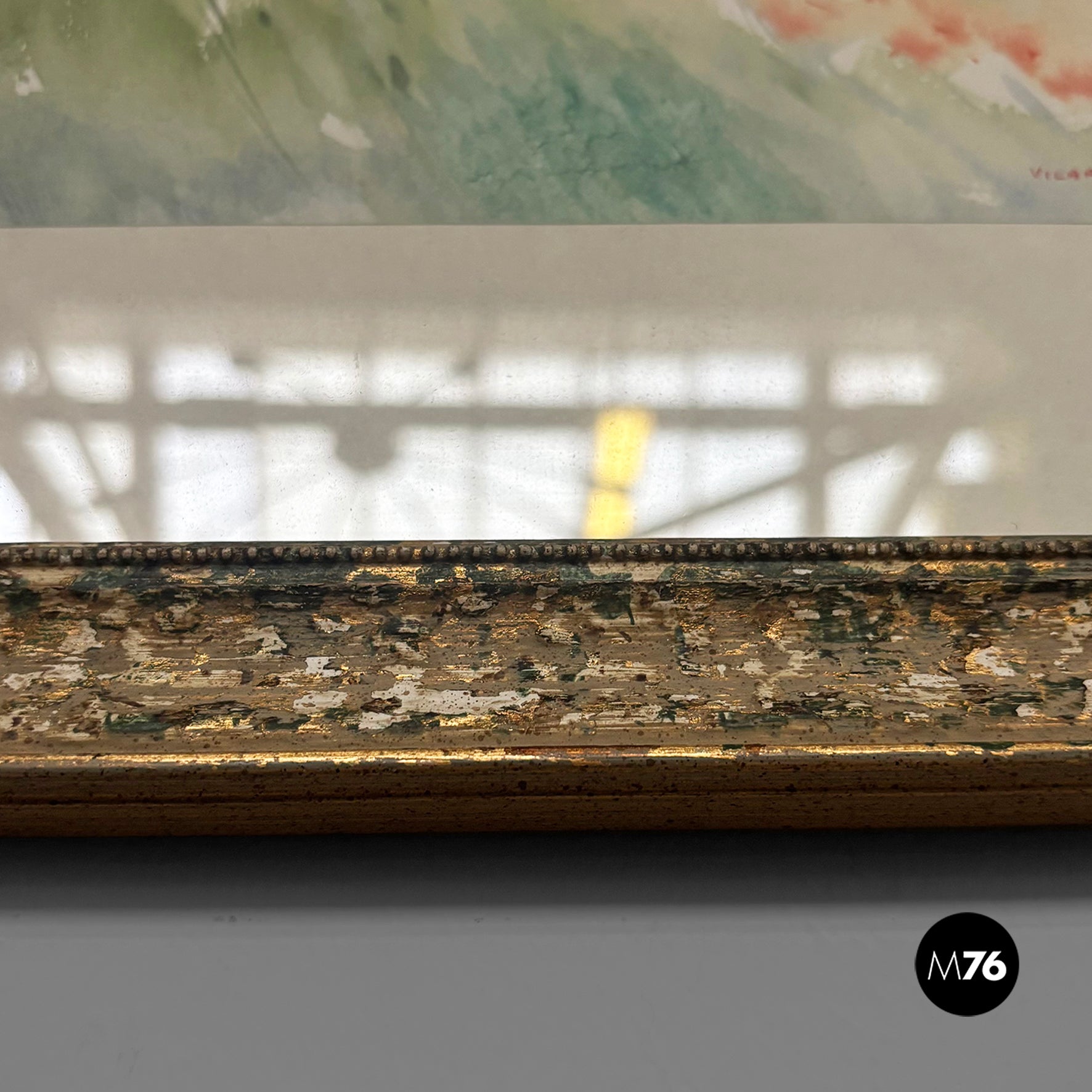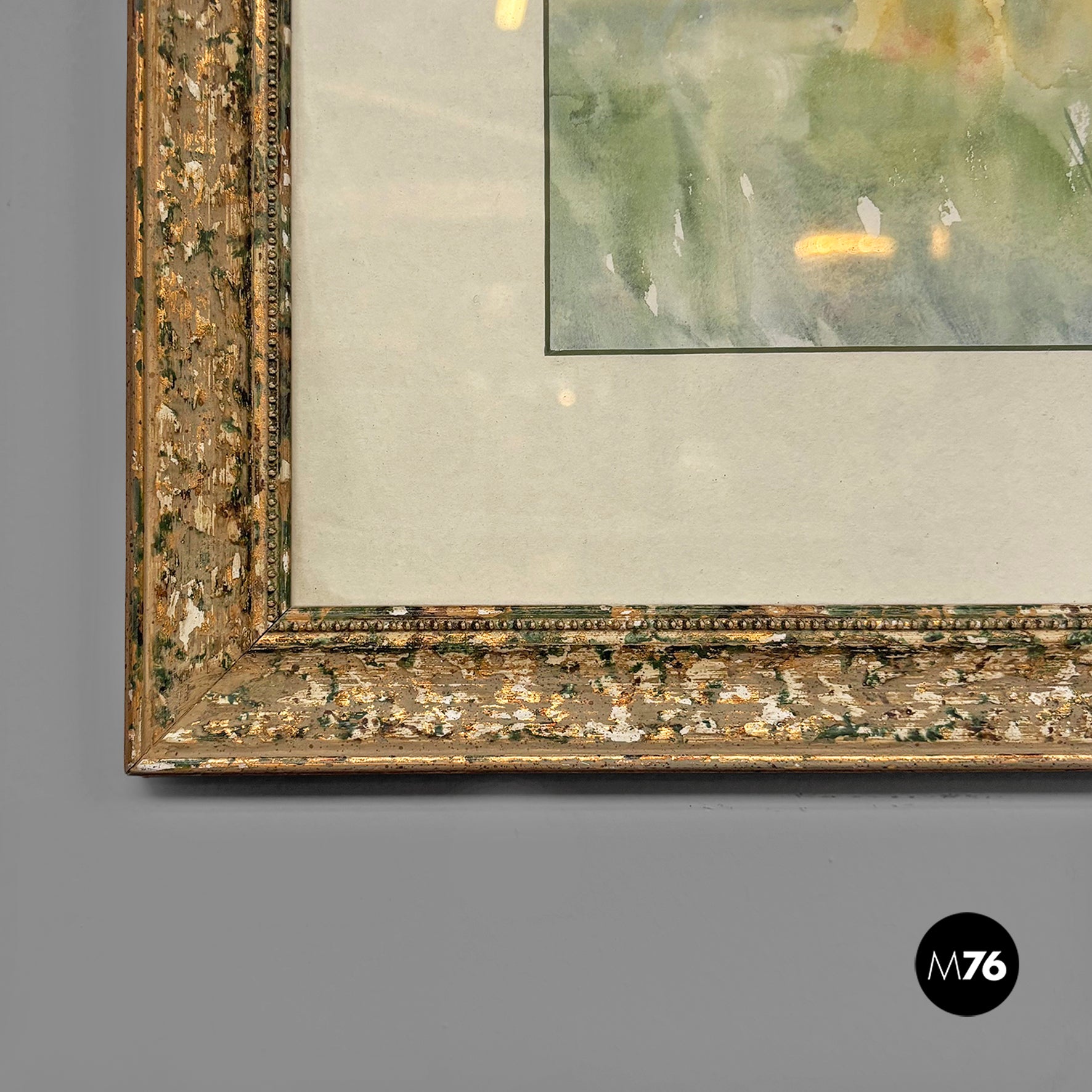 Watercolor painting on paper, depicting a countryside landscape with green trees and a blue sky. White paper mount board, frame in wood with golden and green finish and glass.