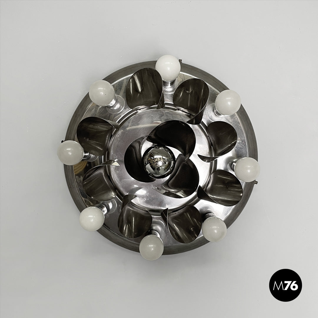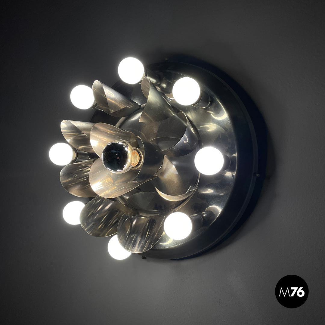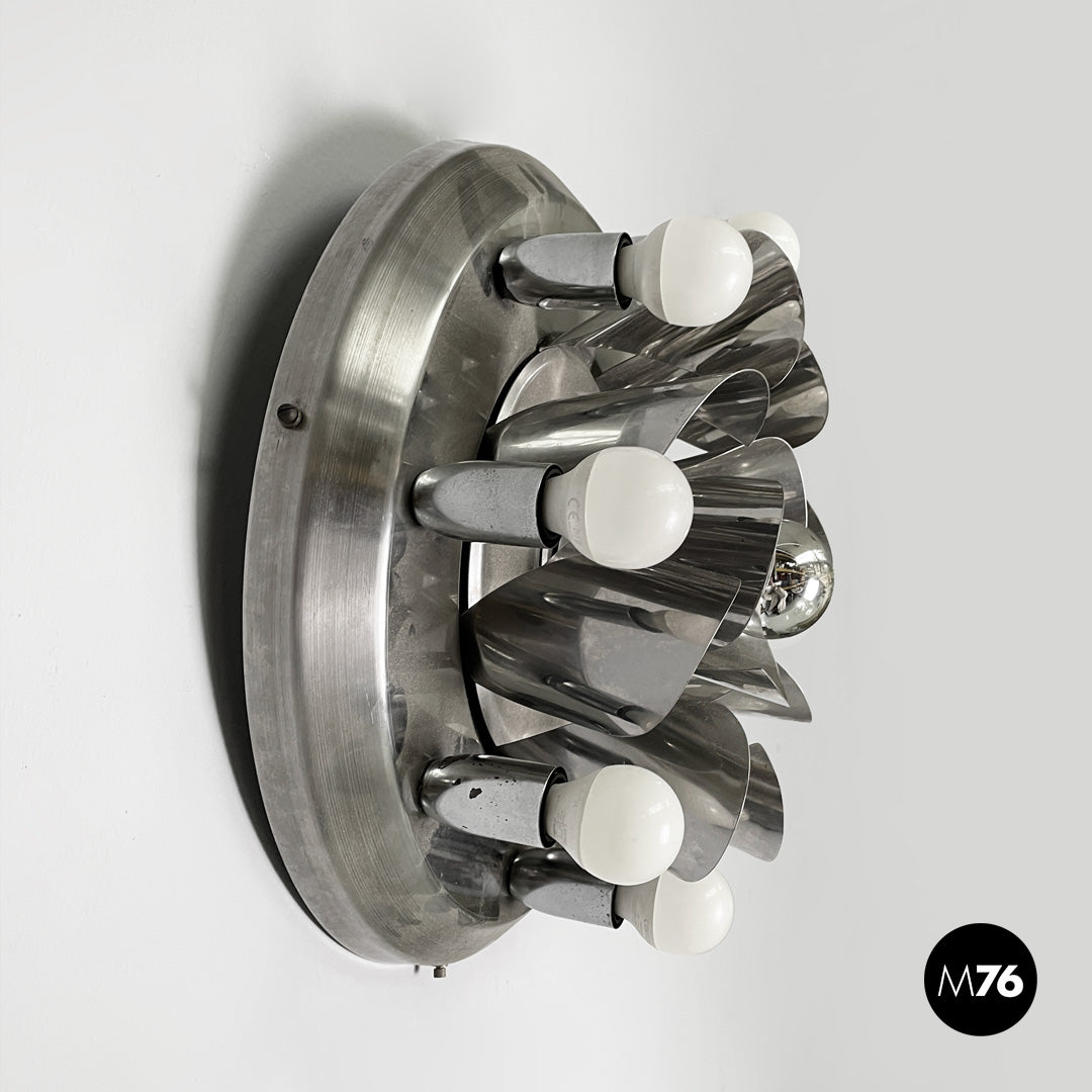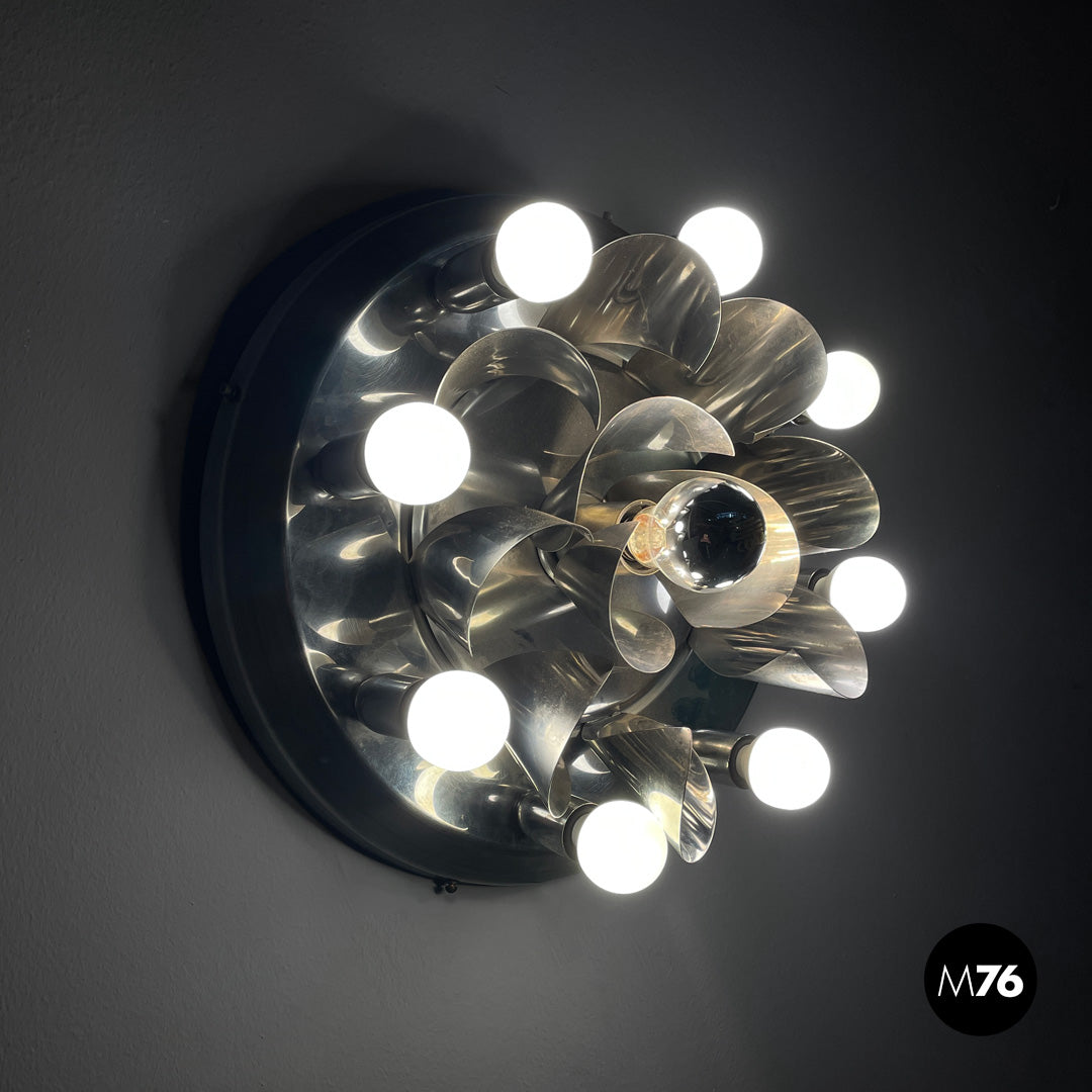 Chrome-plated steel wall light. The round metal frame features a composition of curved fins that form a flower-like shape around the central bulb. Eight lamp holders, each with an opal globe bulb, surround the main body. Can be used as a ceiling light.