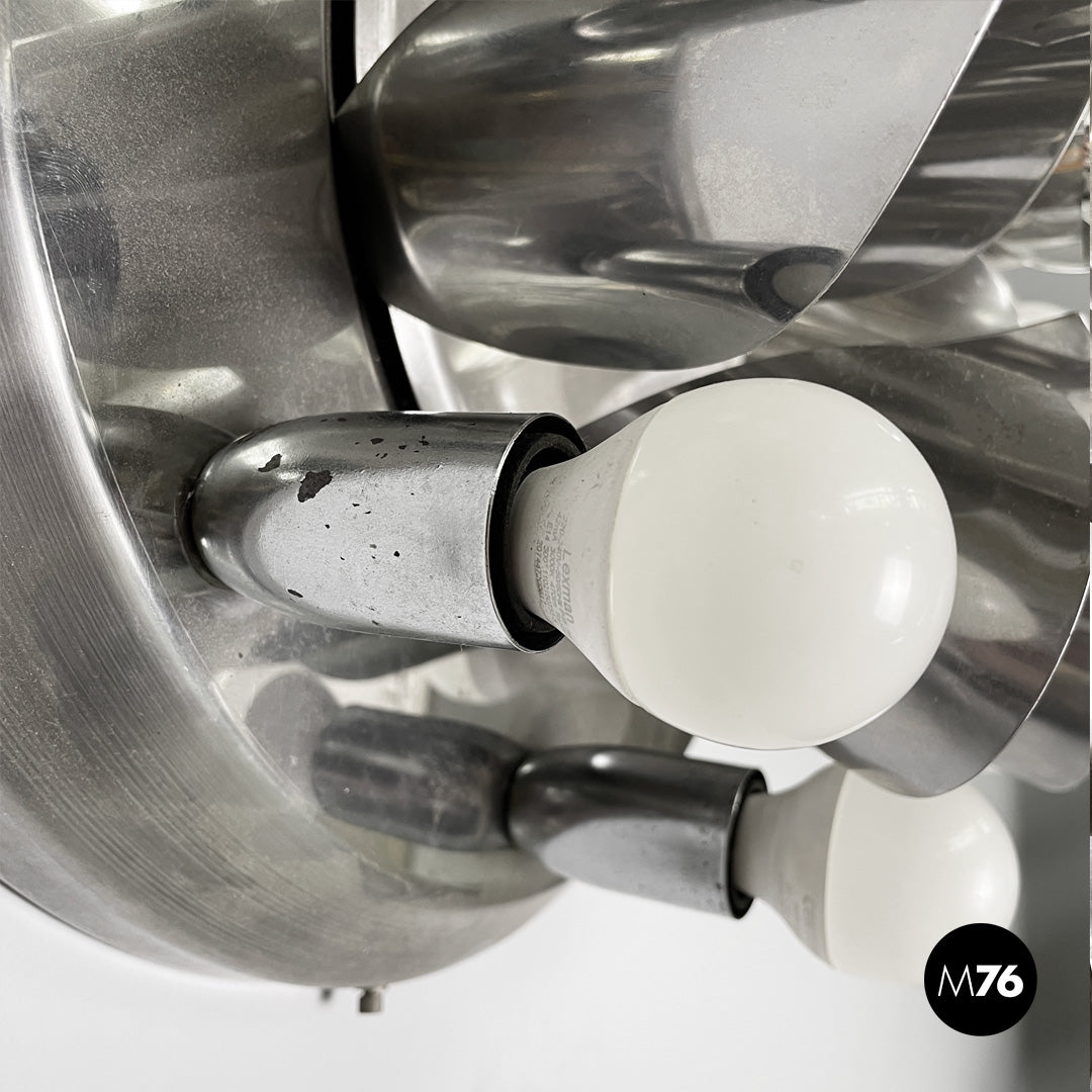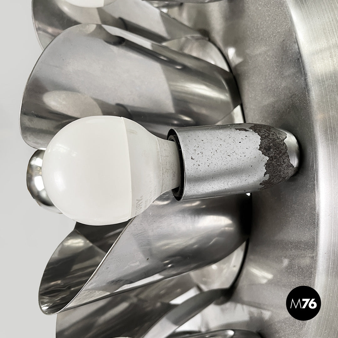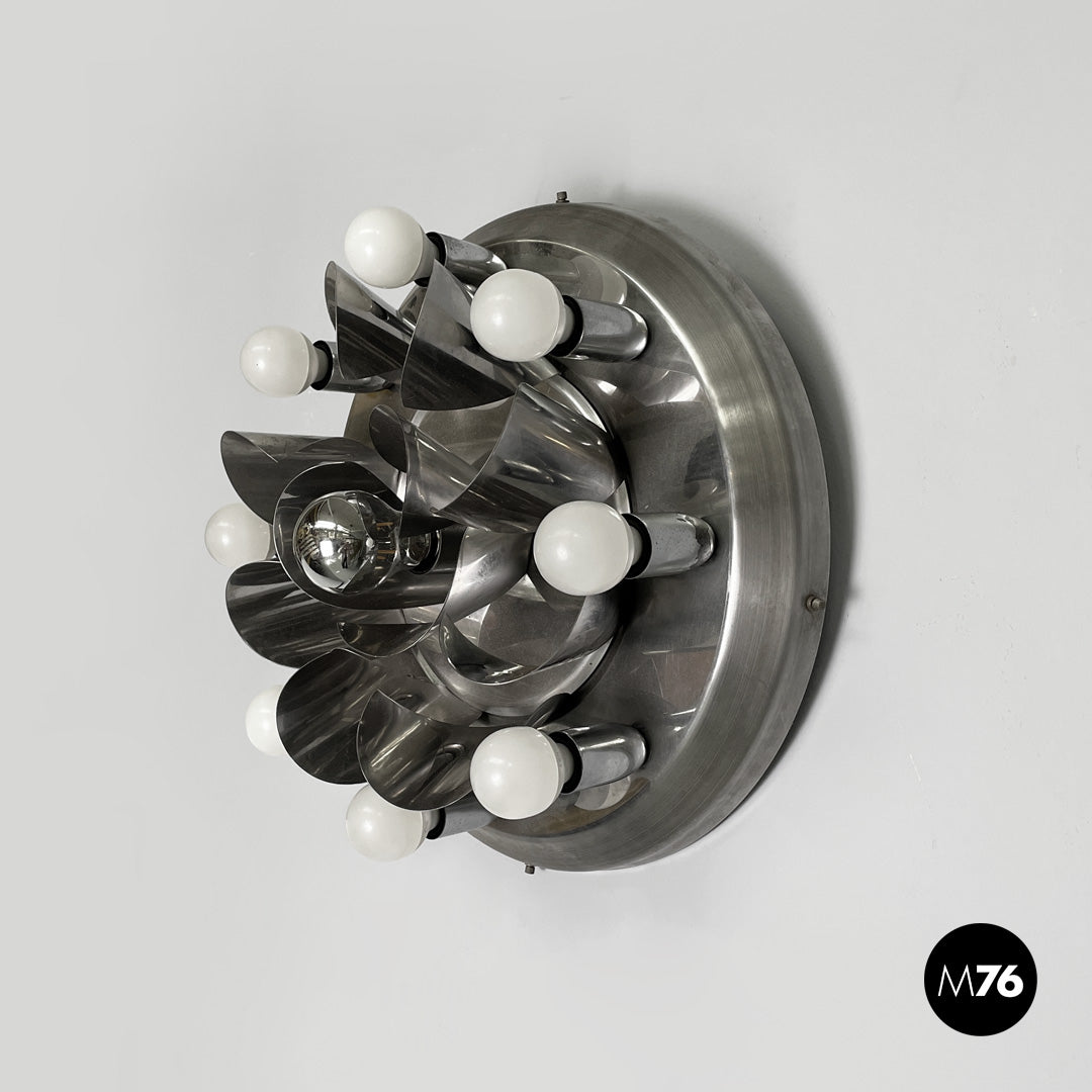 Chrome-plated steel wall light. The round metal frame features a composition of curved fins that form a flower-like shape around the central bulb. Eight lamp holders, each with an opal globe bulb, surround the main body. Can be used as a ceiling light.