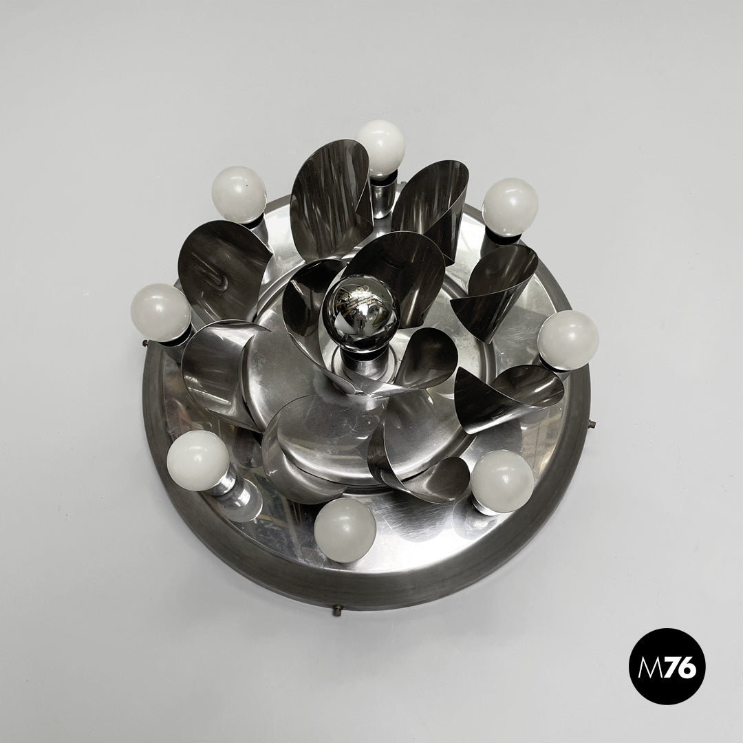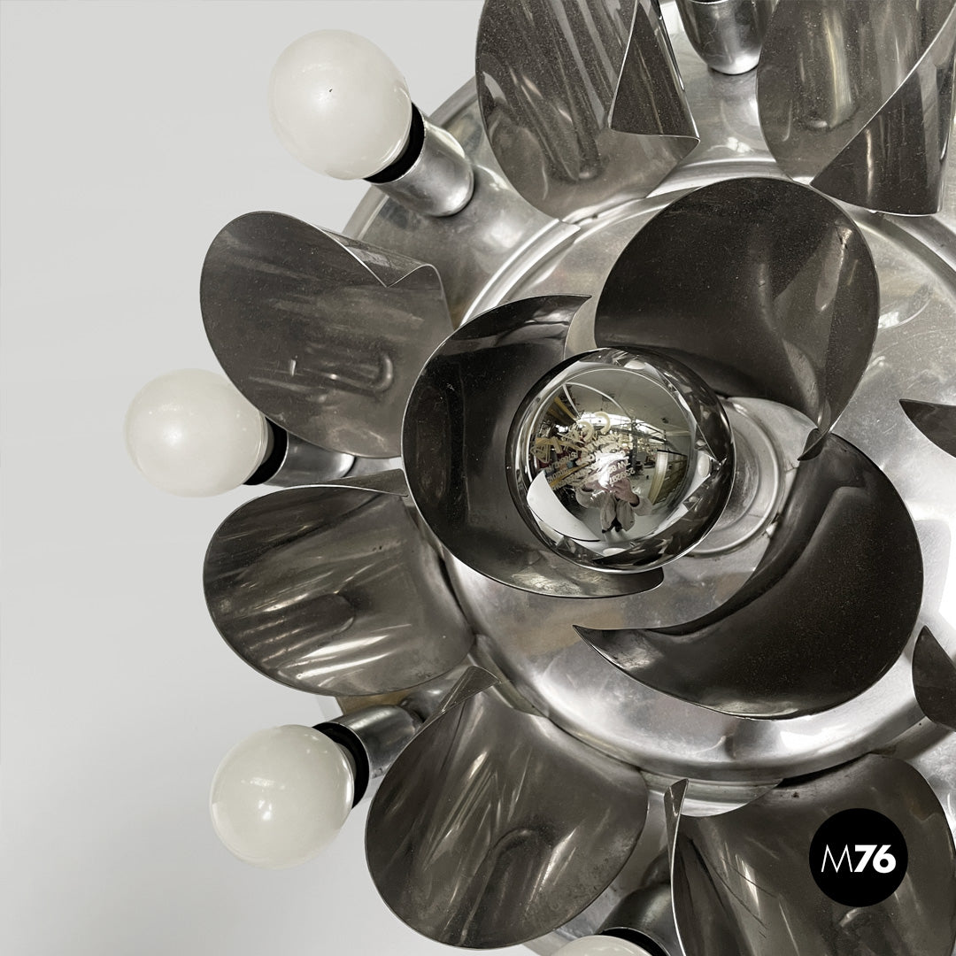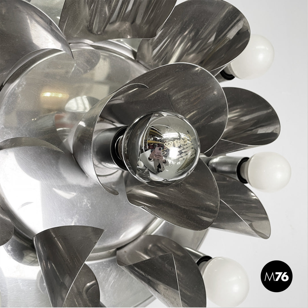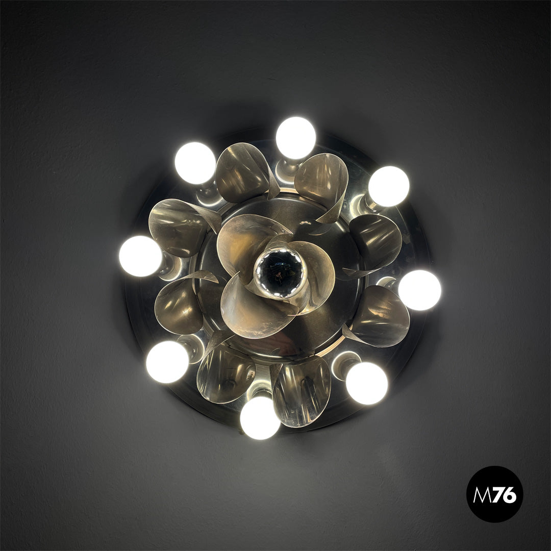 Chrome-plated steel wall light. The round metal frame features a composition of curved fins that form a flower-like shape around the central bulb. Eight lamp holders, each with an opal globe bulb, surround the main body. Can be used as a ceiling light.