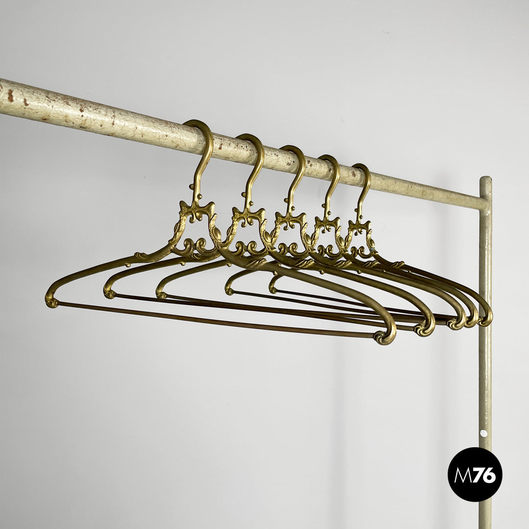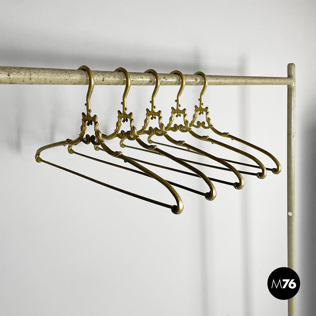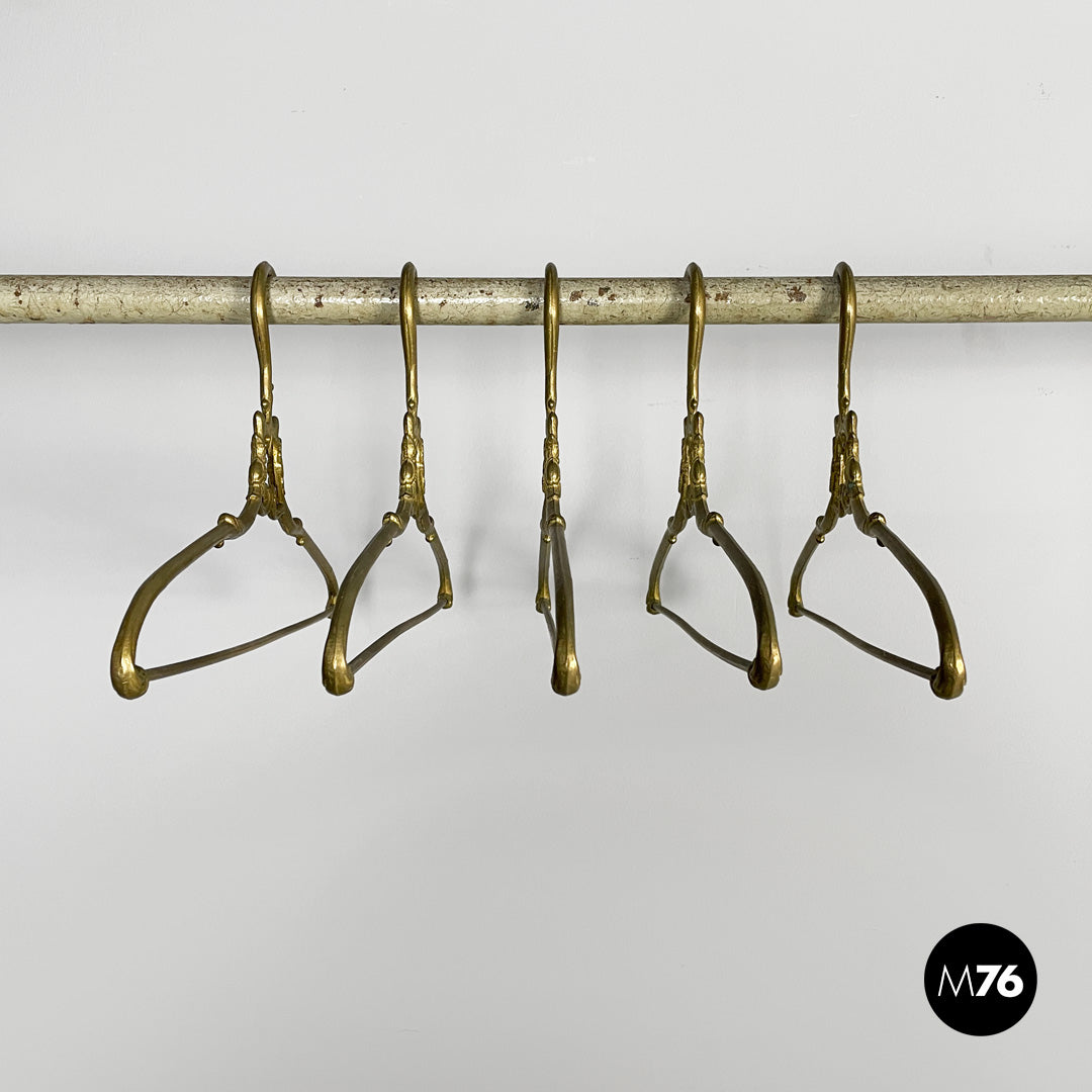 Set of five brass hangers. The upper hook has a soft, decorated curve, while the center features a small, symmetrical ornamental element. The ends are slightly curved and embellished with curlicue details.