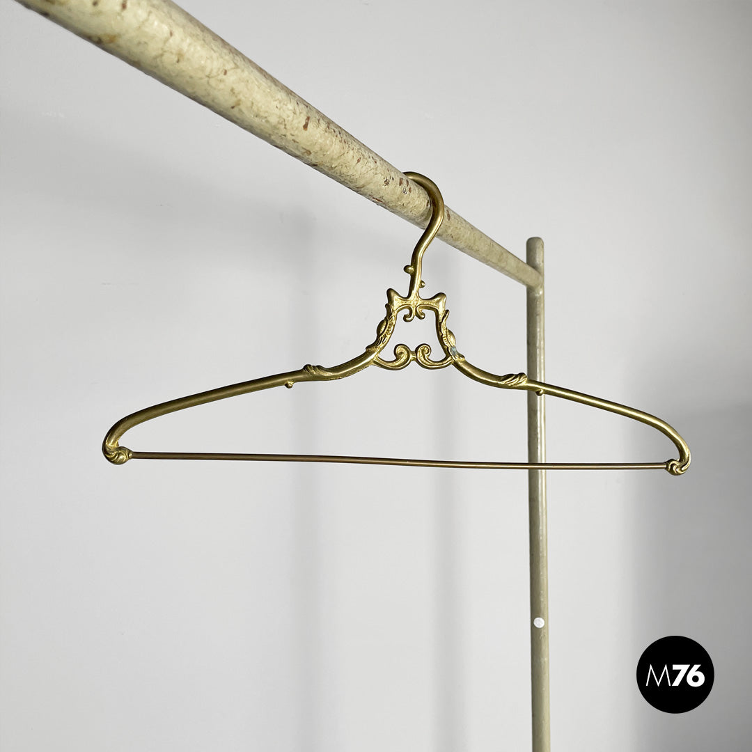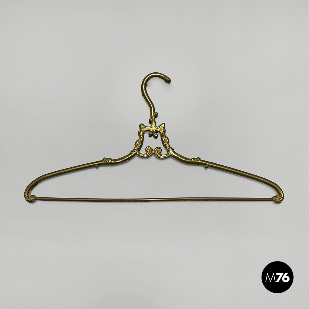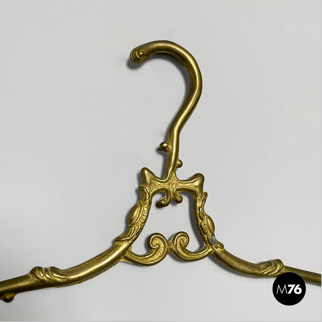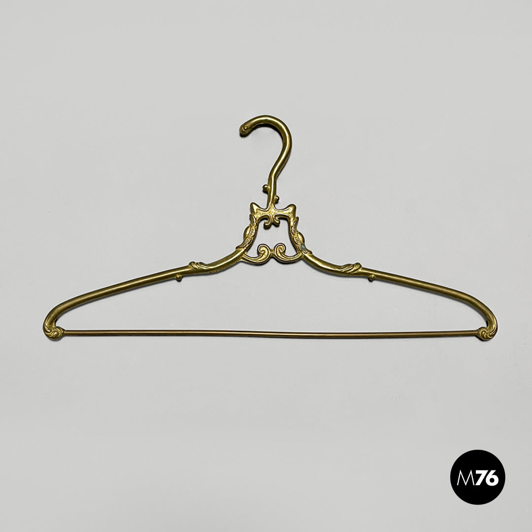 Set of five brass hangers. The upper hook has a soft, decorated curve, while the center features a small, symmetrical ornamental element. The ends are slightly curved and embellished with curlicue details.
