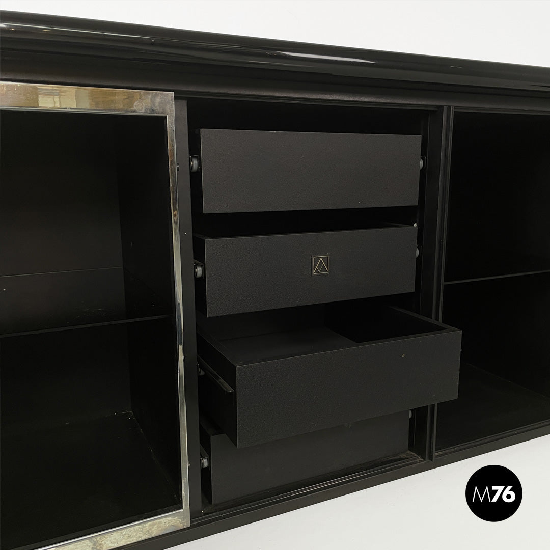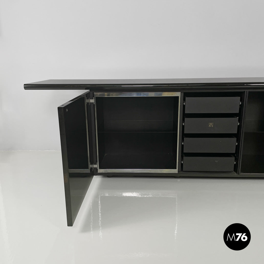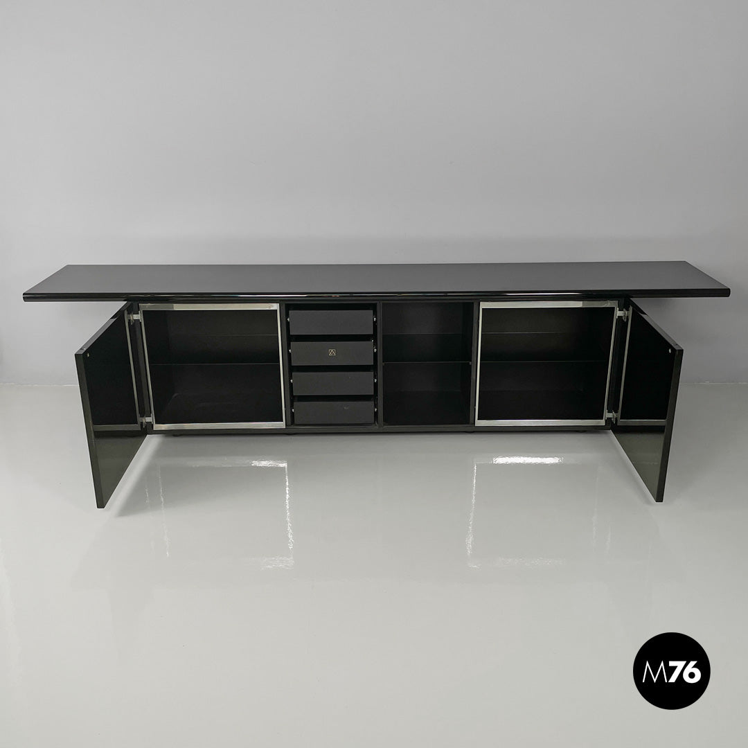 Sheraton model sideboard, with structure entirely in glossy black lacquered wood. The rectangular top has a beveled front edge, on the front there is a row of four black wooden drawers and three compartments with glass shelves and chromed metal profiles. The peculiarity of the sideboard lies in its double opening: it combines the sliding opening with the hinged one.