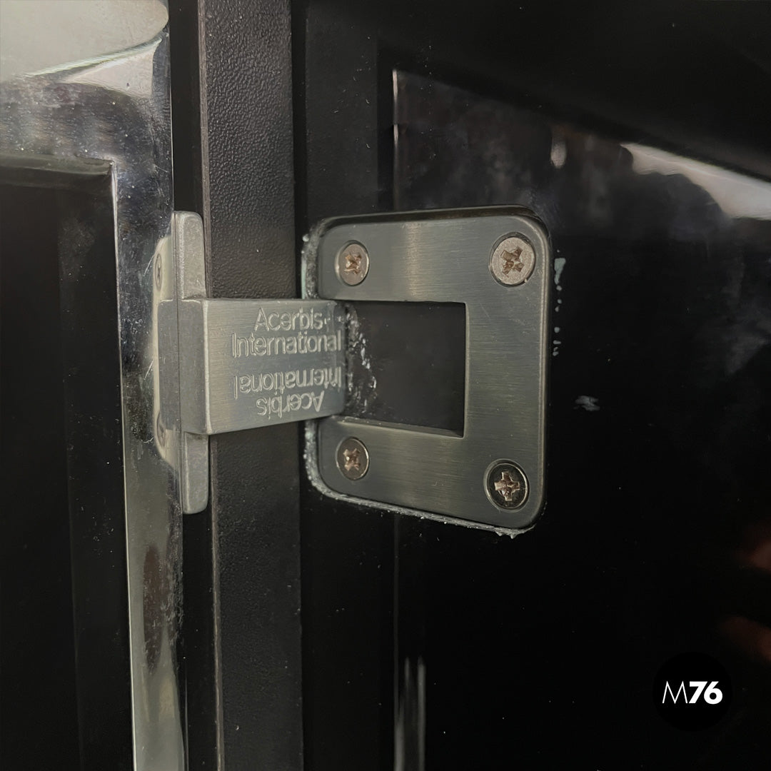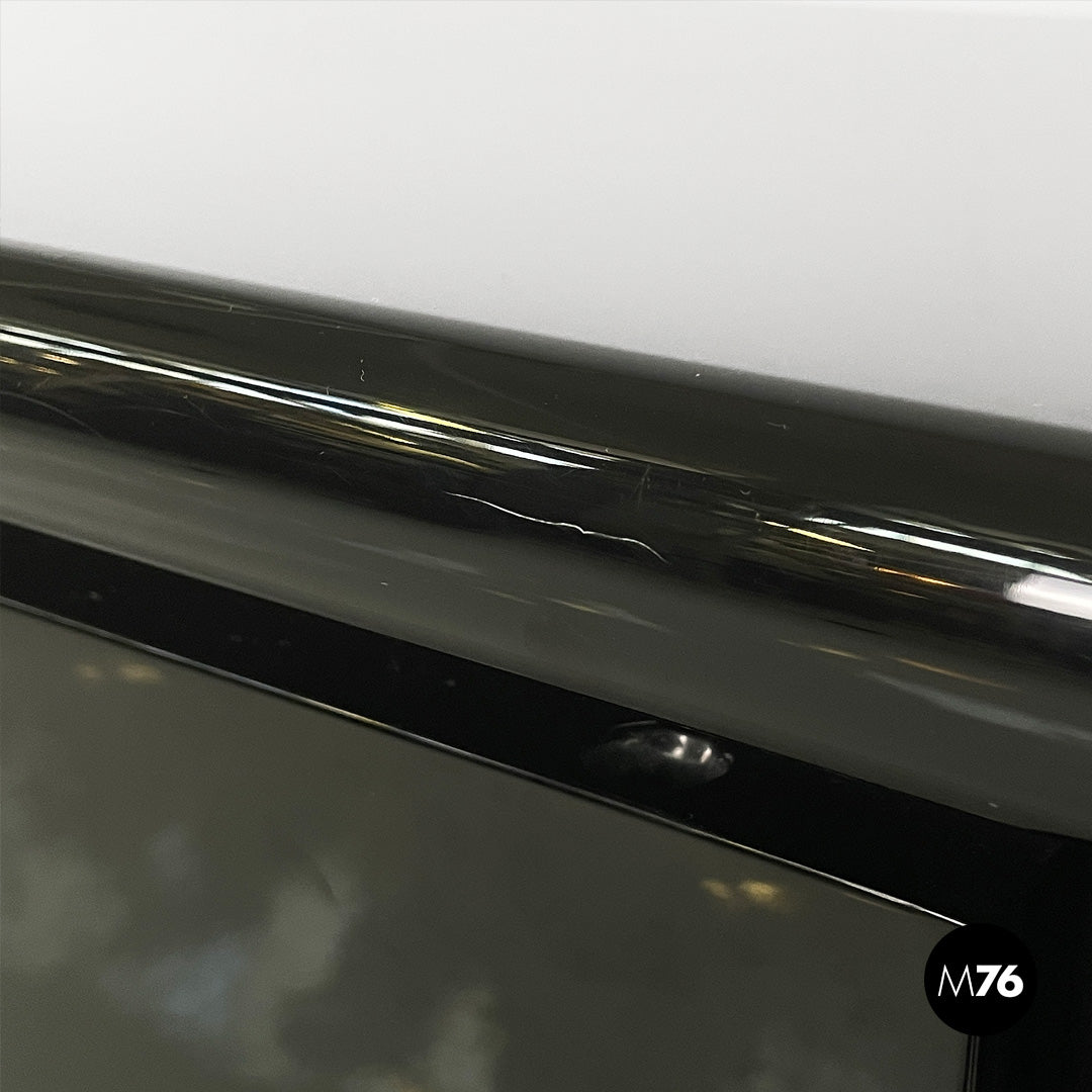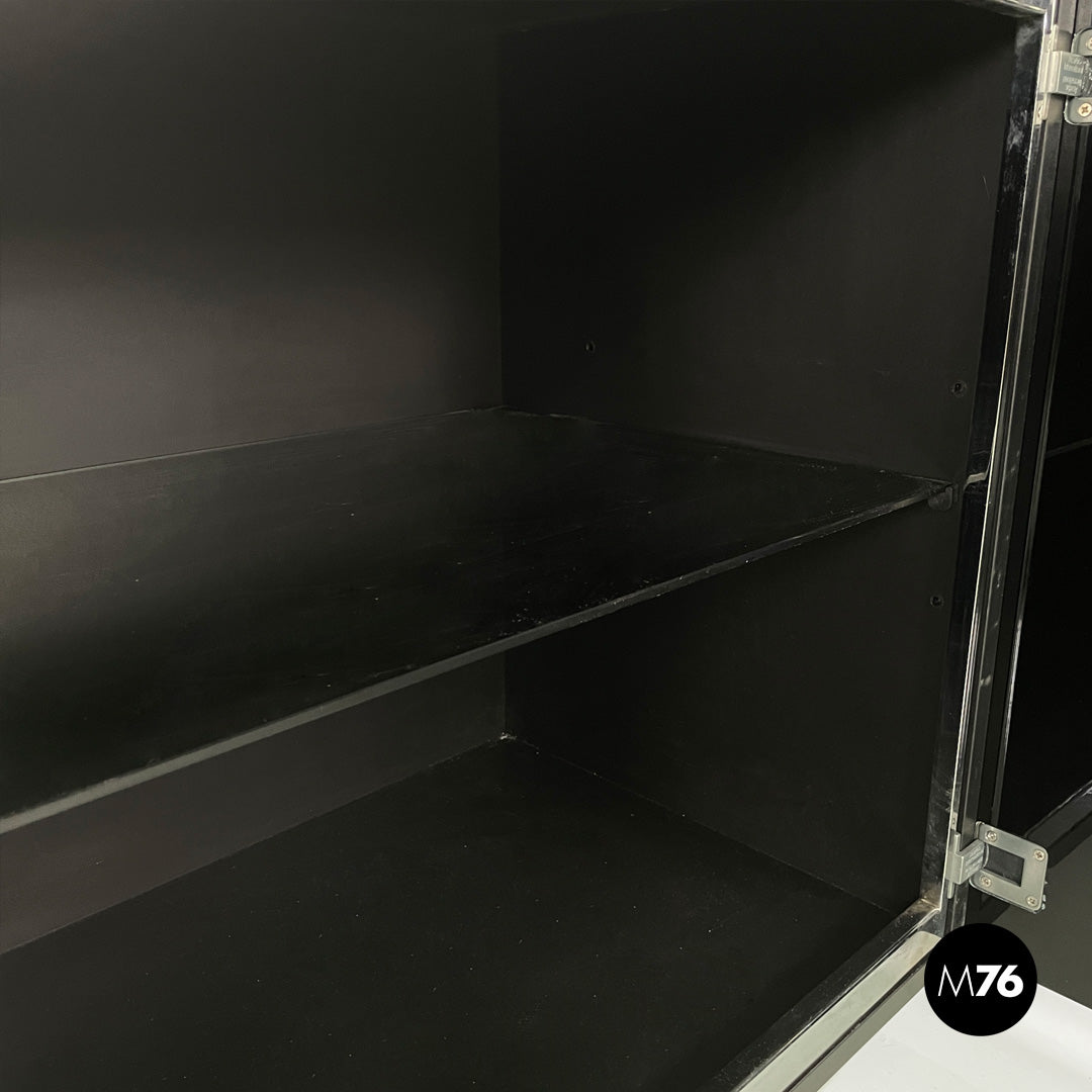 Sheraton model sideboard, with structure entirely in glossy black lacquered wood. The rectangular top has a beveled front edge, on the front there is a row of four black wooden drawers and three compartments with glass shelves and chromed metal profiles. The peculiarity of the sideboard lies in its double opening: it combines the sliding opening with the hinged one.