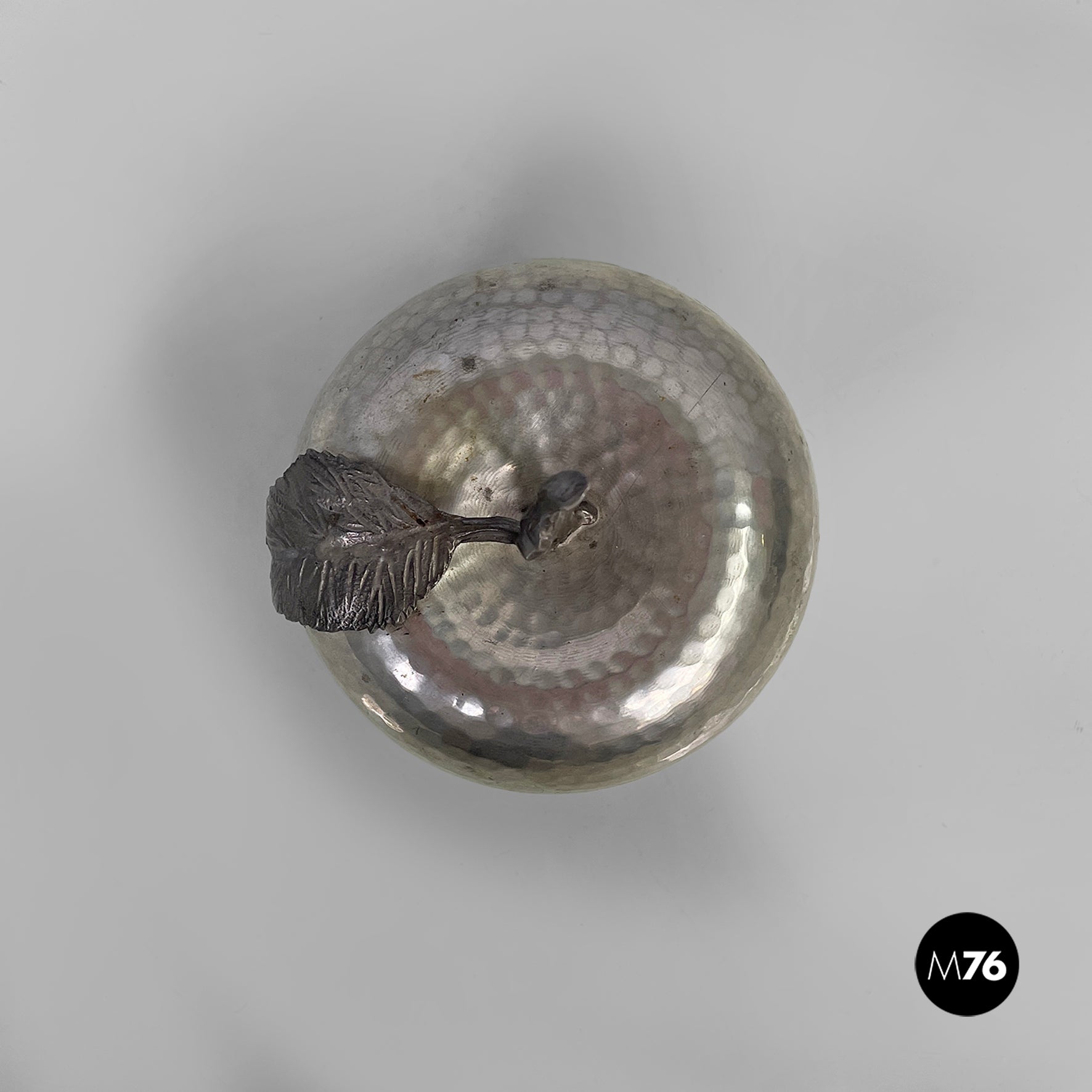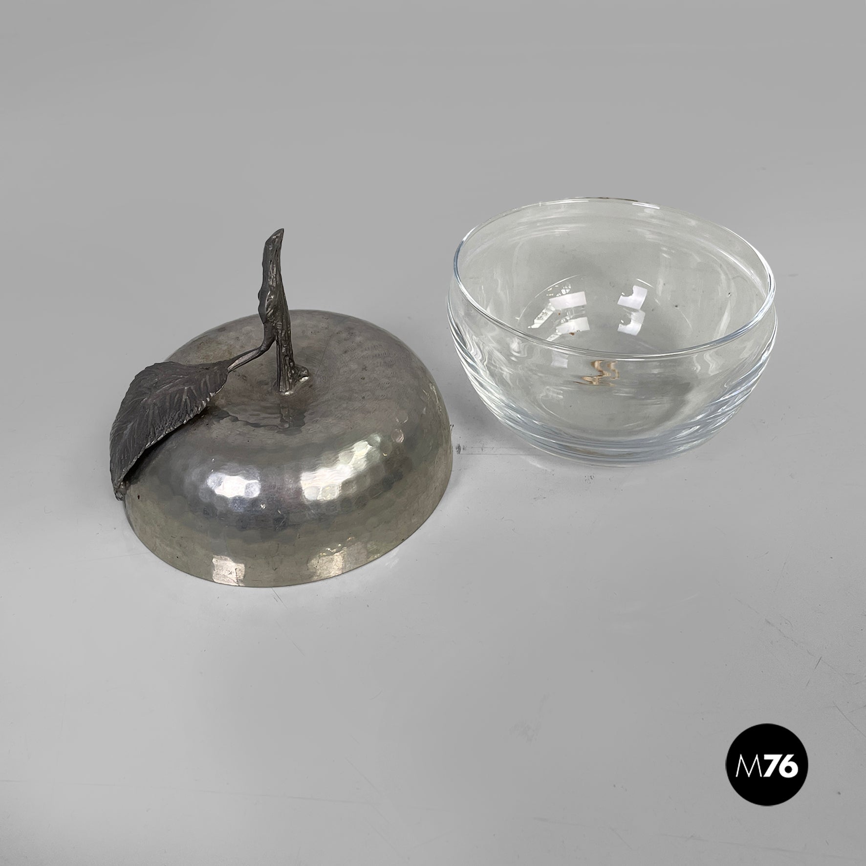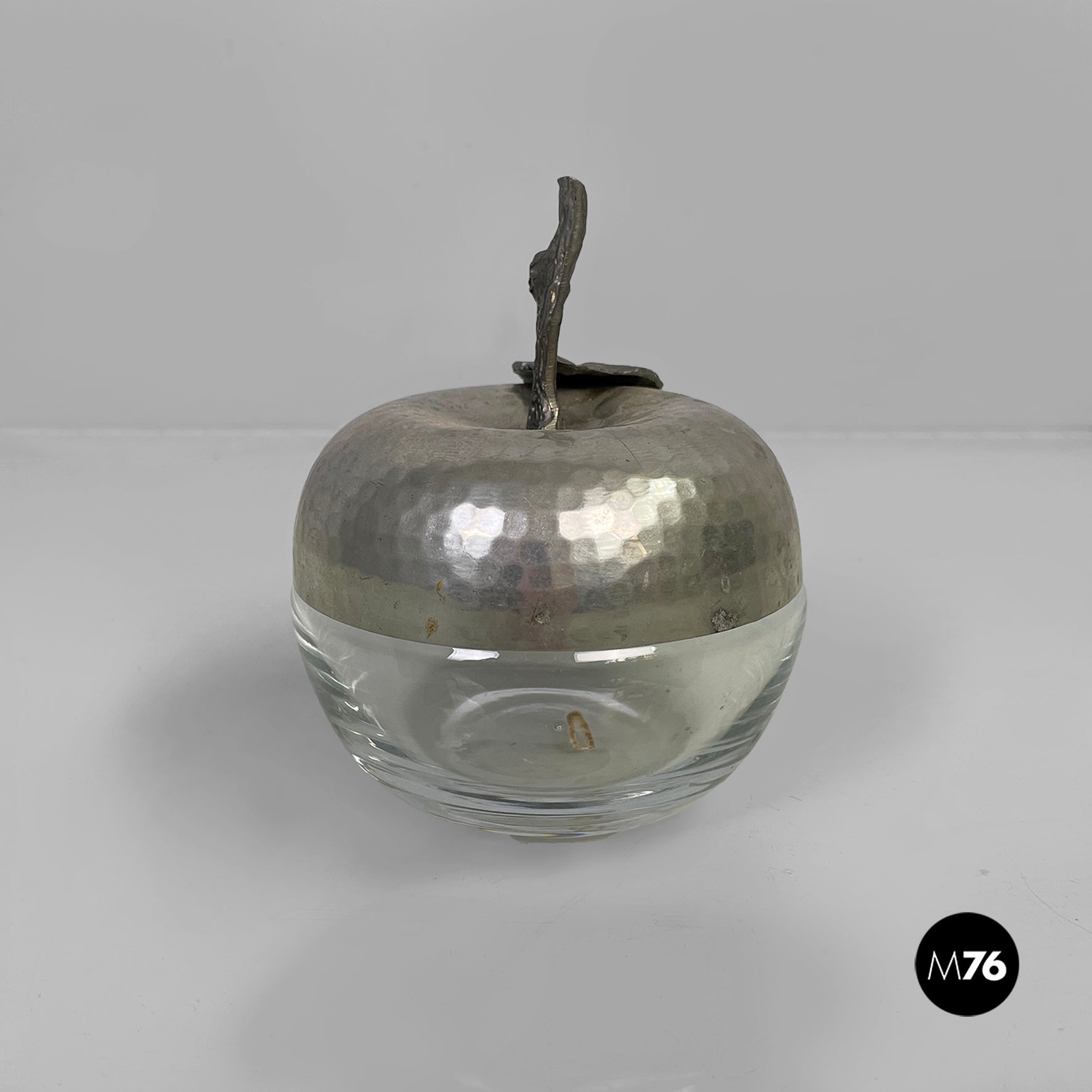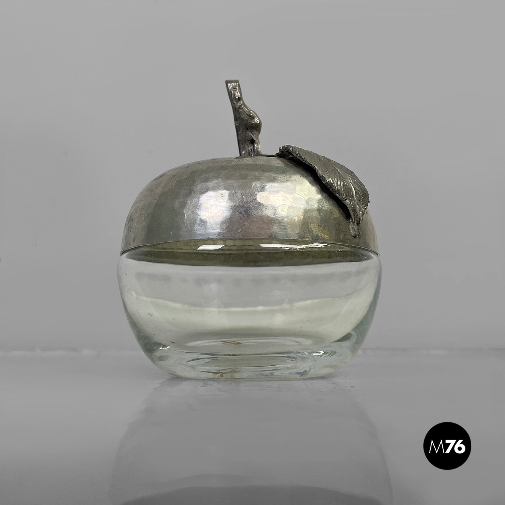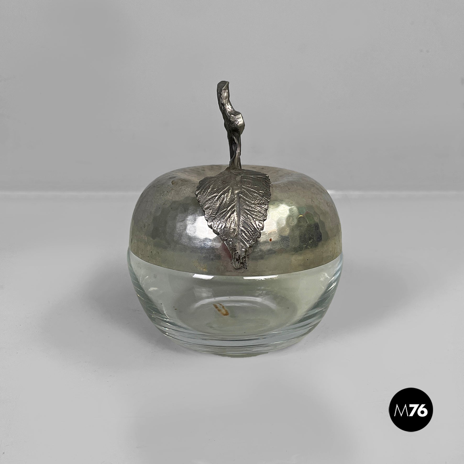 Apple-shaped glass and metal container. It features a clear glass body and a finely crafted metal lid, embellished with a decoration depicting a branch with a leaf.