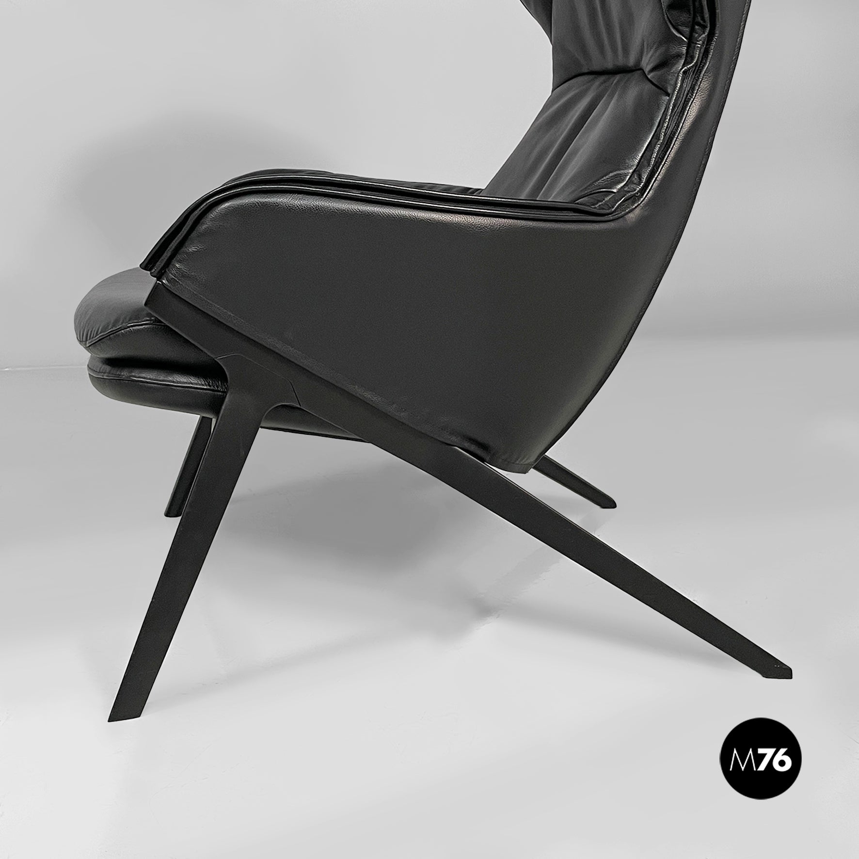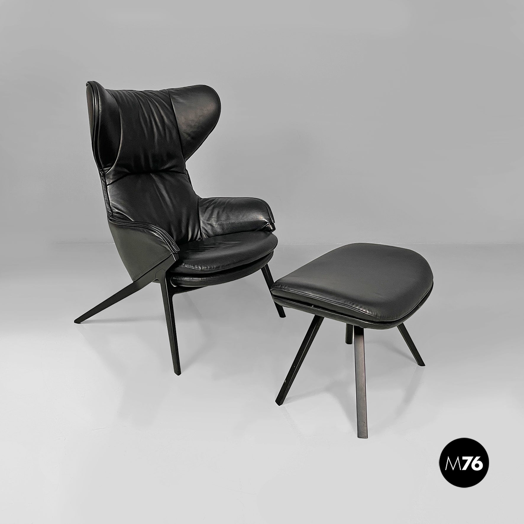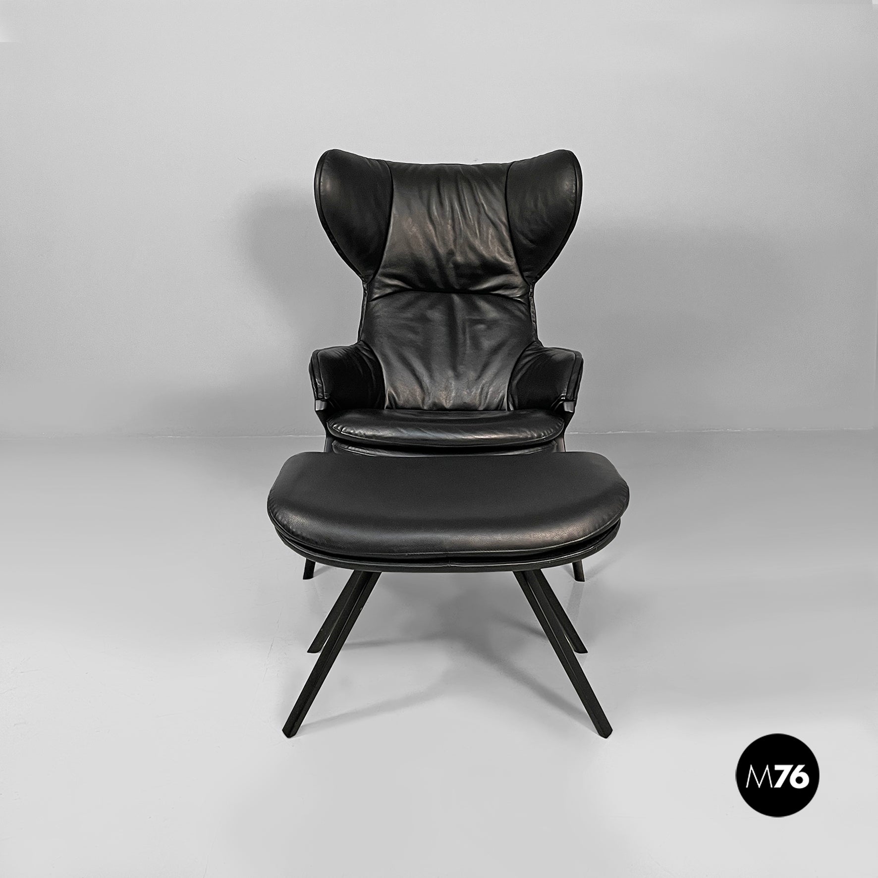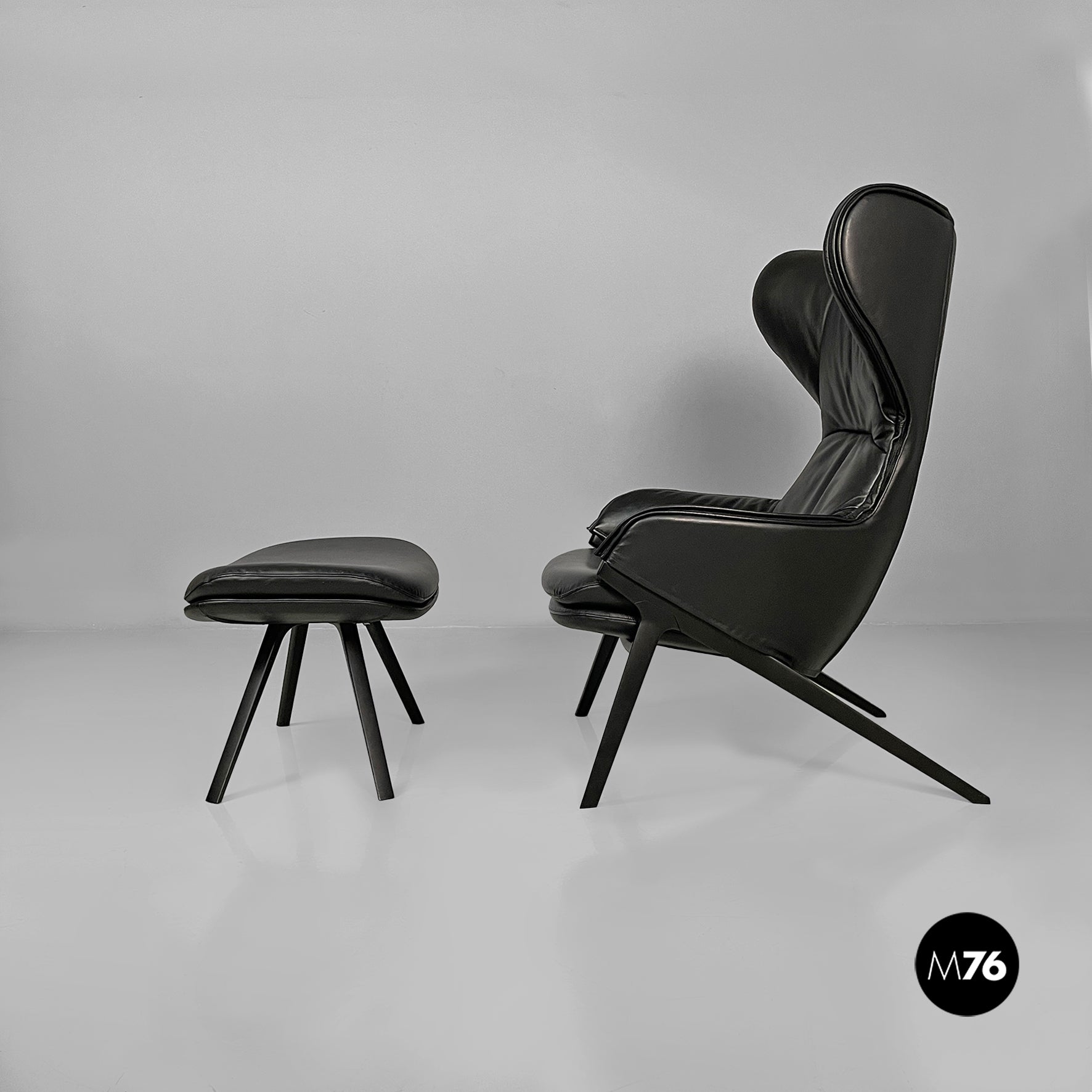 Armchair model P22 with matching footstool. The armchair is padded and upholstered in smooth black leather. The high backrest has a wing chair-style shape with wraparound side wings. The seat is wide, and the armrests are integrated into the frame, creating a soft profile. It features four thin, angled legs in dark metal. The matching ottoman is upholstered in the same material and padded. It has a rounded rectangular shape. The legs are angled like those of the armchair, in a coherent style.