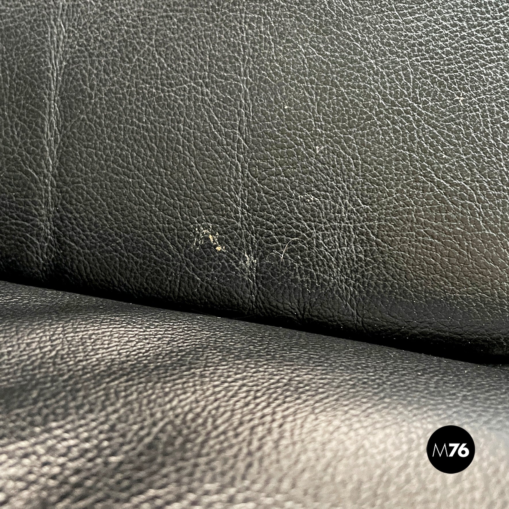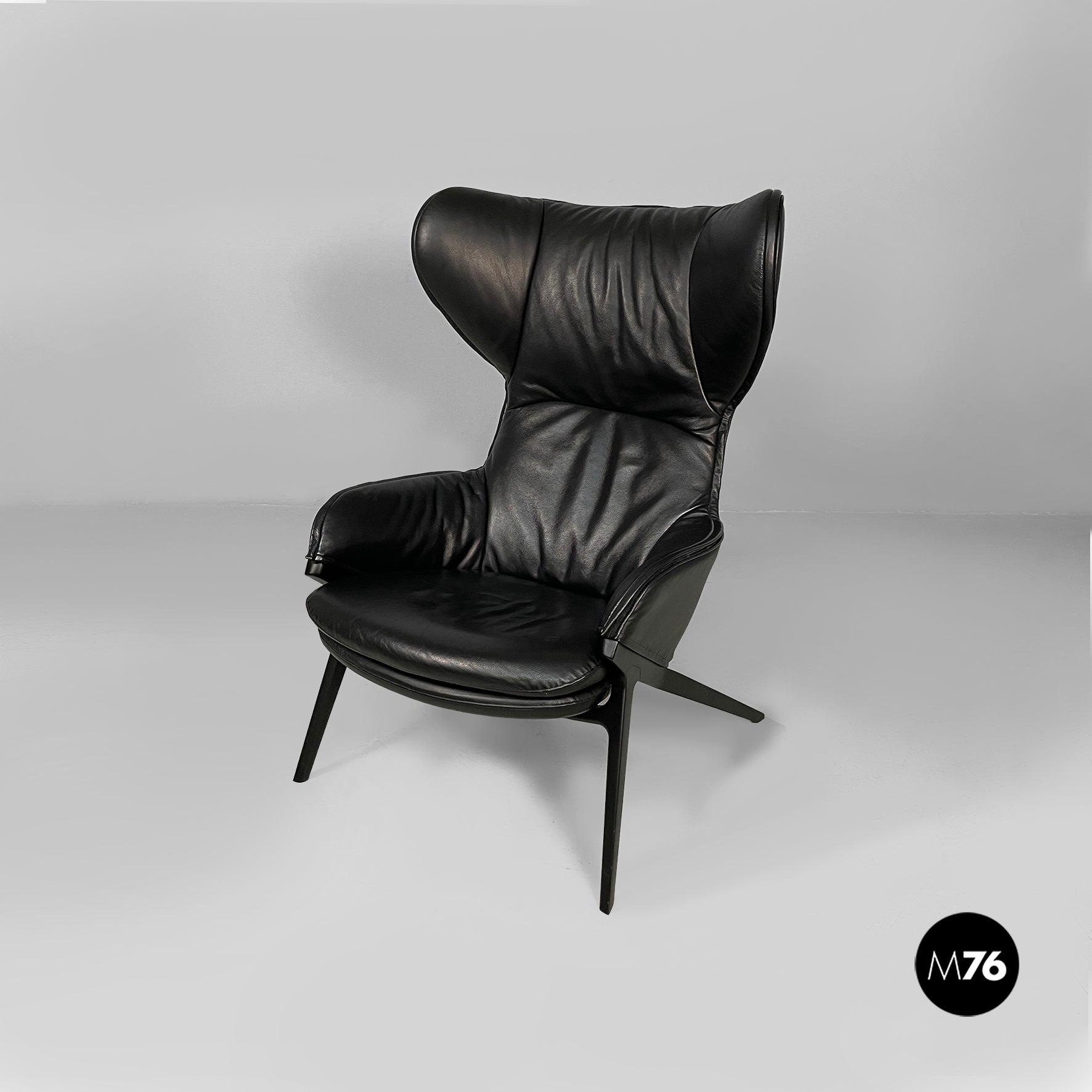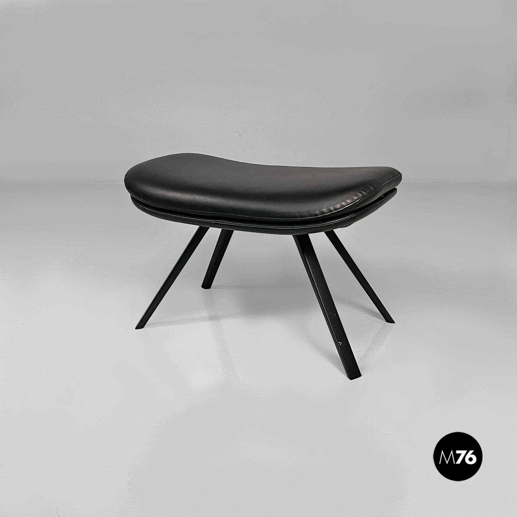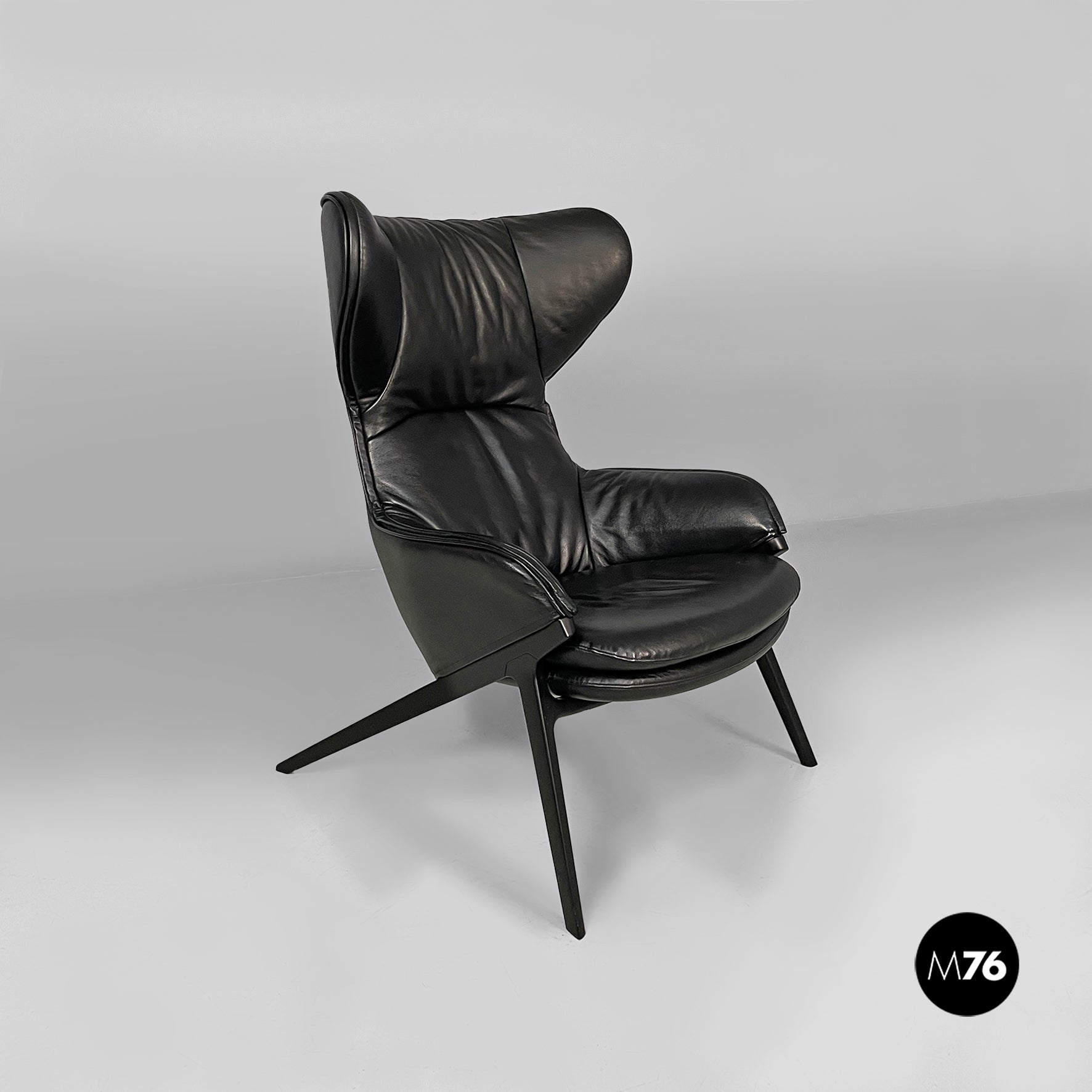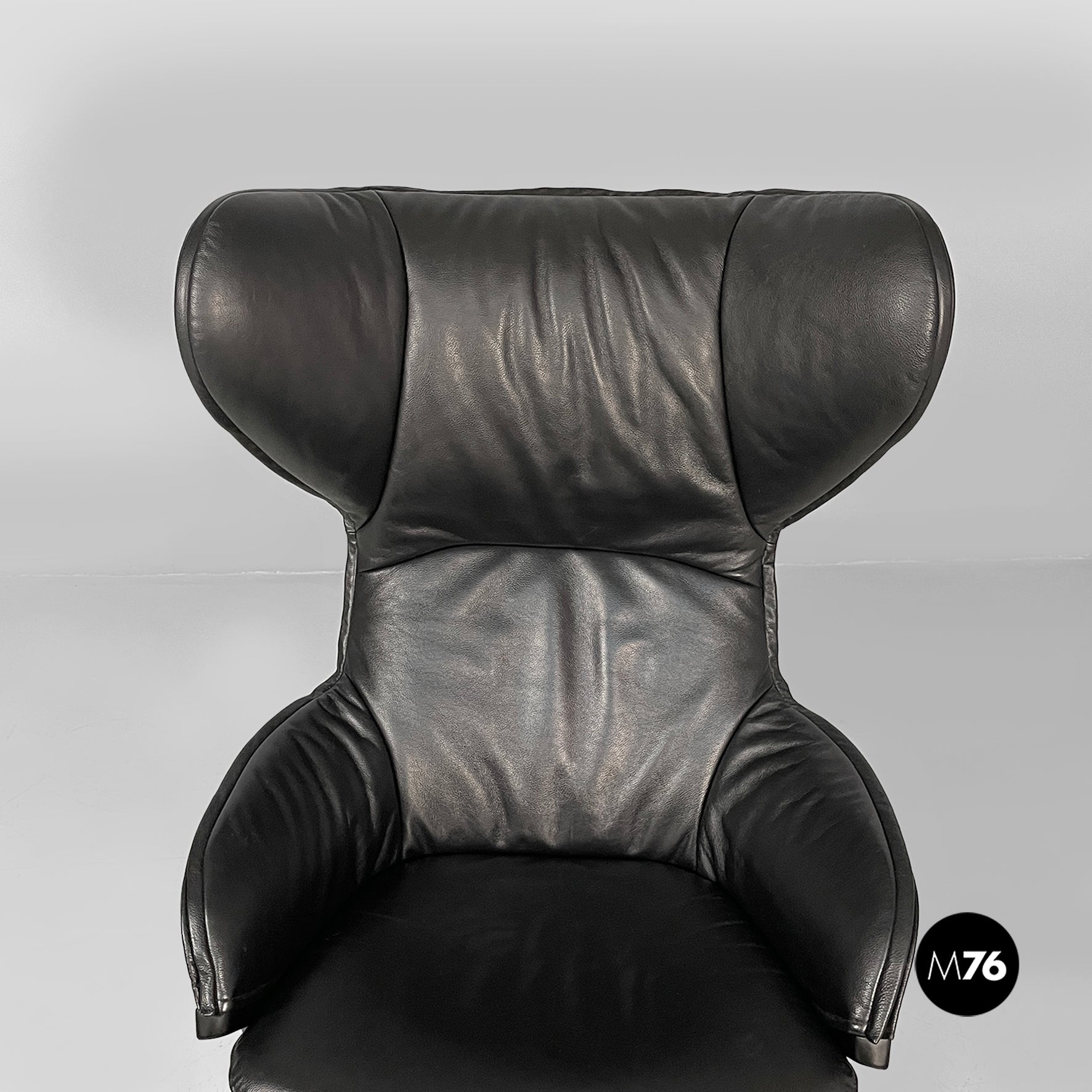 Armchair model P22 with matching footstool. The armchair is padded and upholstered in smooth black leather. The high backrest has a wing chair-style shape with wraparound side wings. The seat is wide, and the armrests are integrated into the frame, creating a soft profile. It features four thin, angled legs in dark metal. The matching ottoman is upholstered in the same material and padded. It has a rounded rectangular shape. The legs are angled like those of the armchair, in a coherent style.