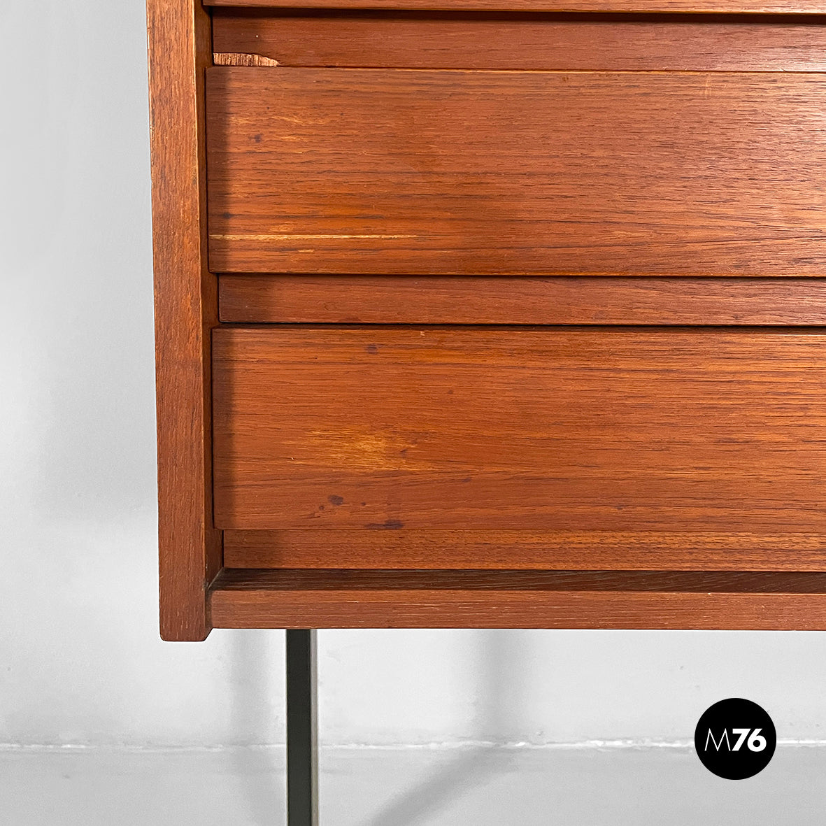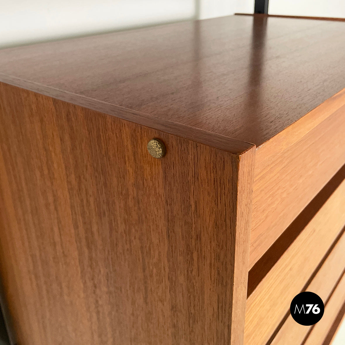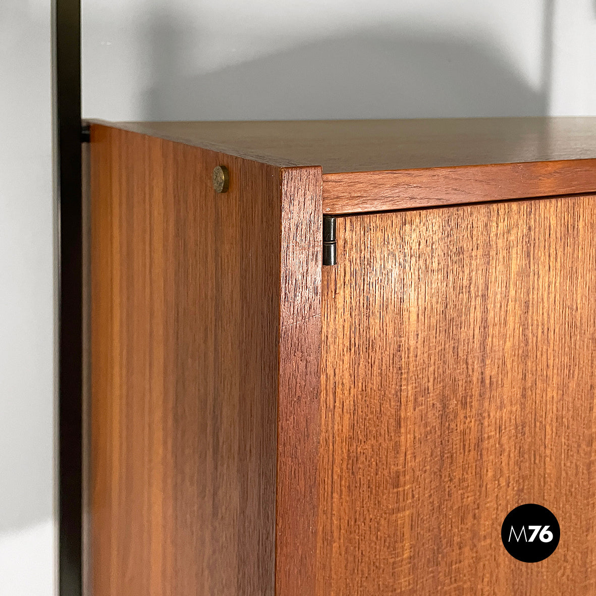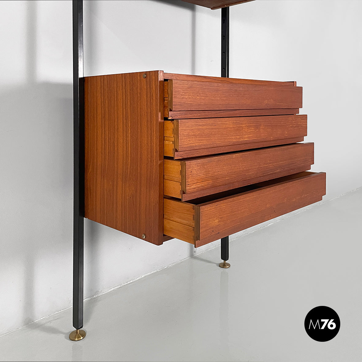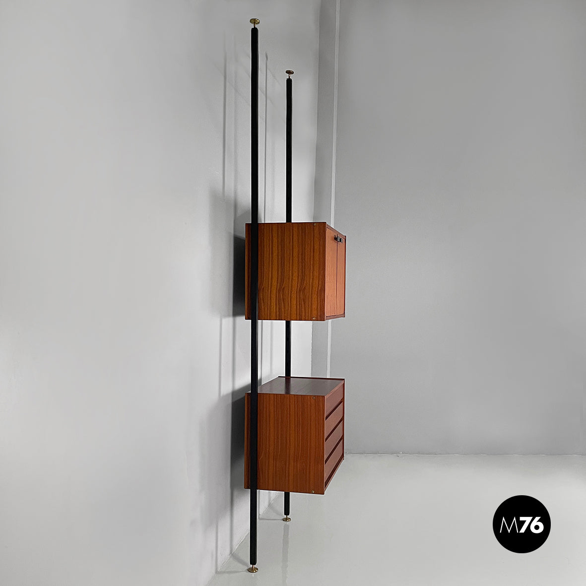 Floor-to-ceiling bookcase with single span. It features two modules in wood: a chest of four drawers and a compartment with a double hinged door, an internal shelf and black-painted wooden handles. The structure features two black-painted metal uprights with round brass feet.