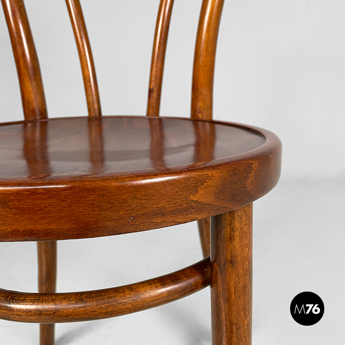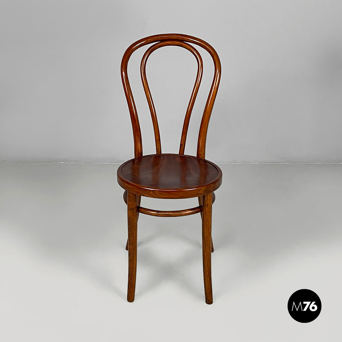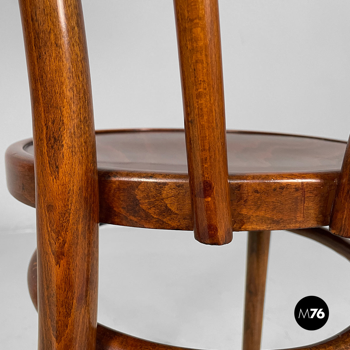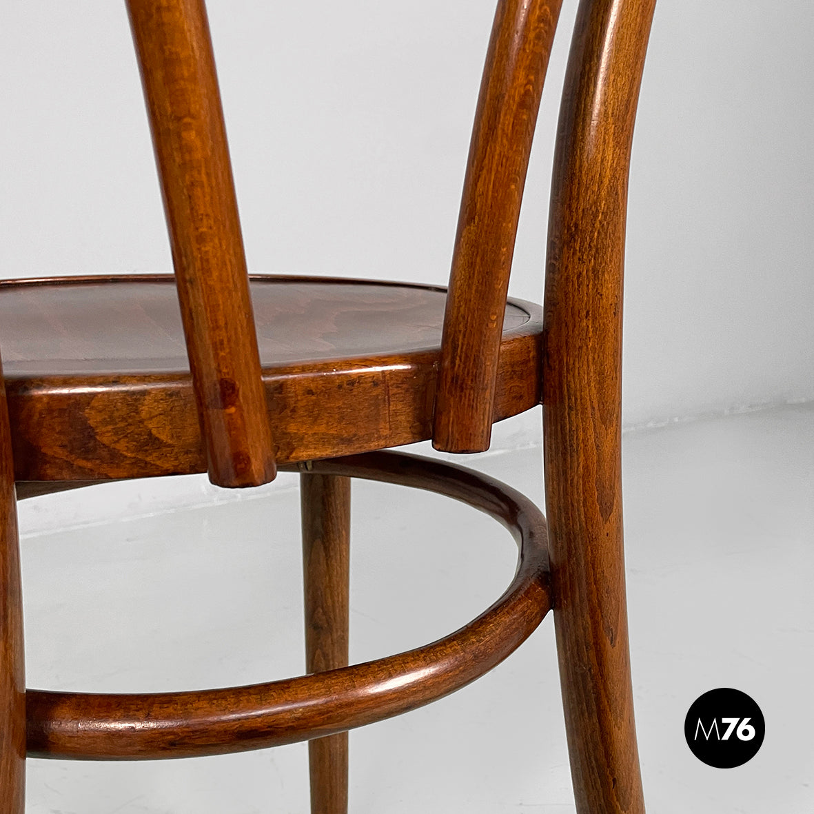 Set of eighteen chairs made entirely of wood. The seat is round while the backrest is made of curved round slats. The legs have round section. In the Thonet style. It can be used as bistro chairs.