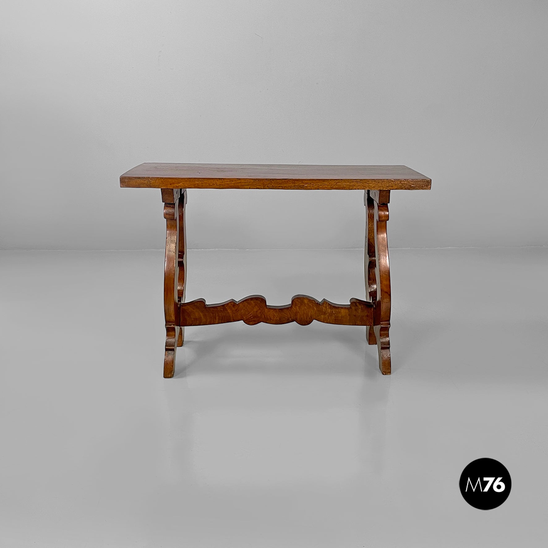 Pair of coffee tables made entirely of wood. The rectangular top is supported by a pair of finely crafted wooden legs. Late 19th-century style. They can also be used as bedside tables.