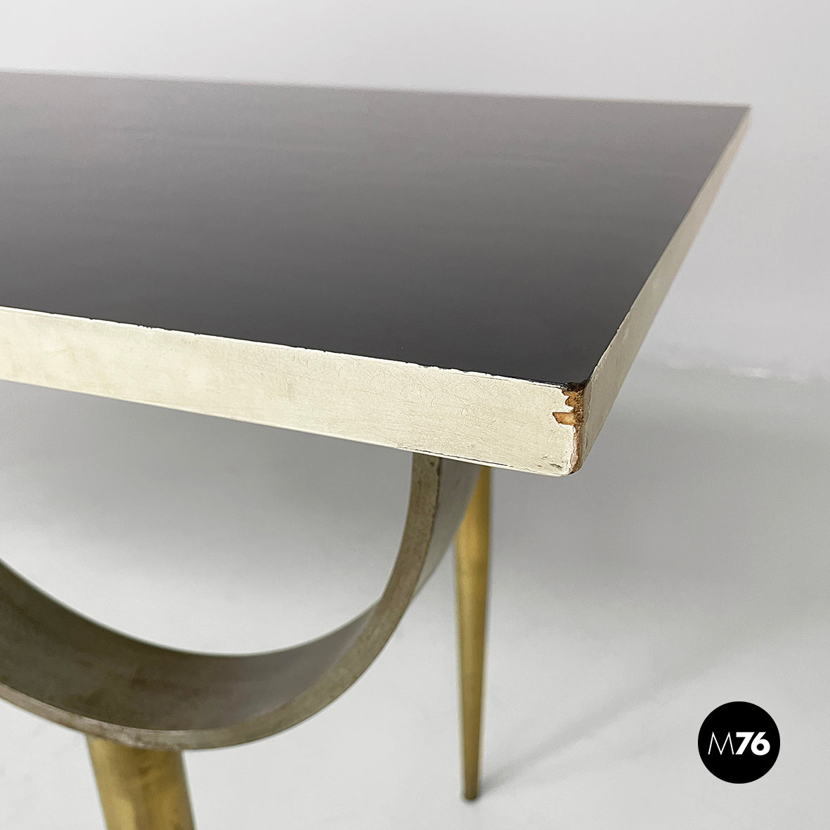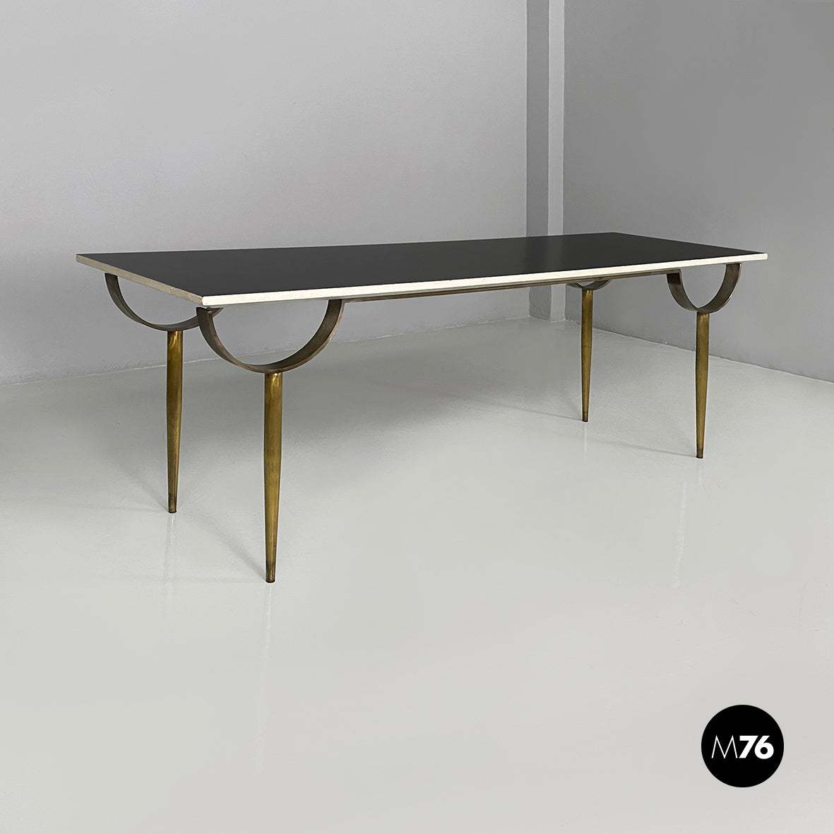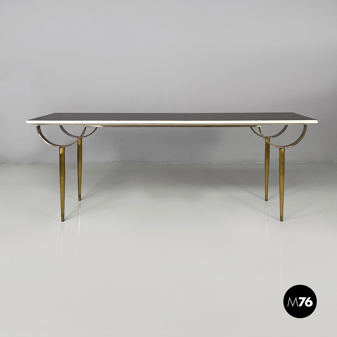 Console table with a rectangular top in black painted wood with white profiles. The round brass legs feature a metal semicircular decoration. It can be used as a dining table.