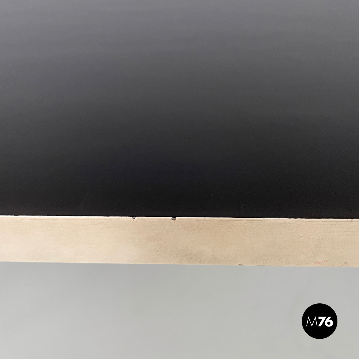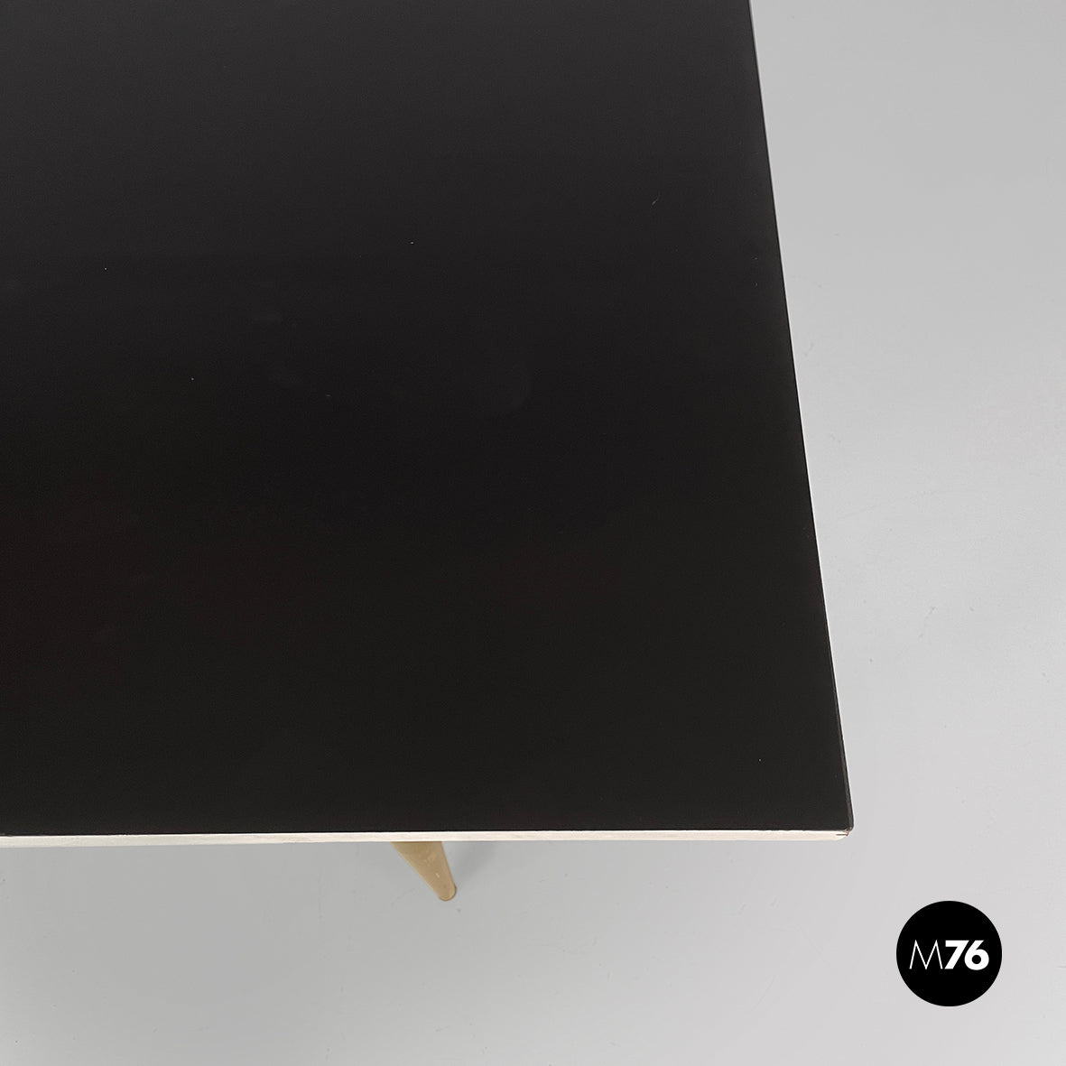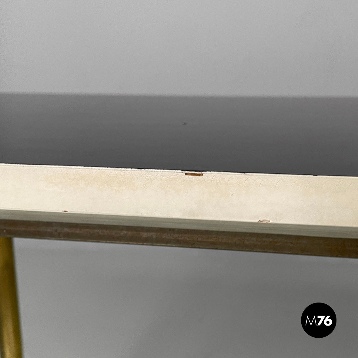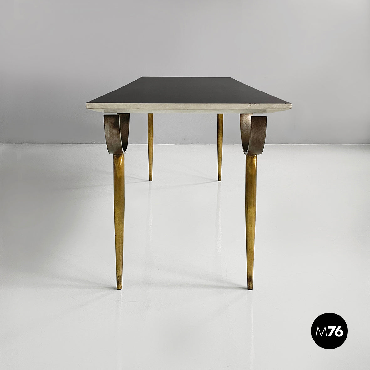 Console table with a rectangular top in black painted wood with white profiles. The round brass legs feature a metal semicircular decoration. It can be used as a dining table.