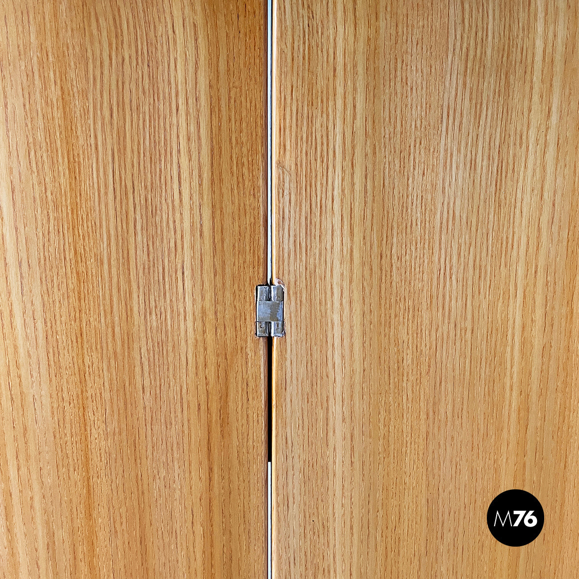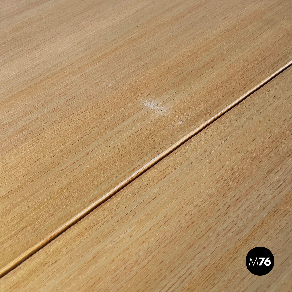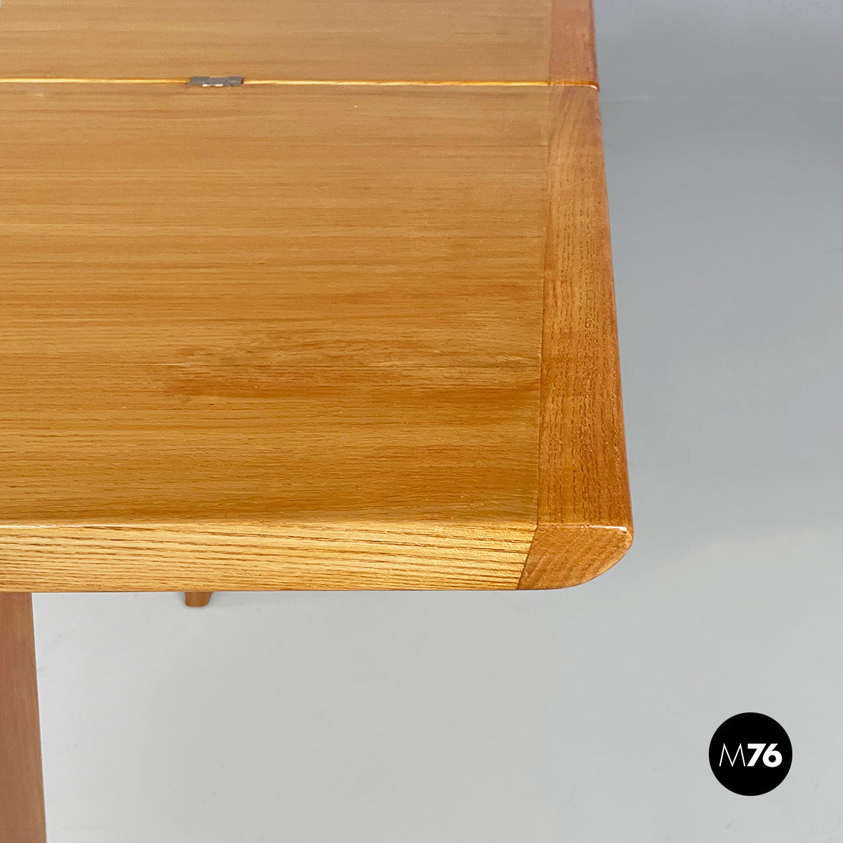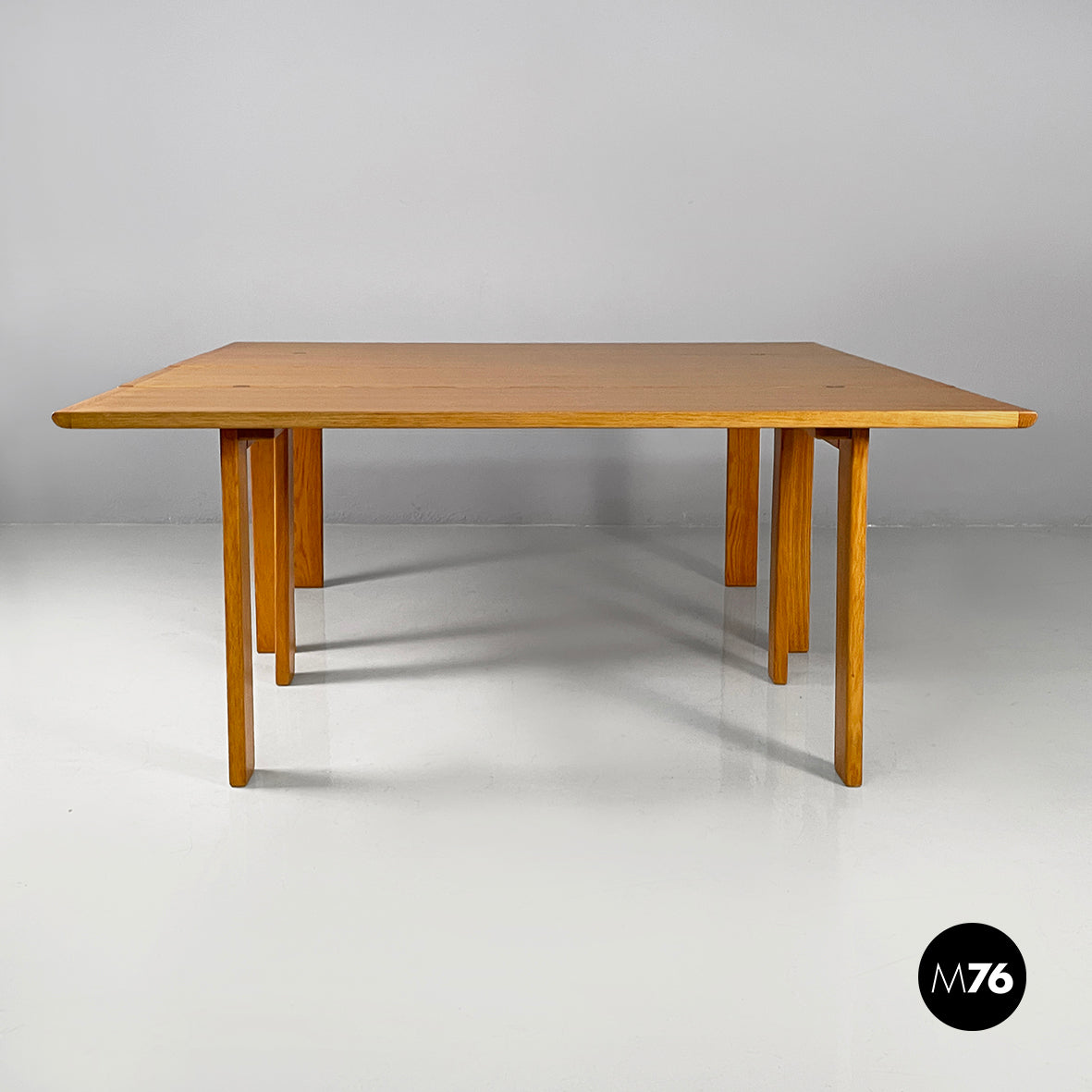 Dining table with extensions in light wood, consisting of two separate tables inserted inside each other. Each table features a foldable solid wood top and four rectangular legs. Underneath the top is a dovetail structure and a retractable mechanism. The table can be used as a single extendable table or as a pair of dining tables.