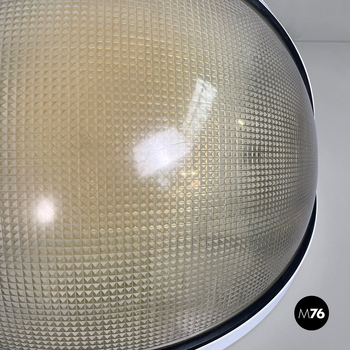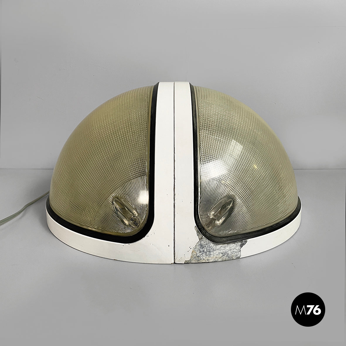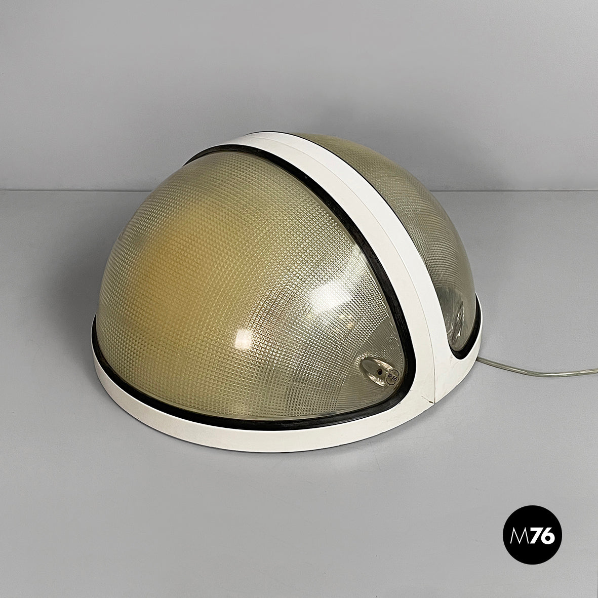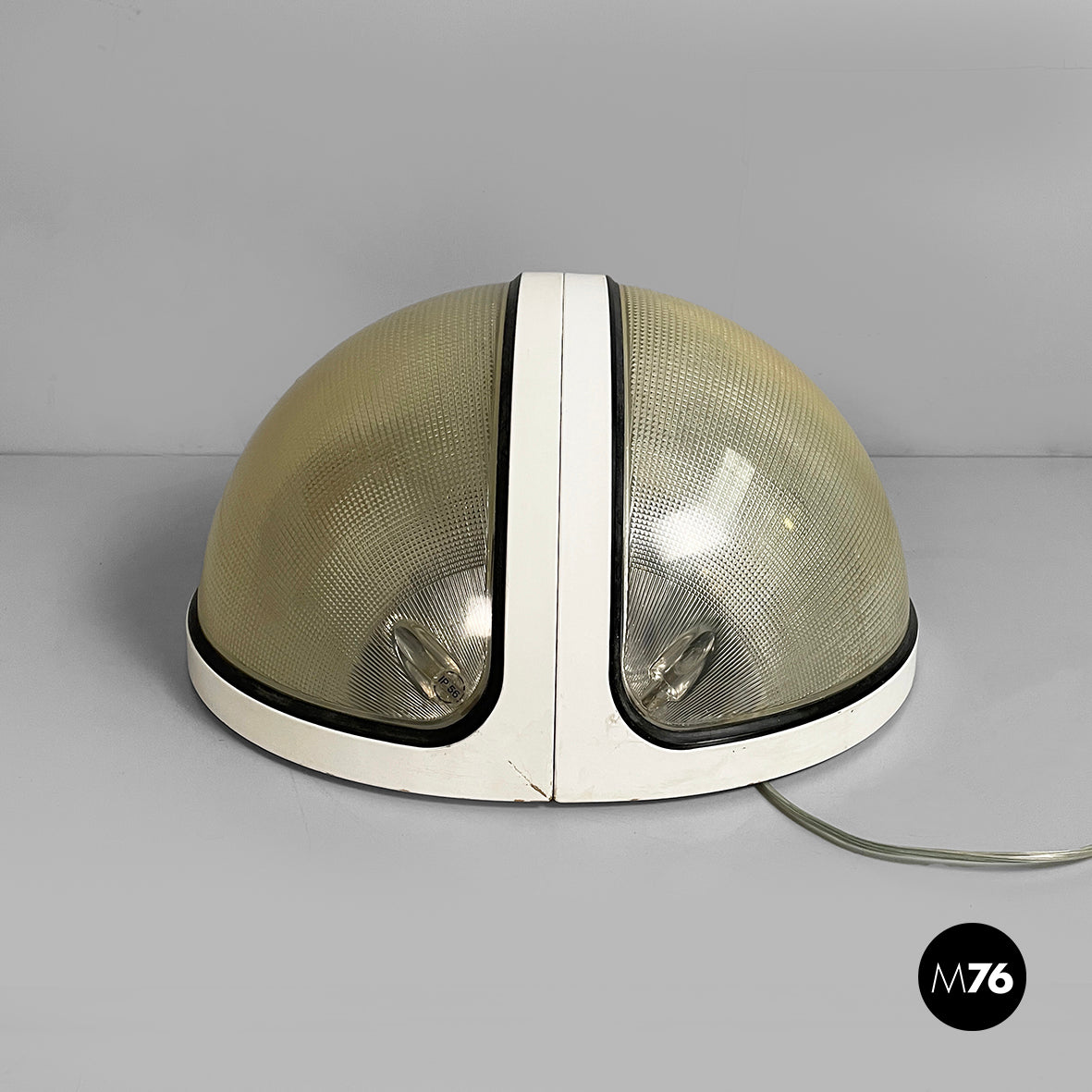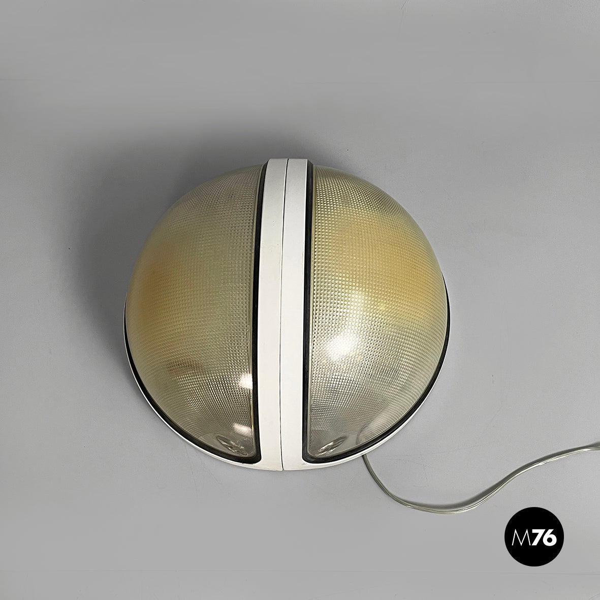 Floor lamp model Totum with semi-spherical shape. The lamp features two plastic diffusers with a white painted metal structure. Space Age style.