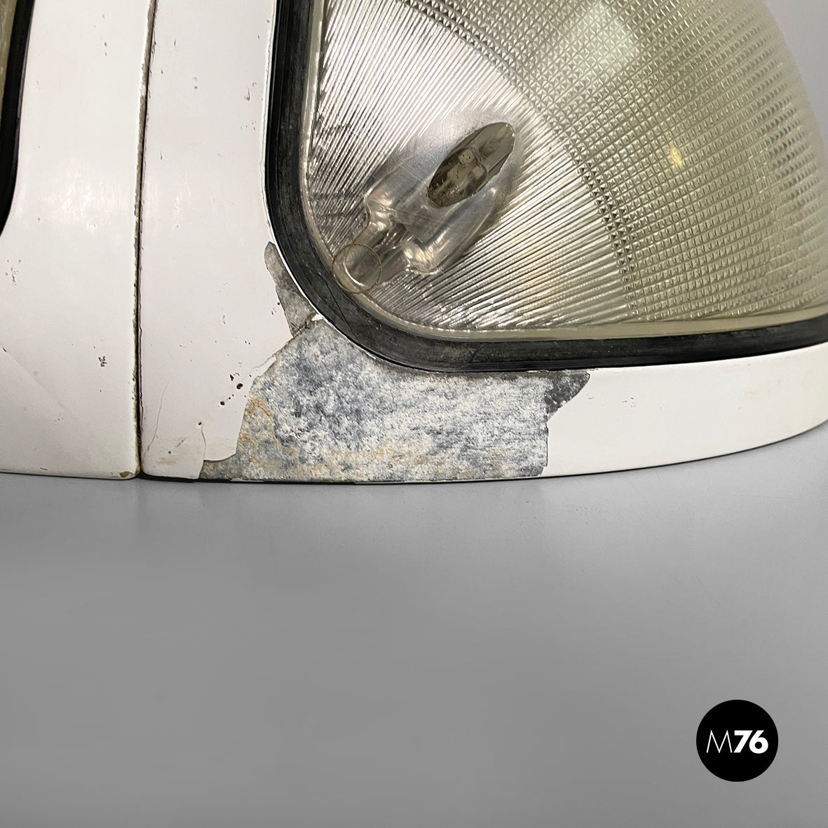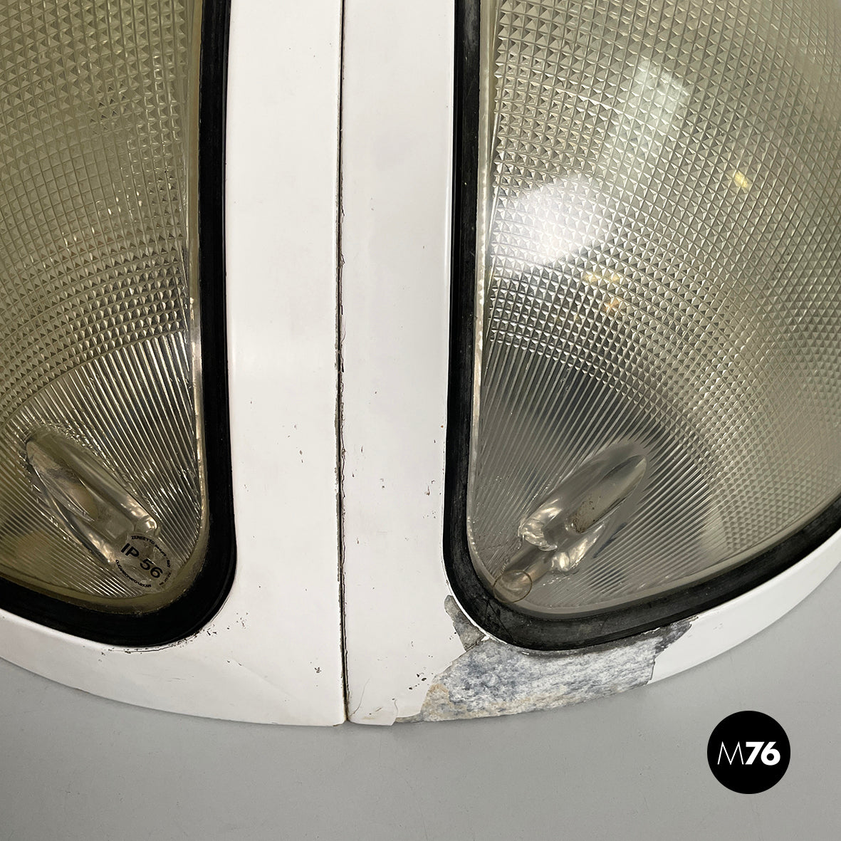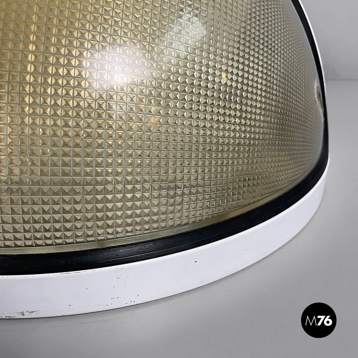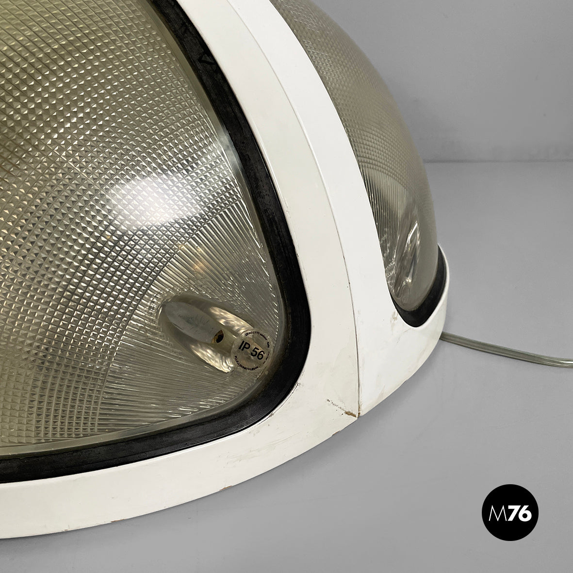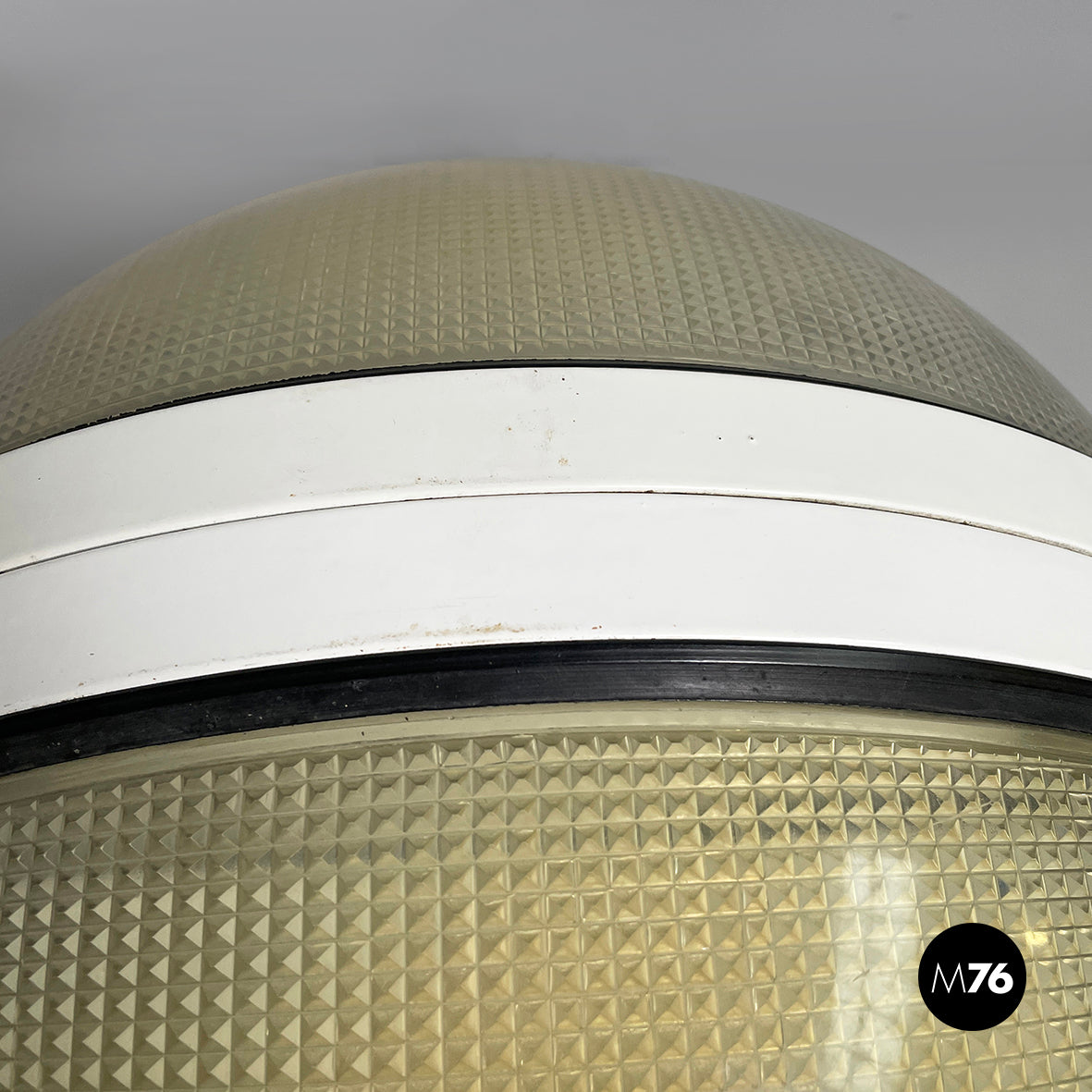 Floor lamp model Totum with semi-spherical shape. The lamp features two plastic diffusers with a white painted metal structure. Space Age style.