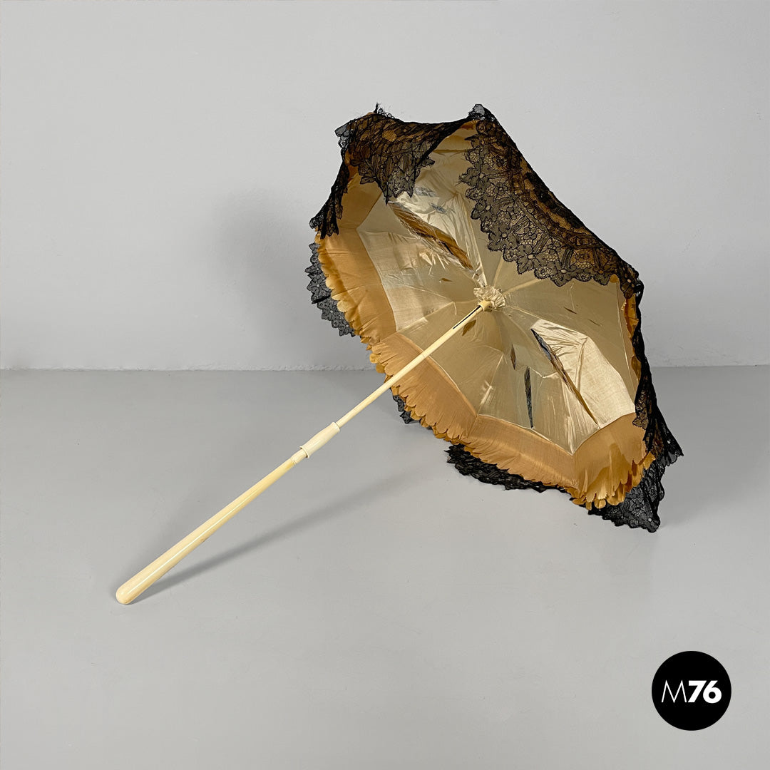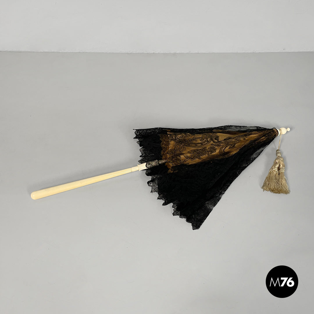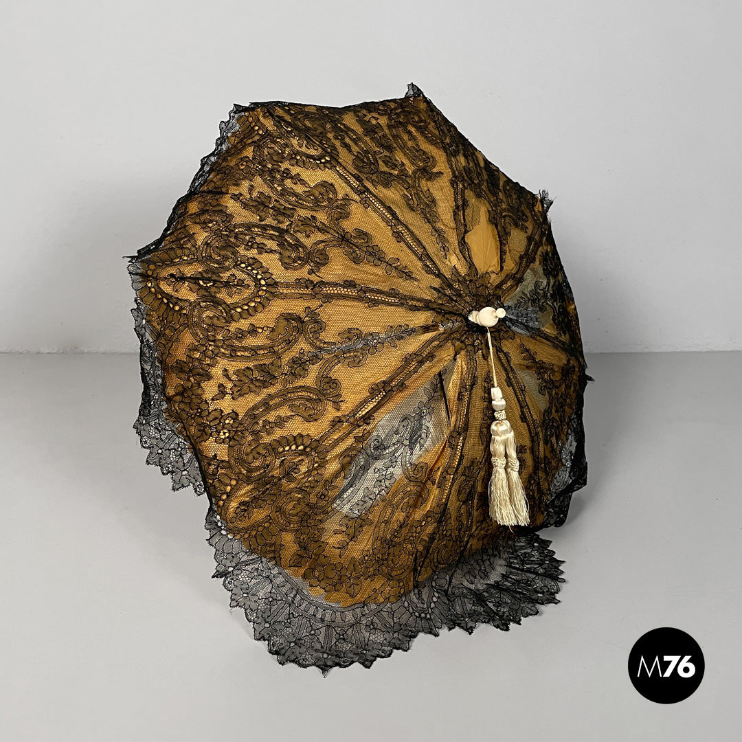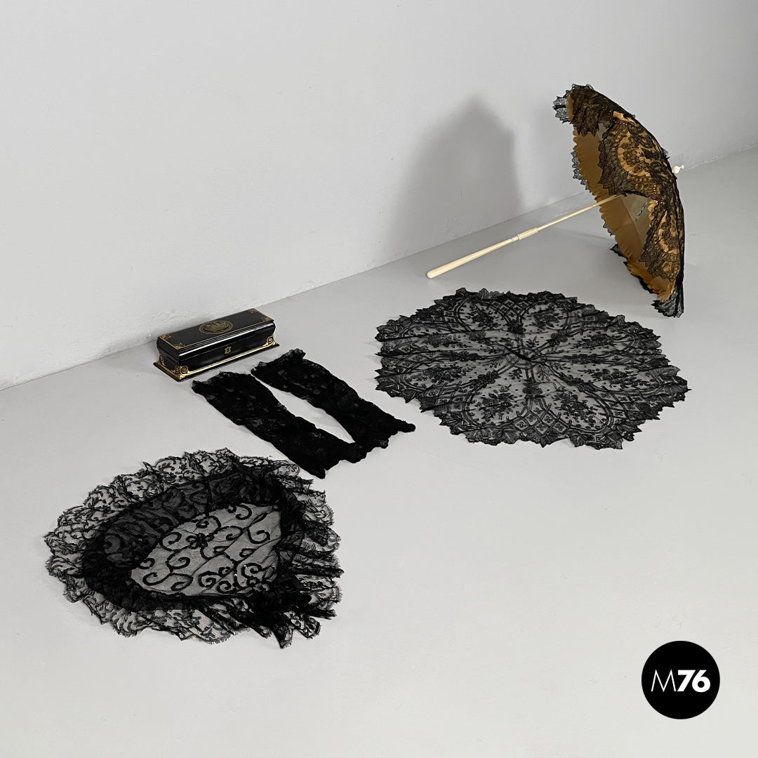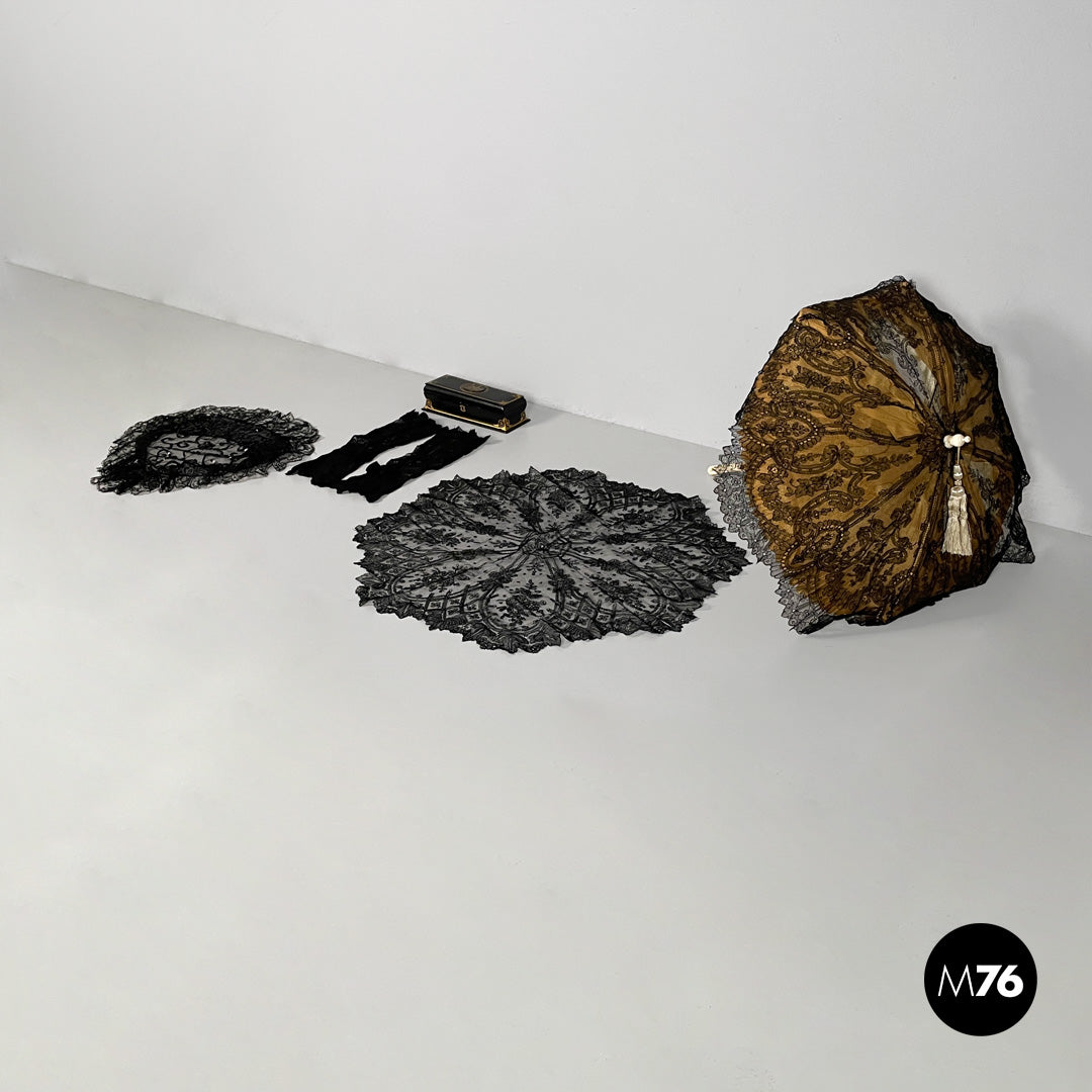 Funeral set consisting of a small umbrella with a spare lace cover, a box containing a pair of gloves, and a headdress. The umbrella has a light-colored frame and an ochre fabric cover decorated with black lace. A pair of black lace muffs with a velvet bow are housed in a rectangular black wooden box with gold oriental-style decorations. The interior of the box is lined with paper and red velvet. The set ends with a black lace headdress with sequins and a bow. Early 1900s style.