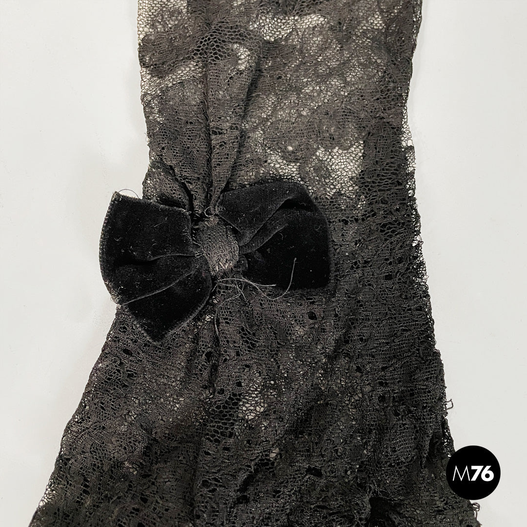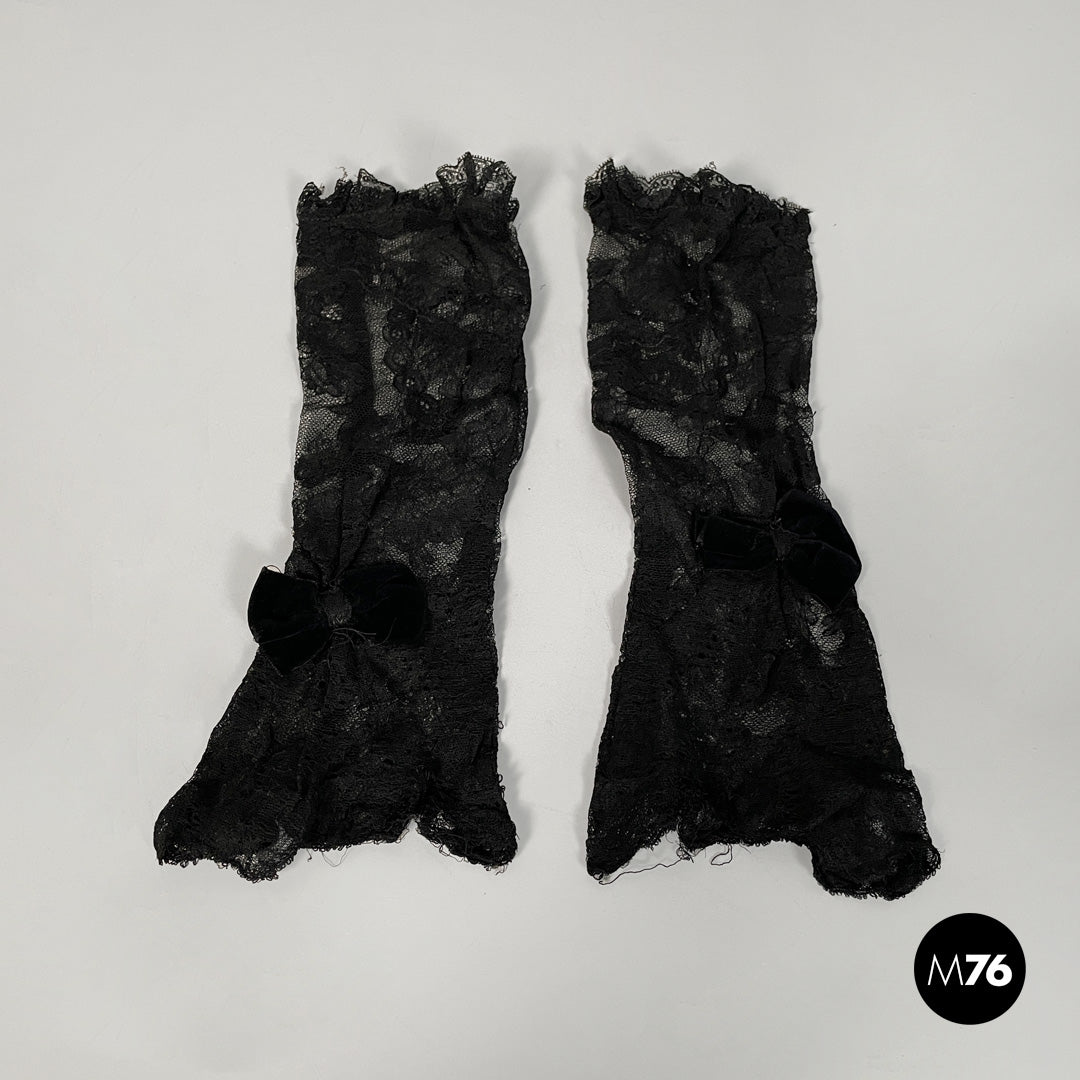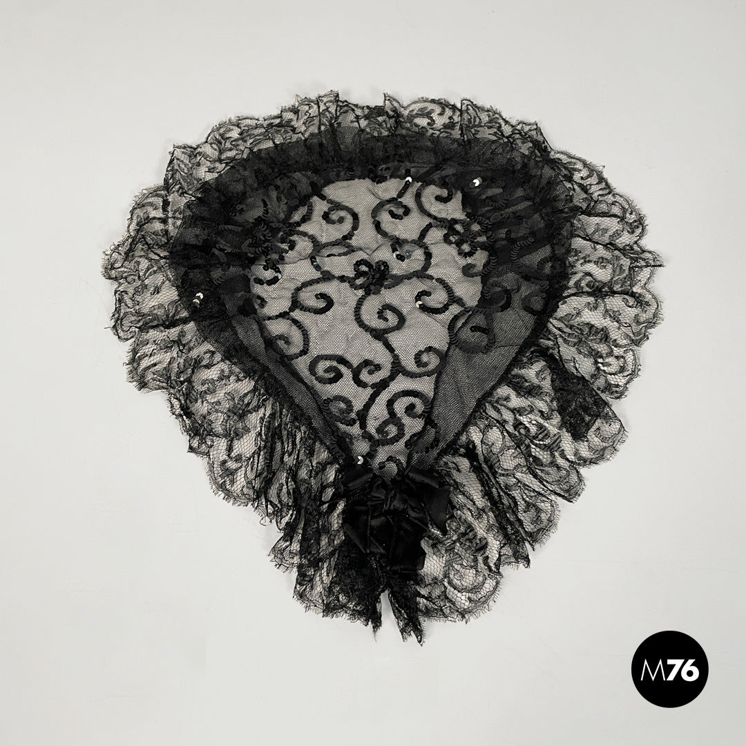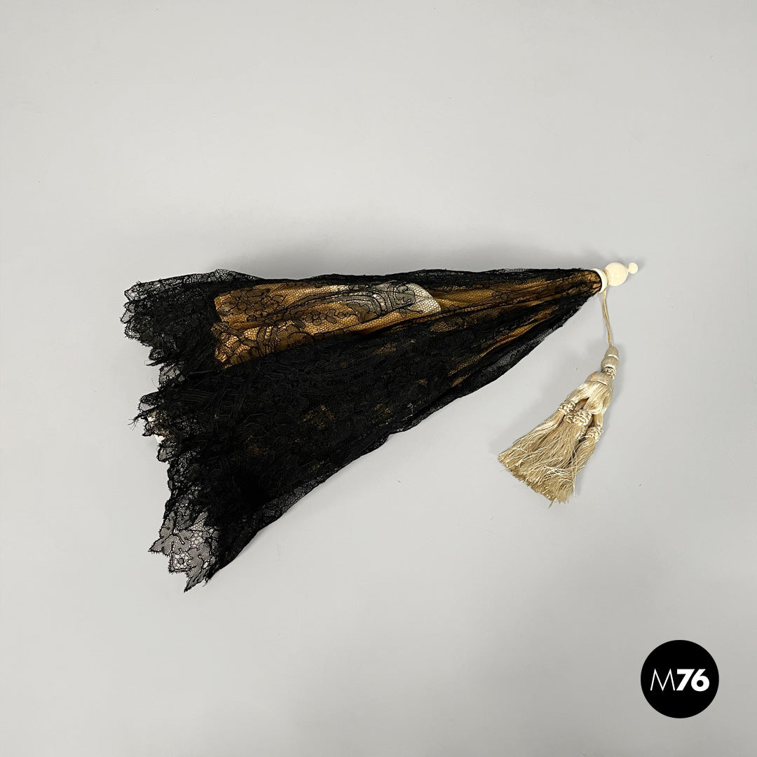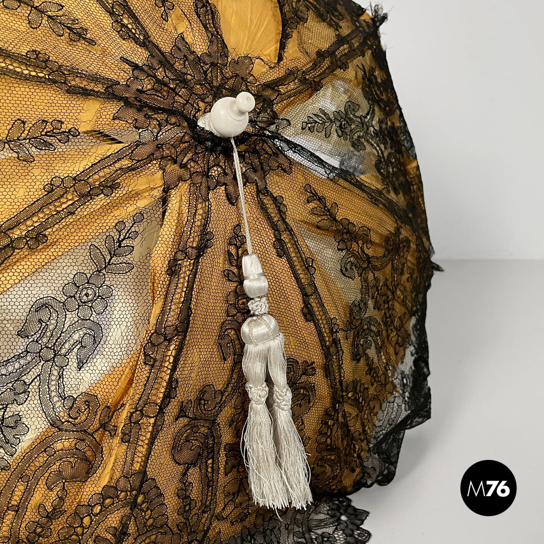 Funeral set consisting of a small umbrella with a spare lace cover, a box containing a pair of gloves, and a headdress. The umbrella has a light-colored frame and an ochre fabric cover decorated with black lace. A pair of black lace muffs with a velvet bow are housed in a rectangular black wooden box with gold oriental-style decorations. The interior of the box is lined with paper and red velvet. The set ends with a black lace headdress with sequins and a bow. Early 1900s style.