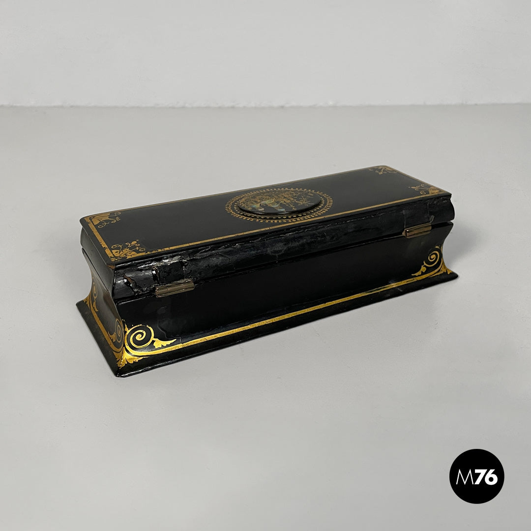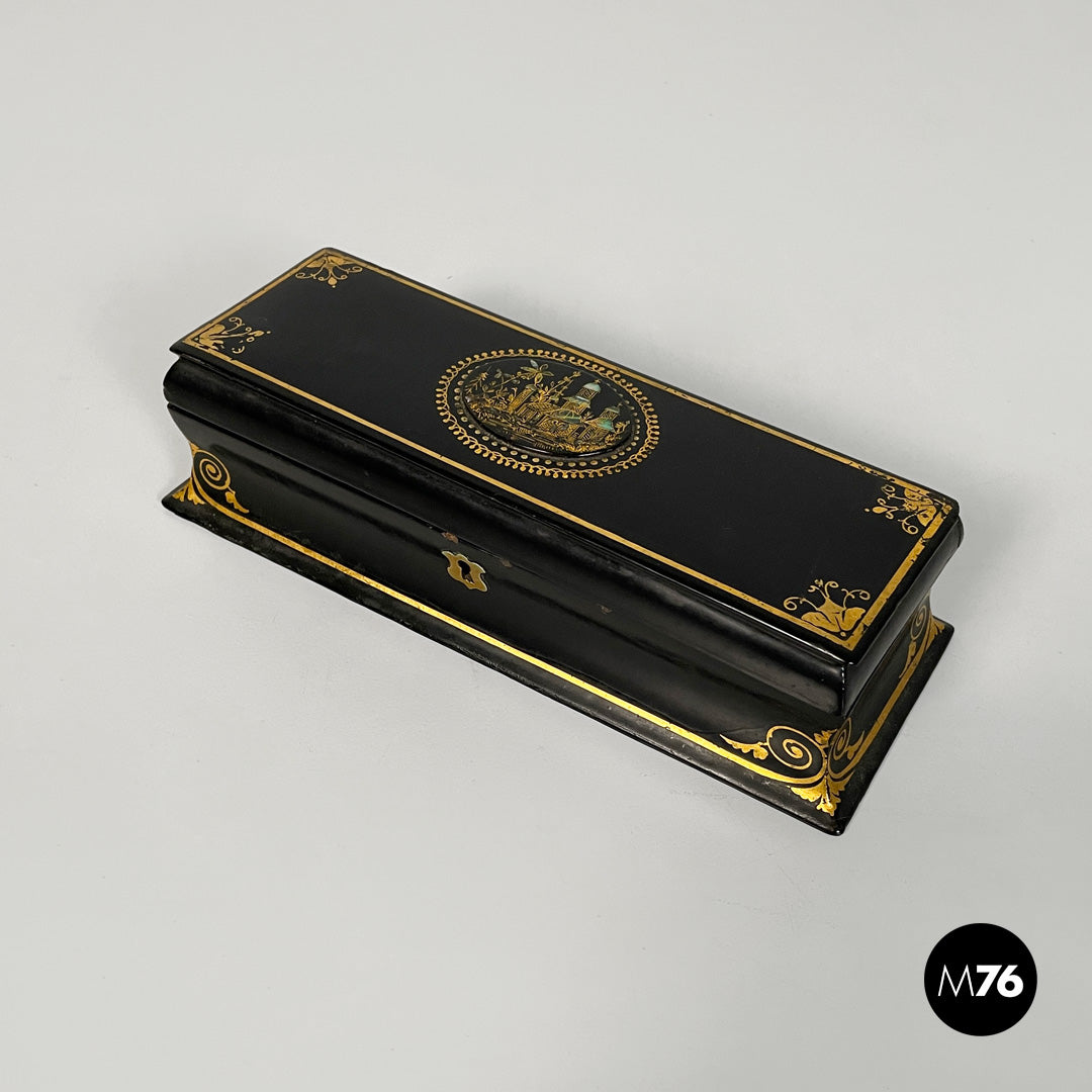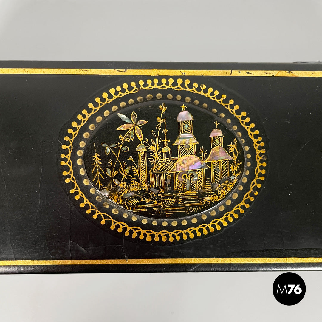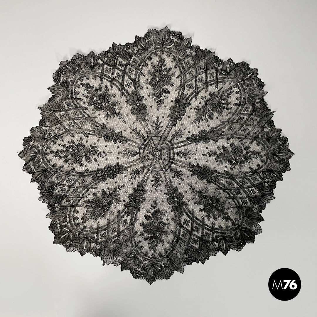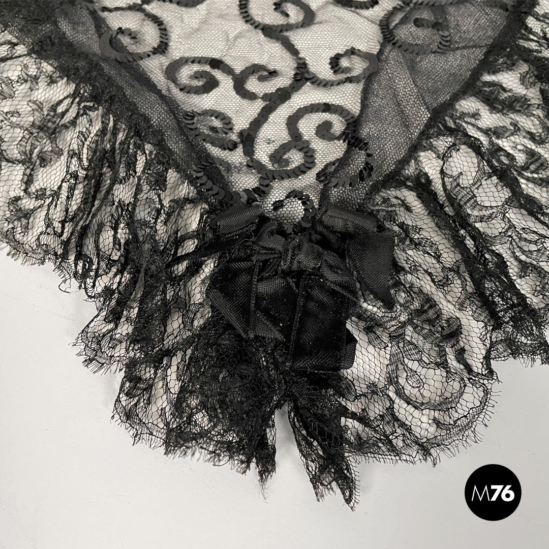 Funeral set consisting of a small umbrella with a spare lace cover, a box containing a pair of gloves, and a headdress. The umbrella has a light-colored frame and an ochre fabric cover decorated with black lace. A pair of black lace muffs with a velvet bow are housed in a rectangular black wooden box with gold oriental-style decorations. The interior of the box is lined with paper and red velvet. The set ends with a black lace headdress with sequins and a bow. Early 1900s style.