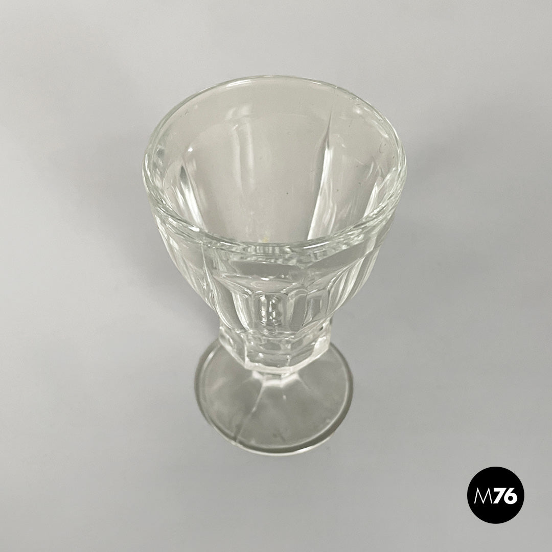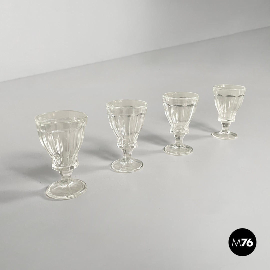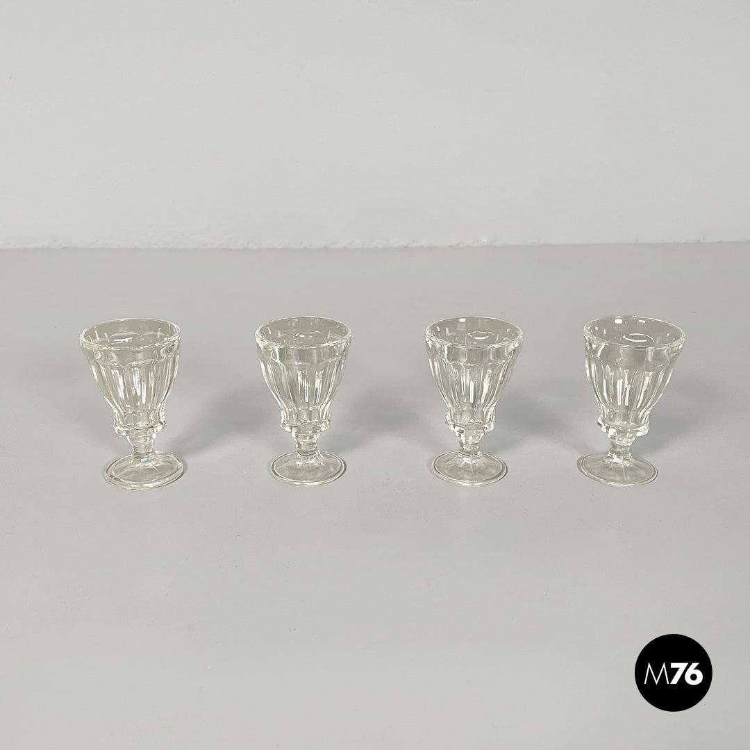 Set of four glasses in thick, clear, worked glass. The glass has a classic goblet shape, with a faceted bowl featuring subtle vertical grooves; the bowl tapers toward the stem. The stem is short and sturdy, while the base is round. They are suitable for liqueurs, bitters, spirits, or tastings.