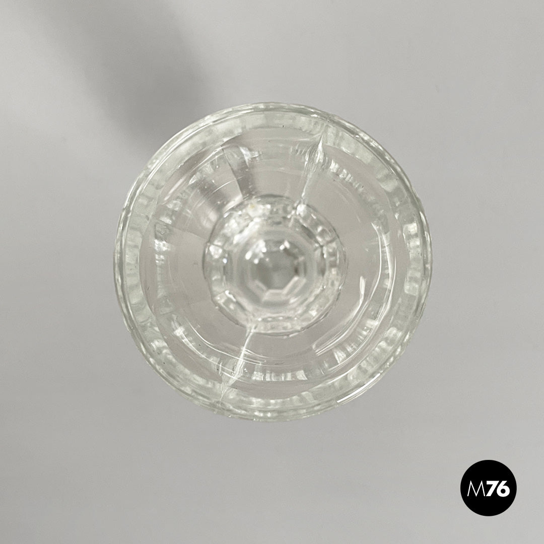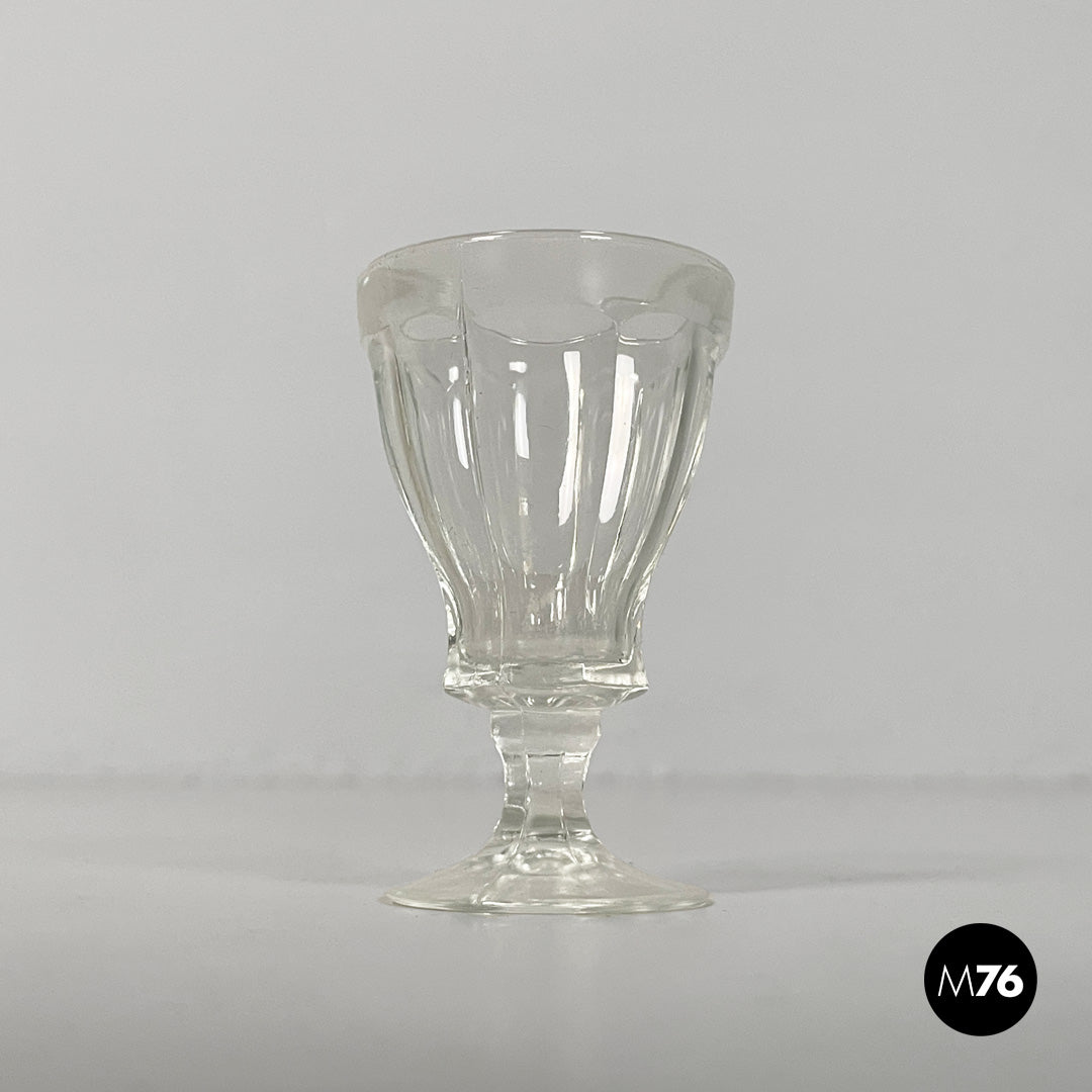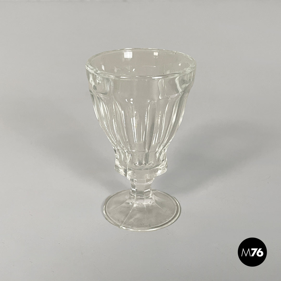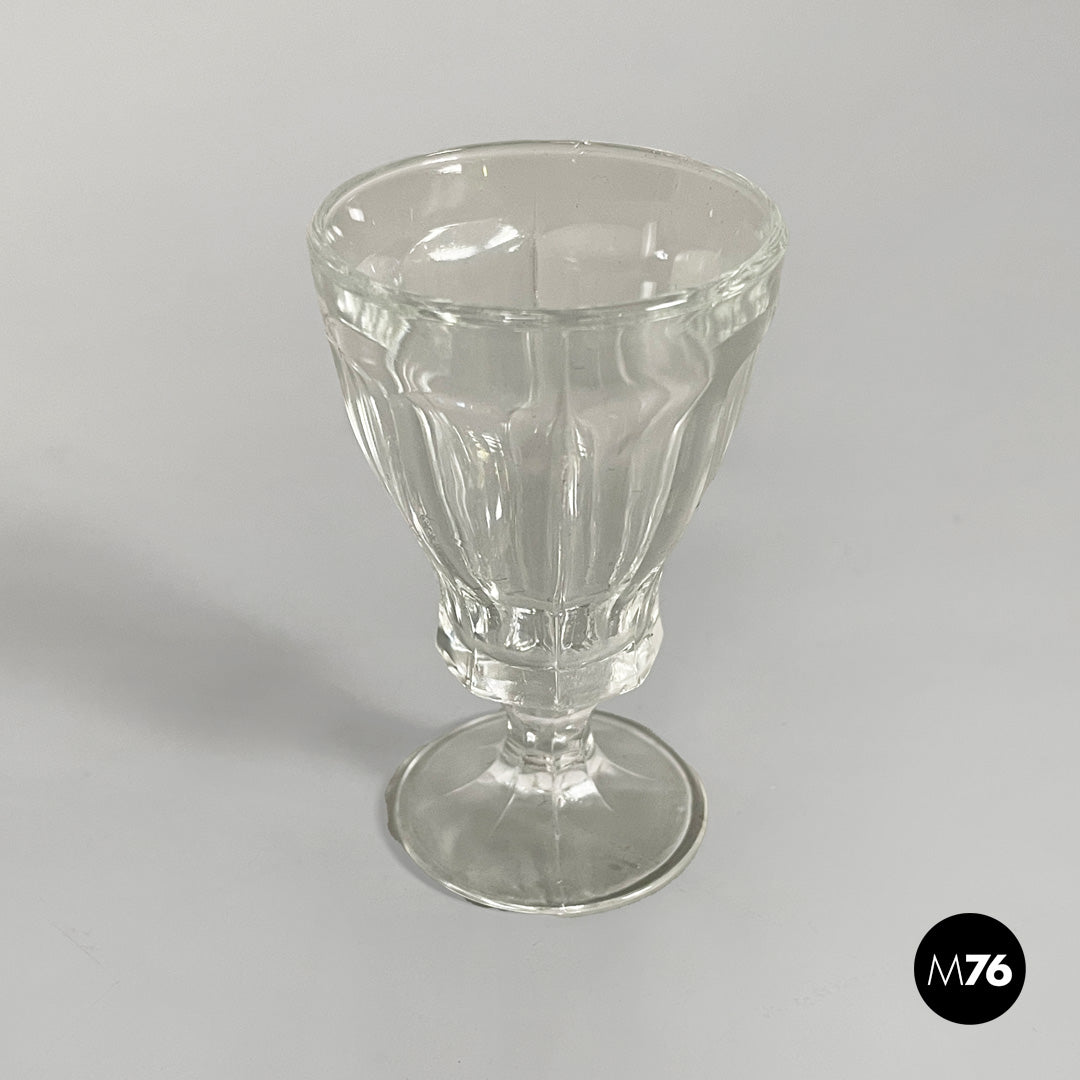 Set of four glasses in thick, clear, worked glass. The glass has a classic goblet shape, with a faceted bowl featuring subtle vertical grooves; the bowl tapers toward the stem. The stem is short and sturdy, while the base is round. They are suitable for liqueurs, bitters, spirits, or tastings.
