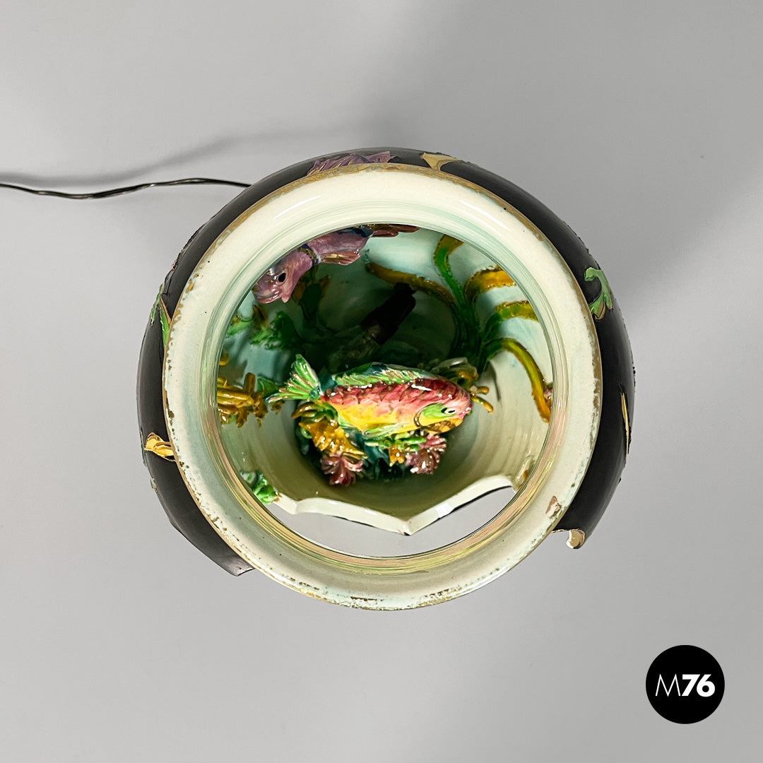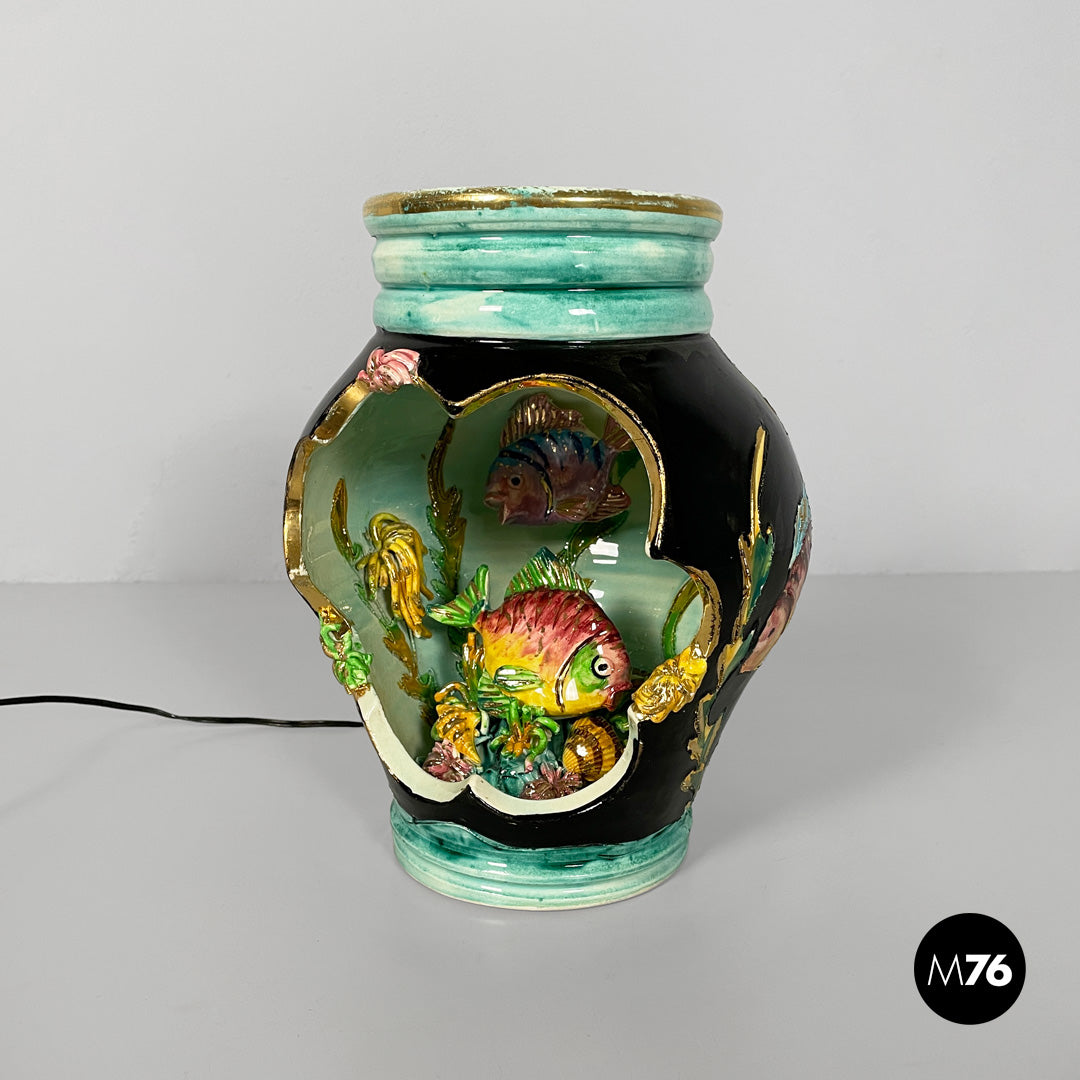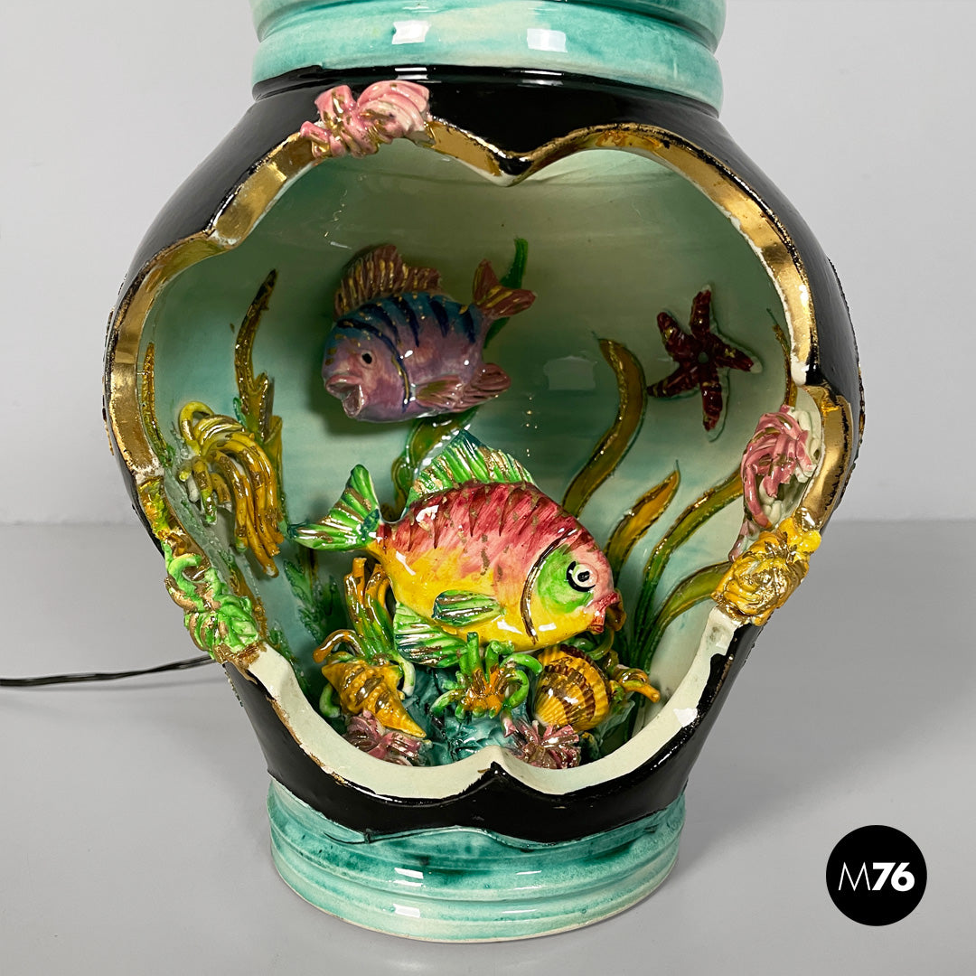 Table lamp made entirely of glazed ceramic. The rounded body features a wide front opening shaped like a wavy frame. The interior decoration depicts a colorful, three-dimensional underwater scene, with two fish, seaweed, coral, and small shells molded in relief. Vibrant hues such as green, turquoise, pink, yellow, and purple dominate; the exterior is partly black with gold trim. The neck of the vase is light blue.