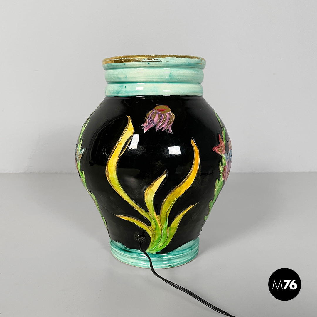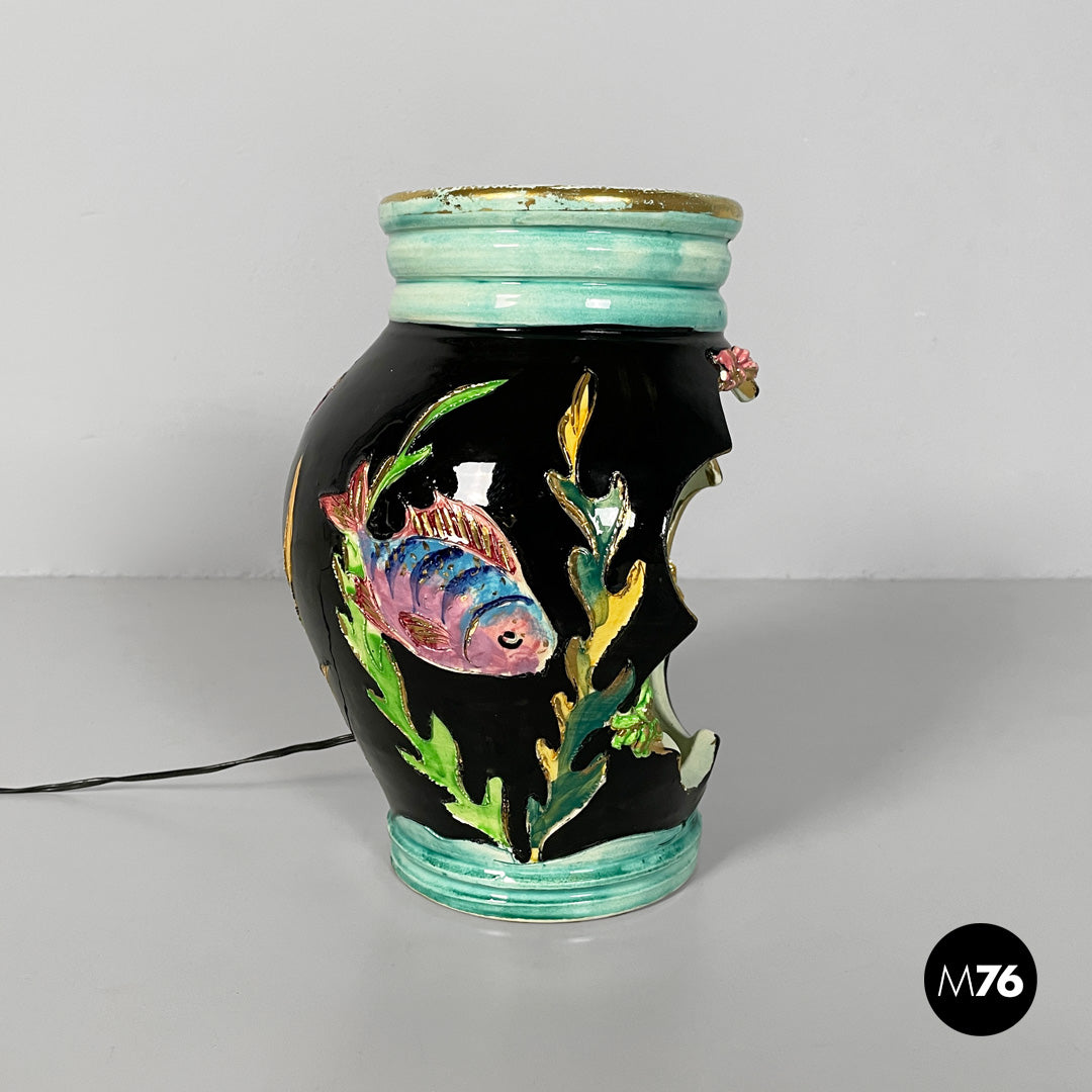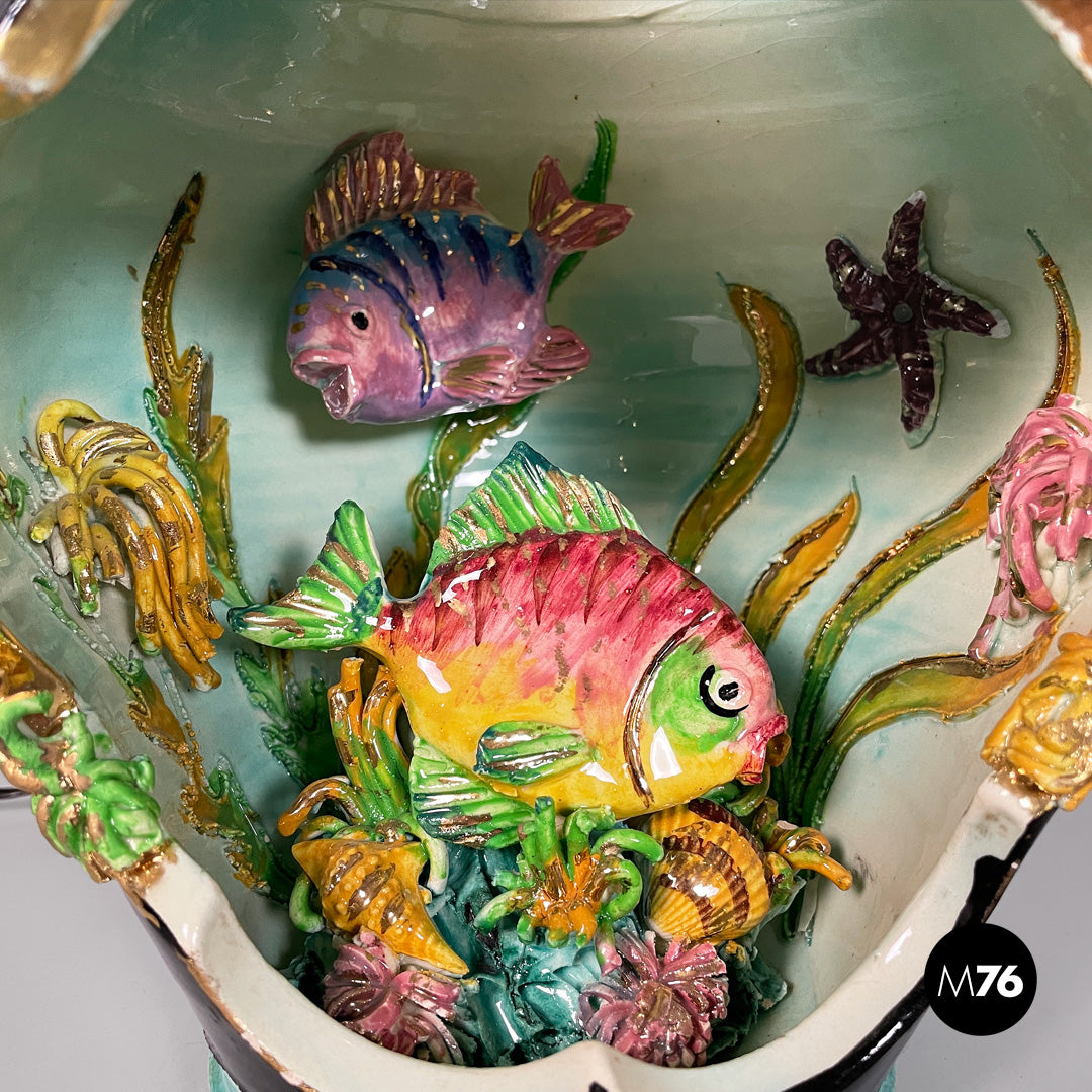 Table lamp made entirely of glazed ceramic. The rounded body features a wide front opening shaped like a wavy frame. The interior decoration depicts a colorful, three-dimensional underwater scene, with two fish, seaweed, coral, and small shells molded in relief. Vibrant hues such as green, turquoise, pink, yellow, and purple dominate; the exterior is partly black with gold trim. The neck of the vase is light blue.