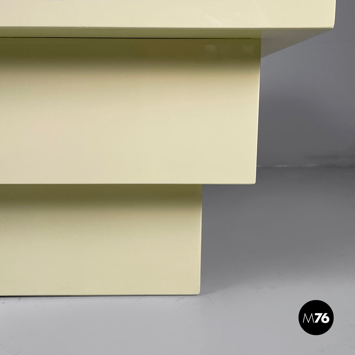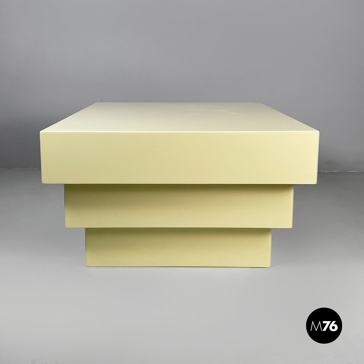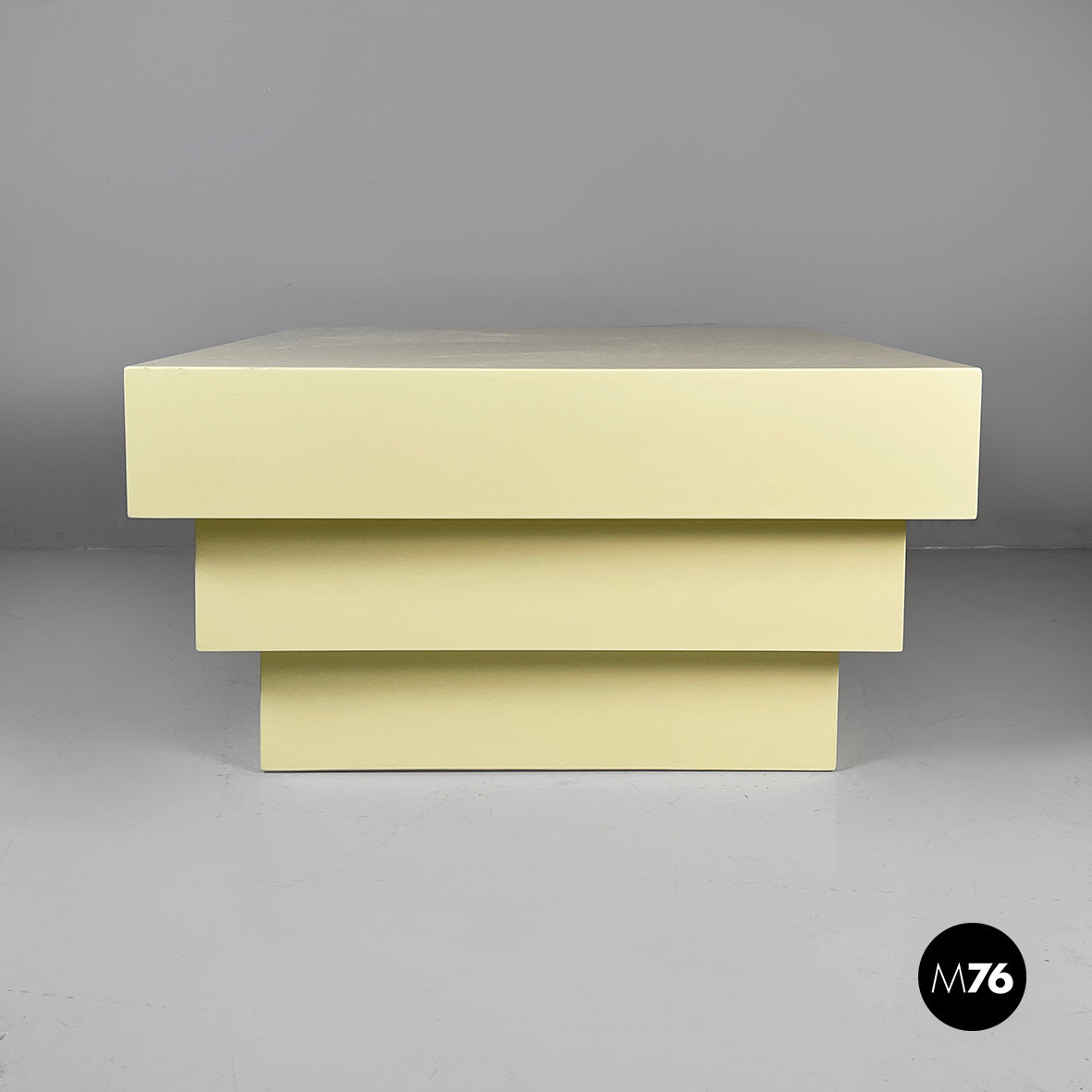 Pedestal or coffee table with a square top, made entirely of light yellow lacquered wood. The ladder-shape structure tapers toward the base. It can be used as a display stand.