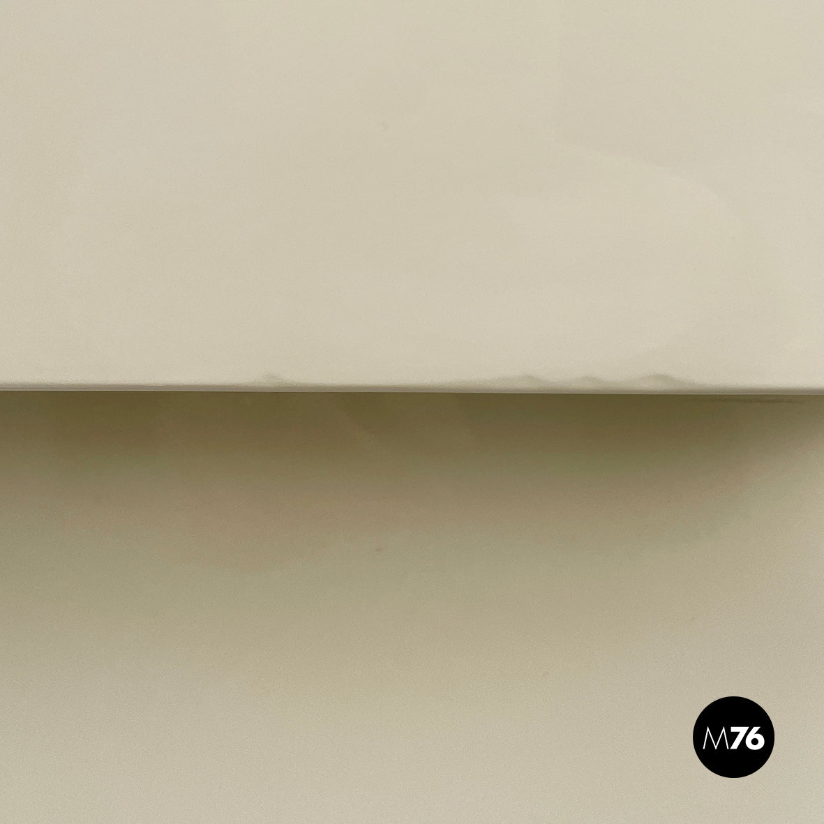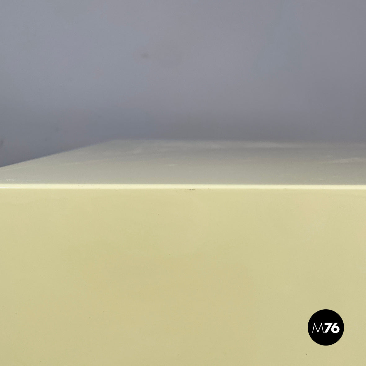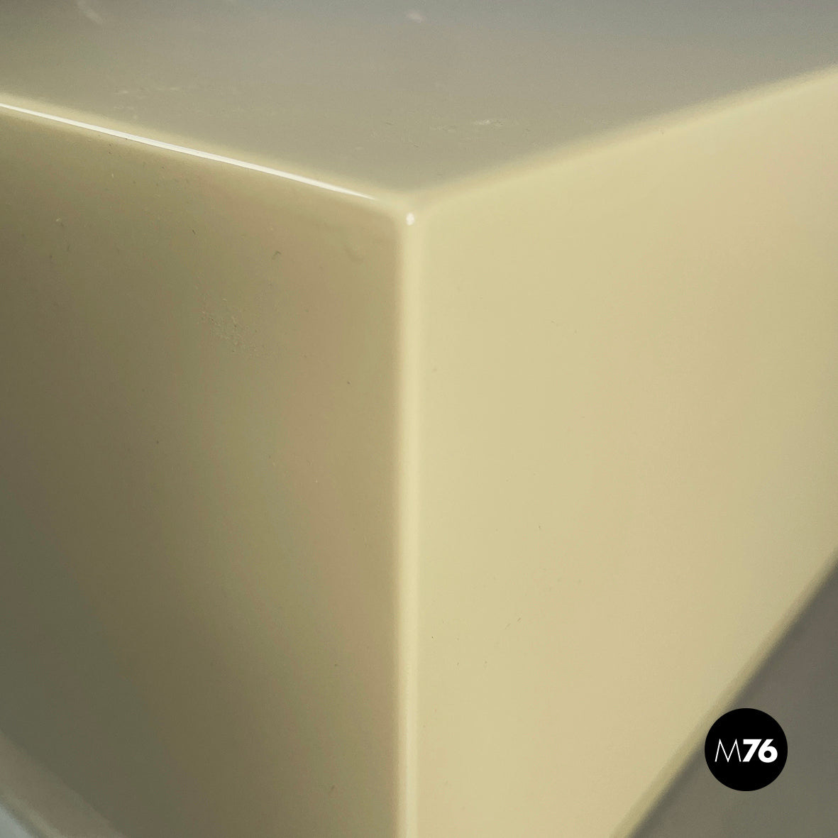 Pedestal or coffee table with a square top, made entirely of light yellow lacquered wood. The ladder-shape structure tapers toward the base. It can be used as a display stand.