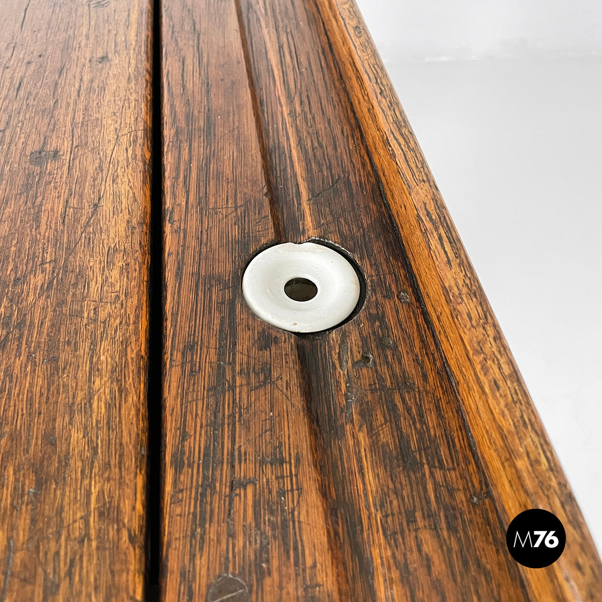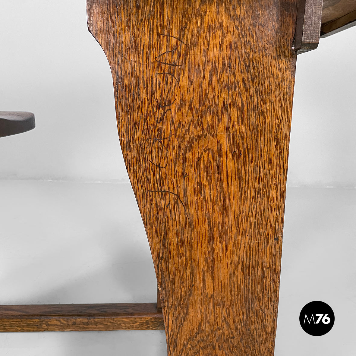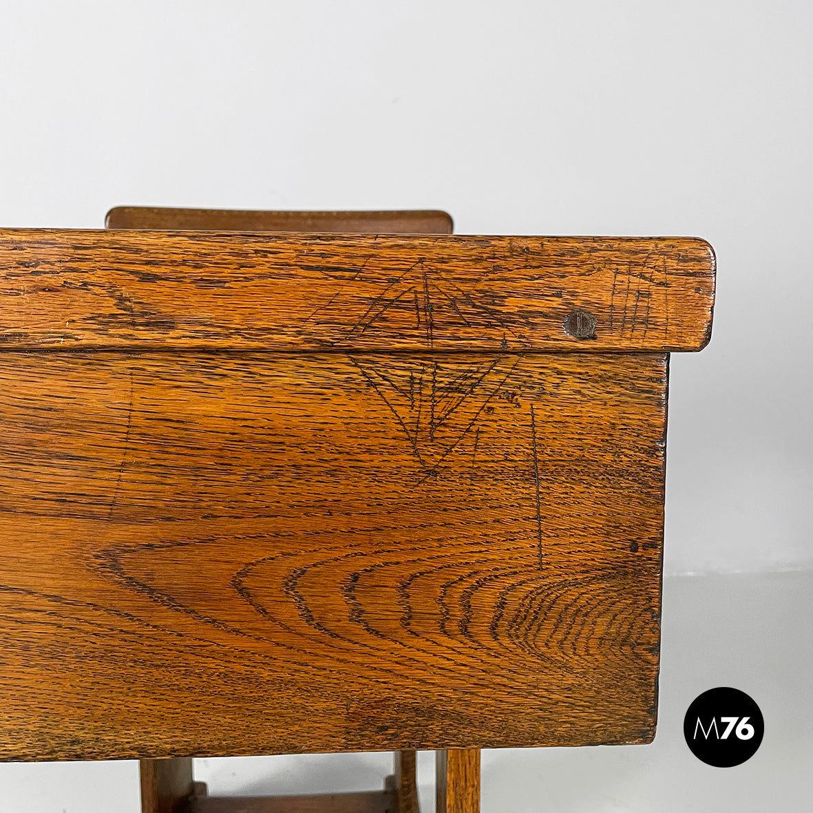 School desk composed by a table and a chair, entirely made of wood. The desk features a small removable white ceramic inkwell, a slanted surface for holding a notebook and an internal compartment. The table has a sliding mechanism for sitting. The chair features a slatted backrest and a contoured seat. The chair and desk are connected at the base.