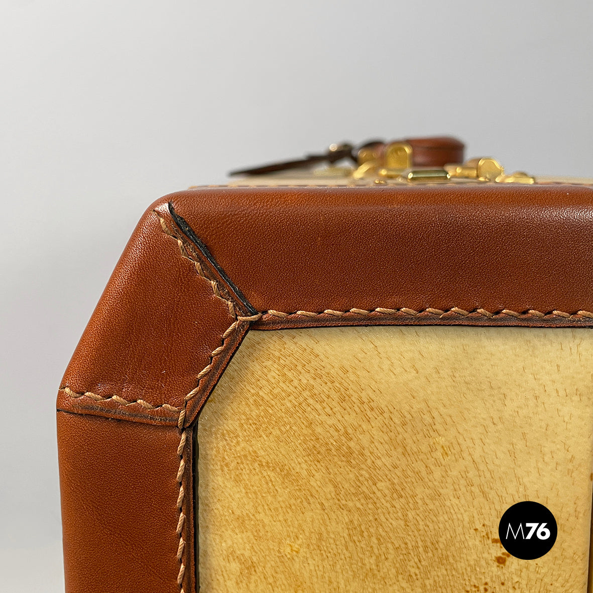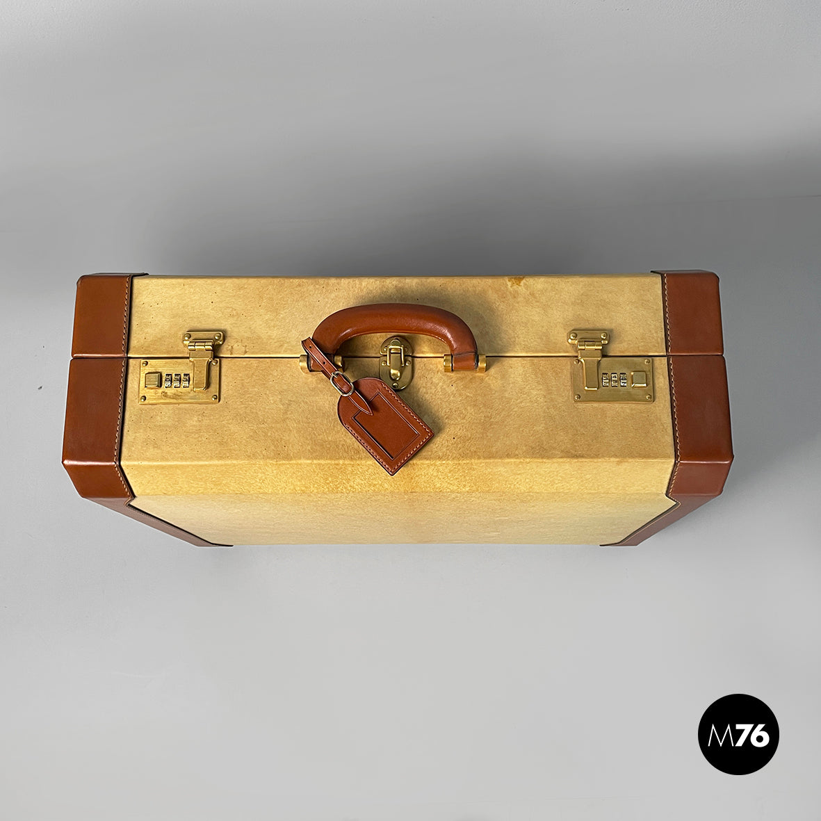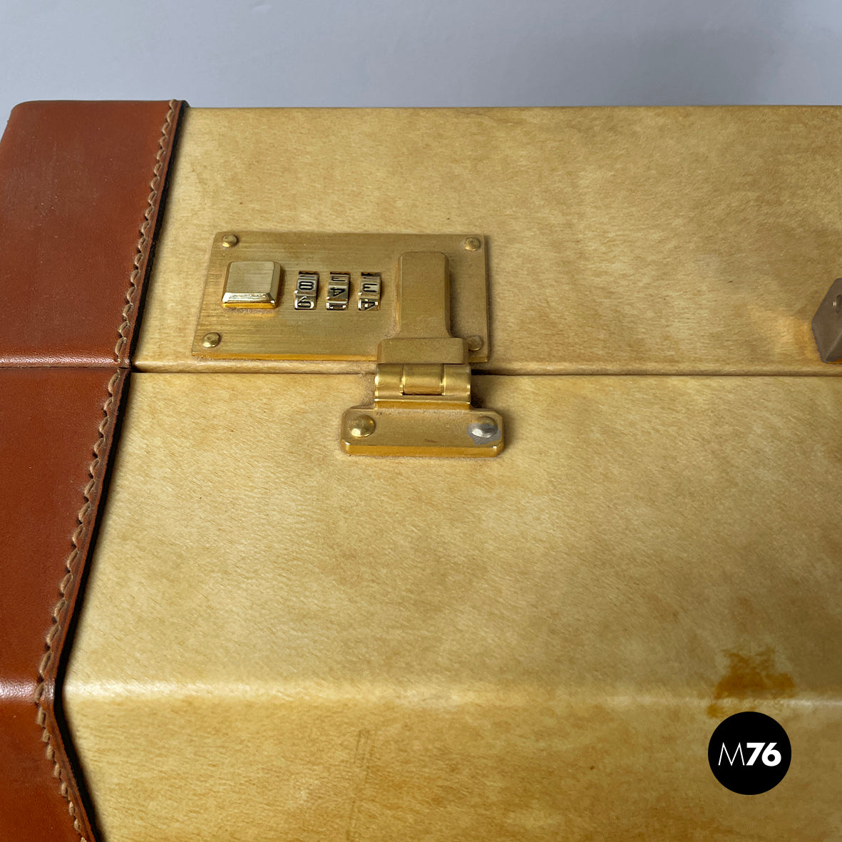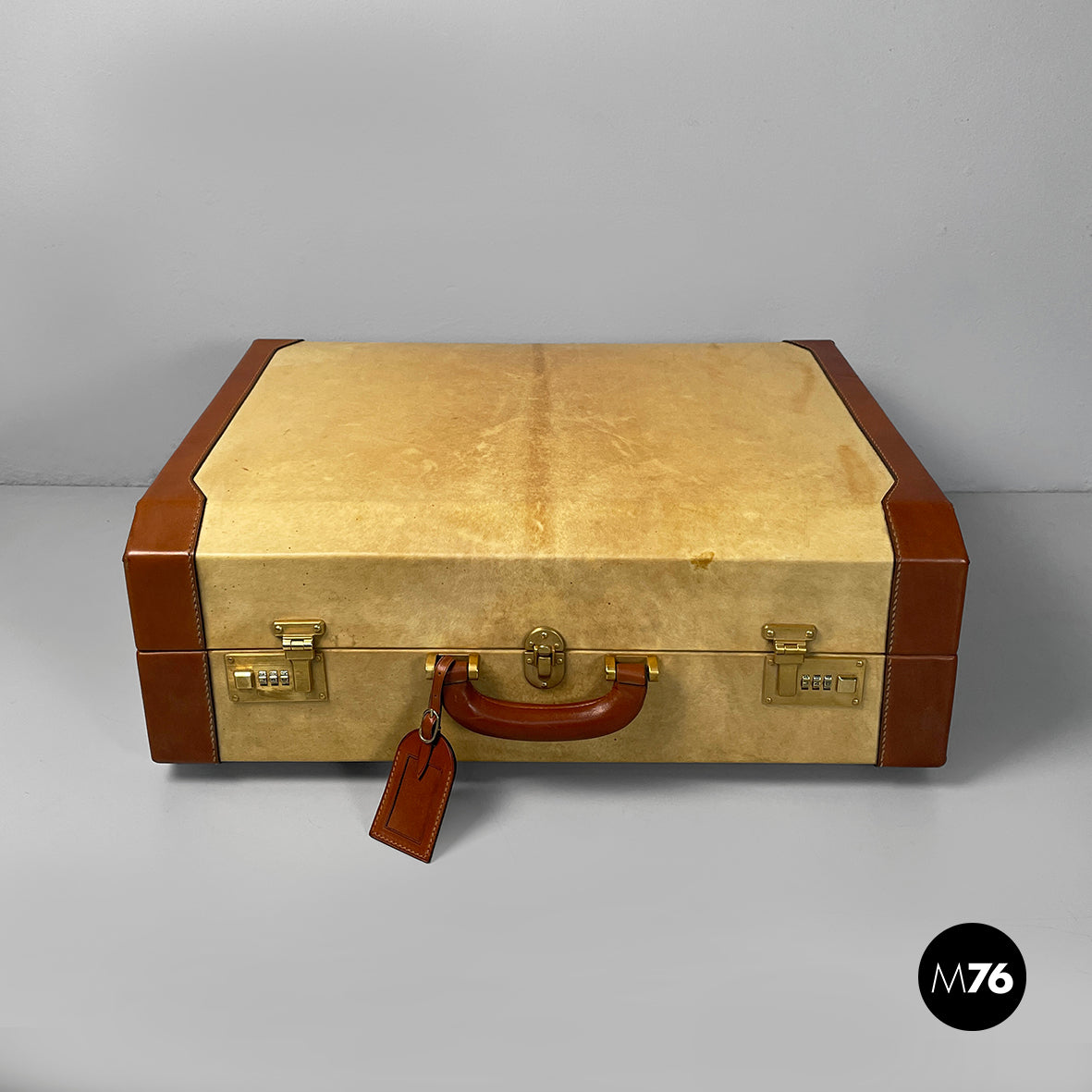 Rectangular beige leather suitcase with brown leather profile and corners. Brown leather handle with leather card holder. The luggage has brass combination lock. Inside there are brown leather straps