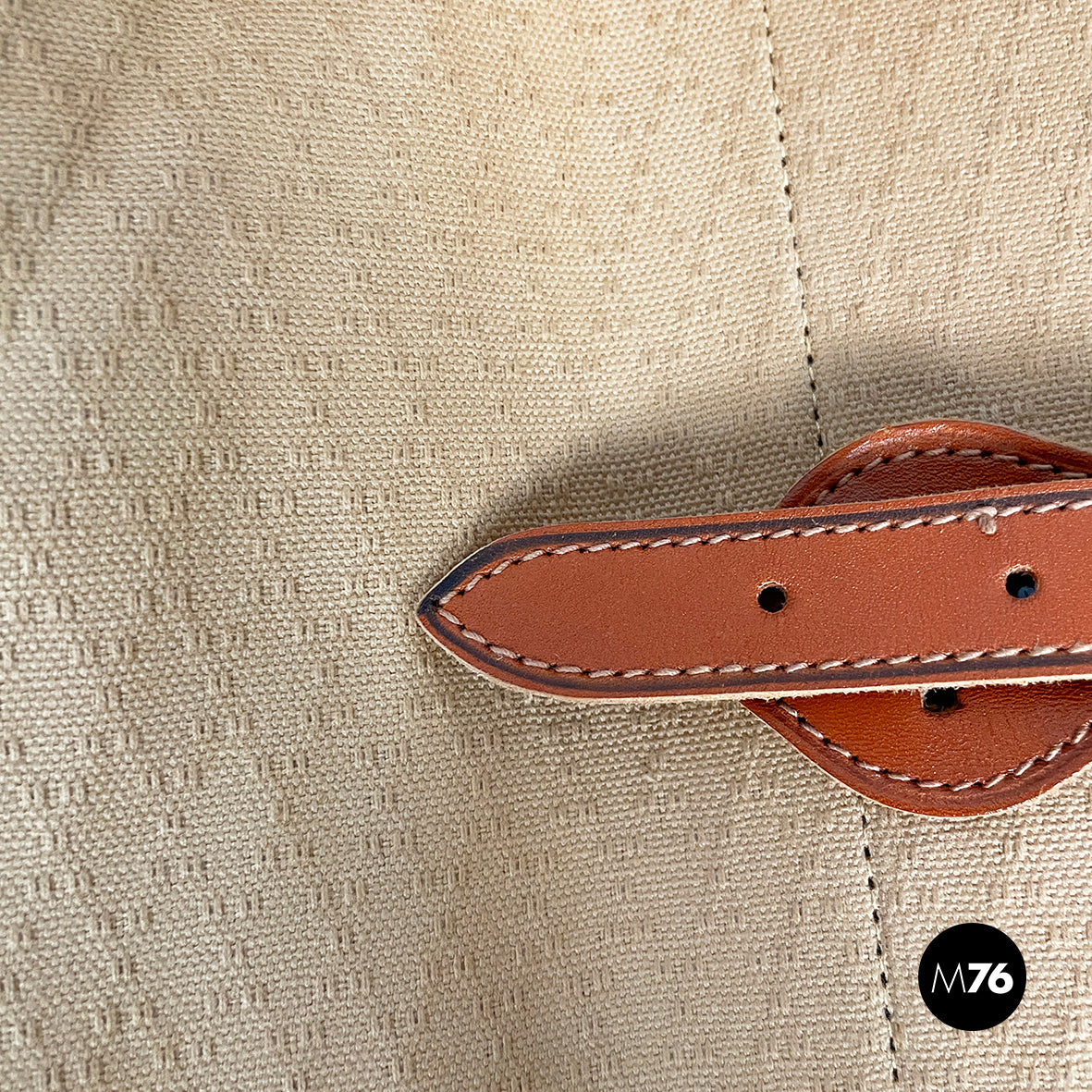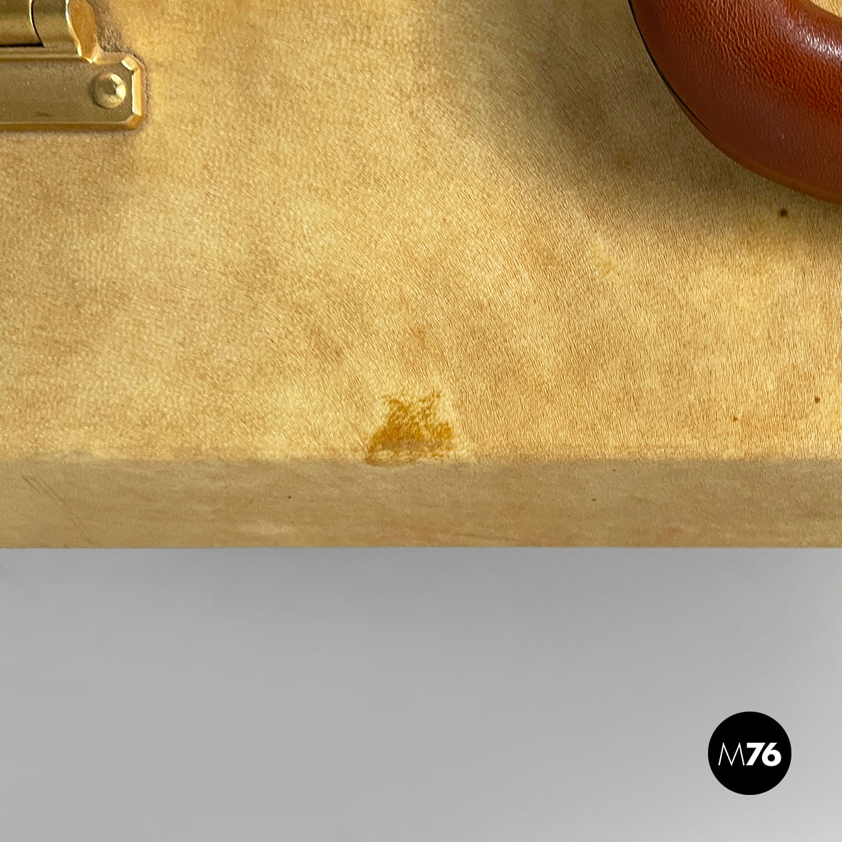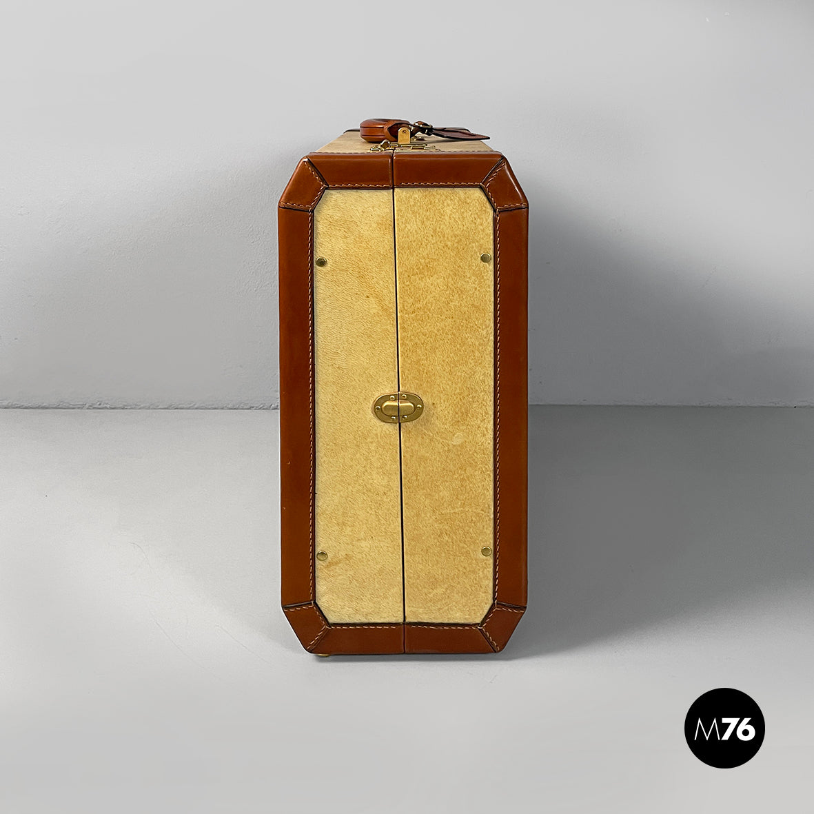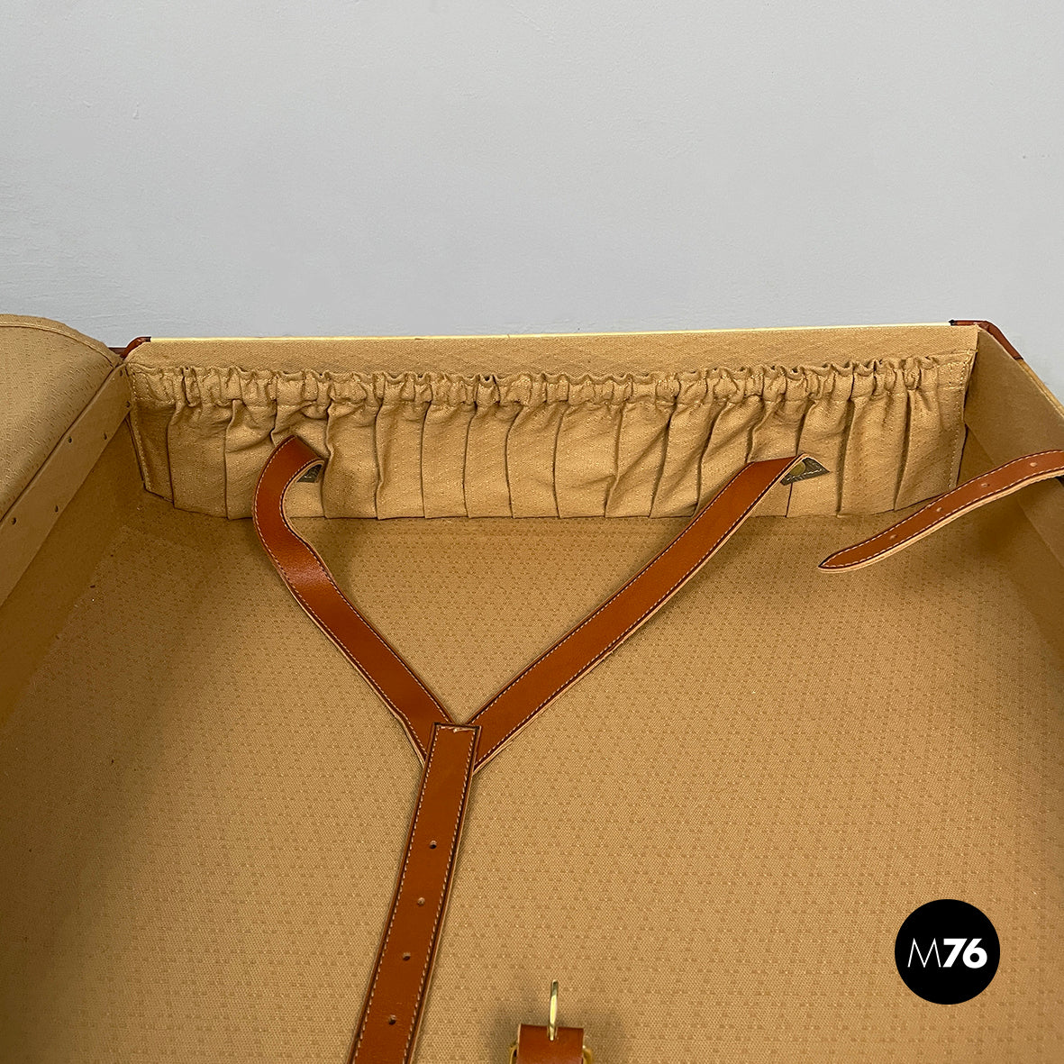 Rectangular beige leather suitcase with brown leather profile and corners. Brown leather handle with leather card holder. The luggage has brass combination lock. Inside there are brown leather straps