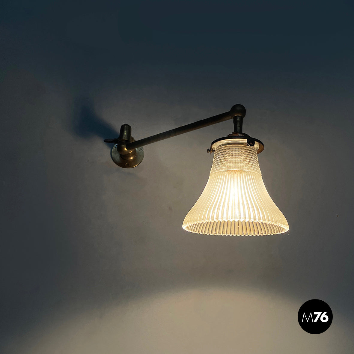 Wall lamp with a glass diffuser. The structure consists of a movable arm made of brass rod. Round brass wall mount.