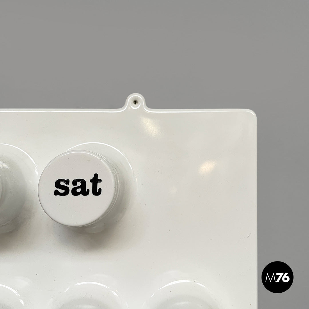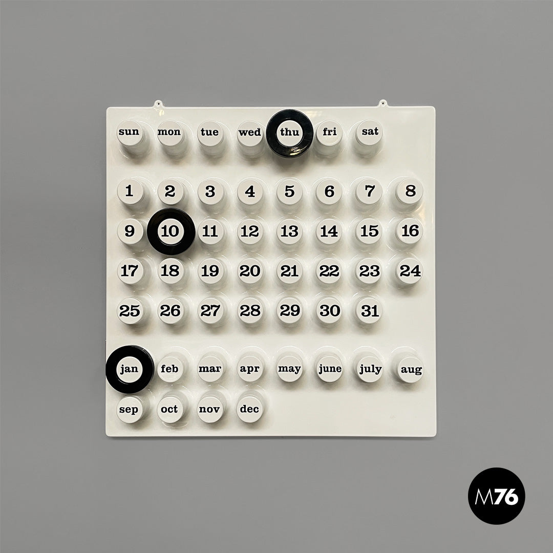 Wall perpetual calendar in white plastic. The calendar has several protruding cylinders: these correspond to the days of the week in the upper part, to the numbers in the central part and to the months in the lower part. It is possible to mark the days and months thanks to a black plastic ring. The ring can be requested in other colors.