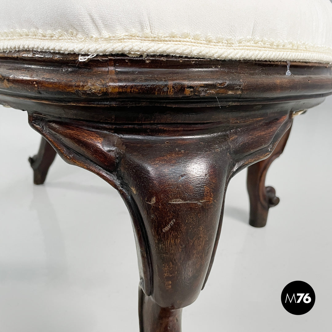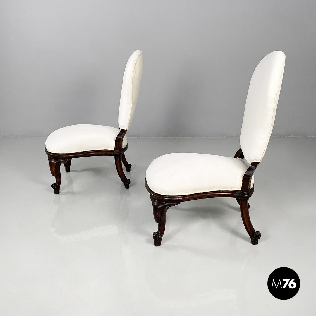 Pair of armchairs with padded seats upholstered in white fabric with matching trim. The wooden frame features curved, carved legs and feet with decorative curls. 19th-century style.