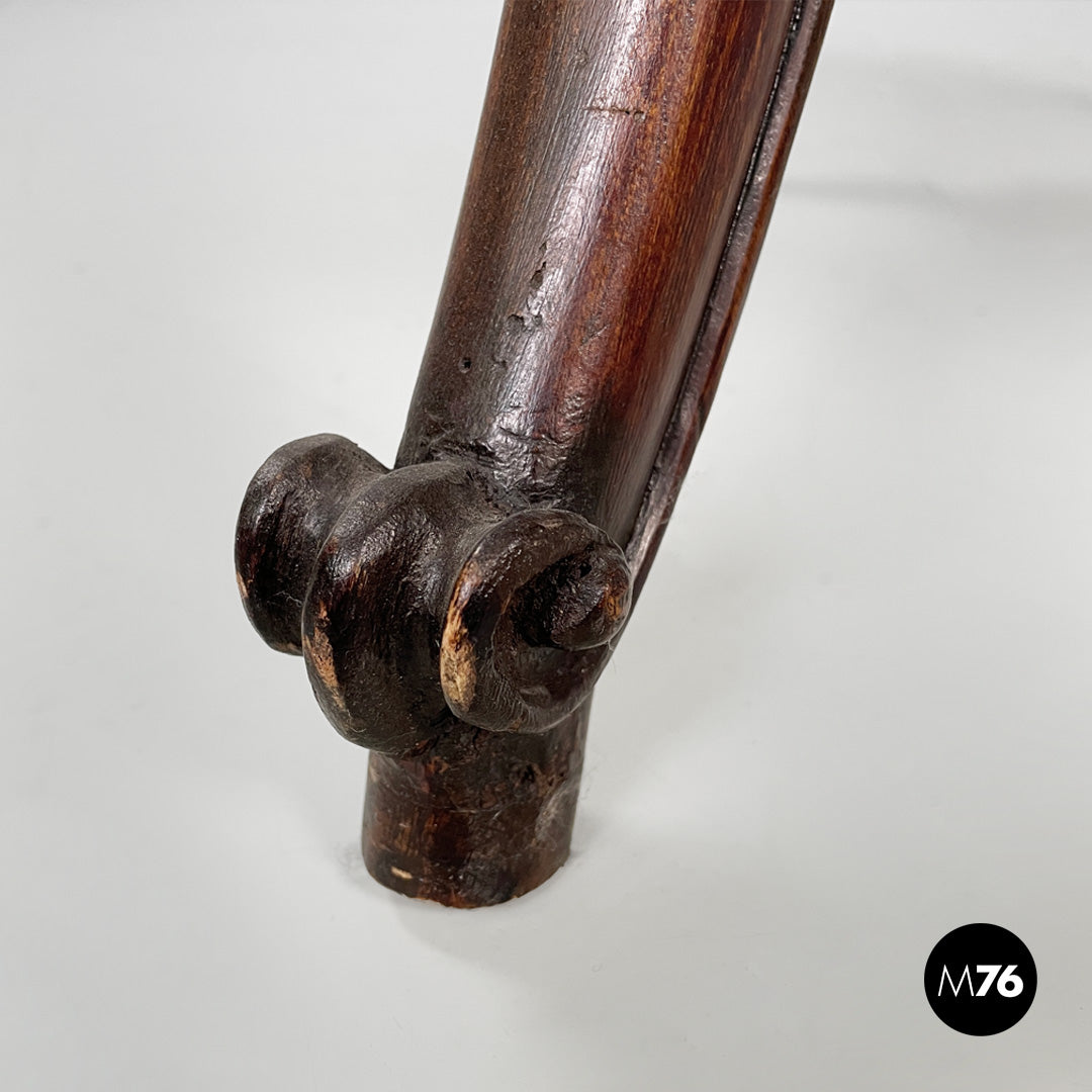 Fair condition, with some missing parts and several marks on the wood. Fully reupholstered.