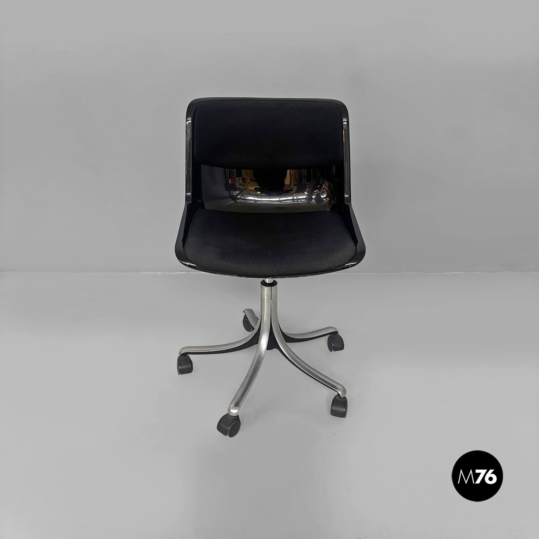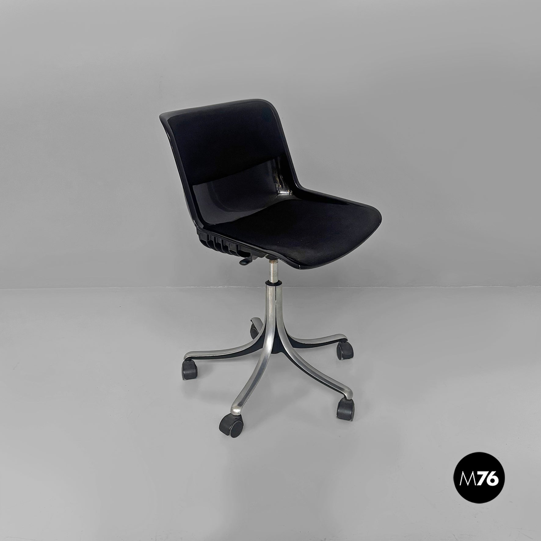 Office or desk chair model Modus with a black plastic monocoque seat and backrest, with padded cushions upholstered in black fabric. Under the seat there is a black-painted metal structure with a lever for adjusting the seat height. The base is made of tubular metal. The five-spokes base, made of metal and black-painted metal, is equipped with five black casters for feet.