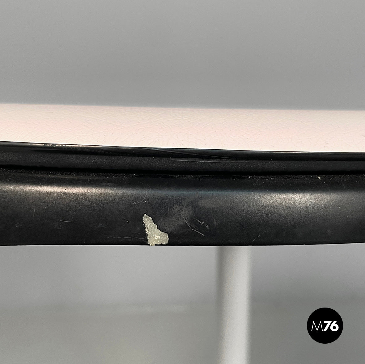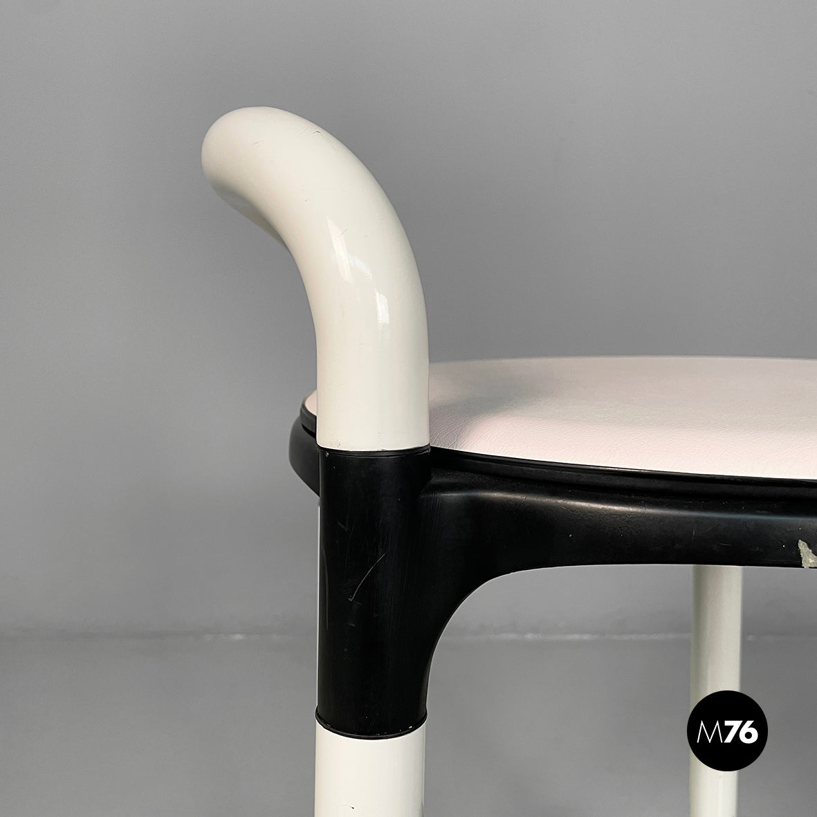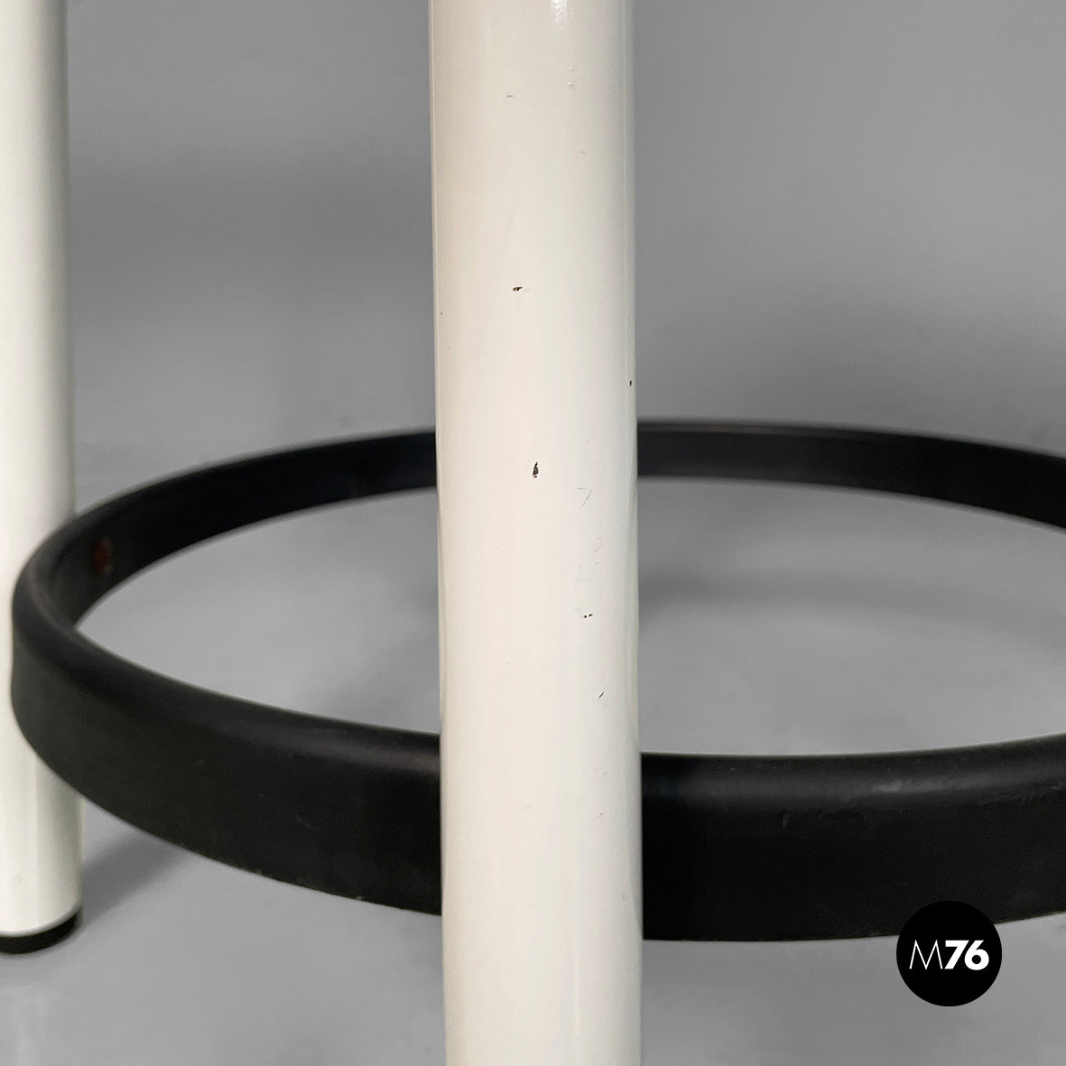 Pair of bar stools in different colors. One stool has round seat, padded and upholstered in white faux leather, with black metal and plastic structure and legs with round section. The other stool has  round seat, padded and upholstered in light pink-white leatherette, with white metal and black plastic structure and legs with round section.