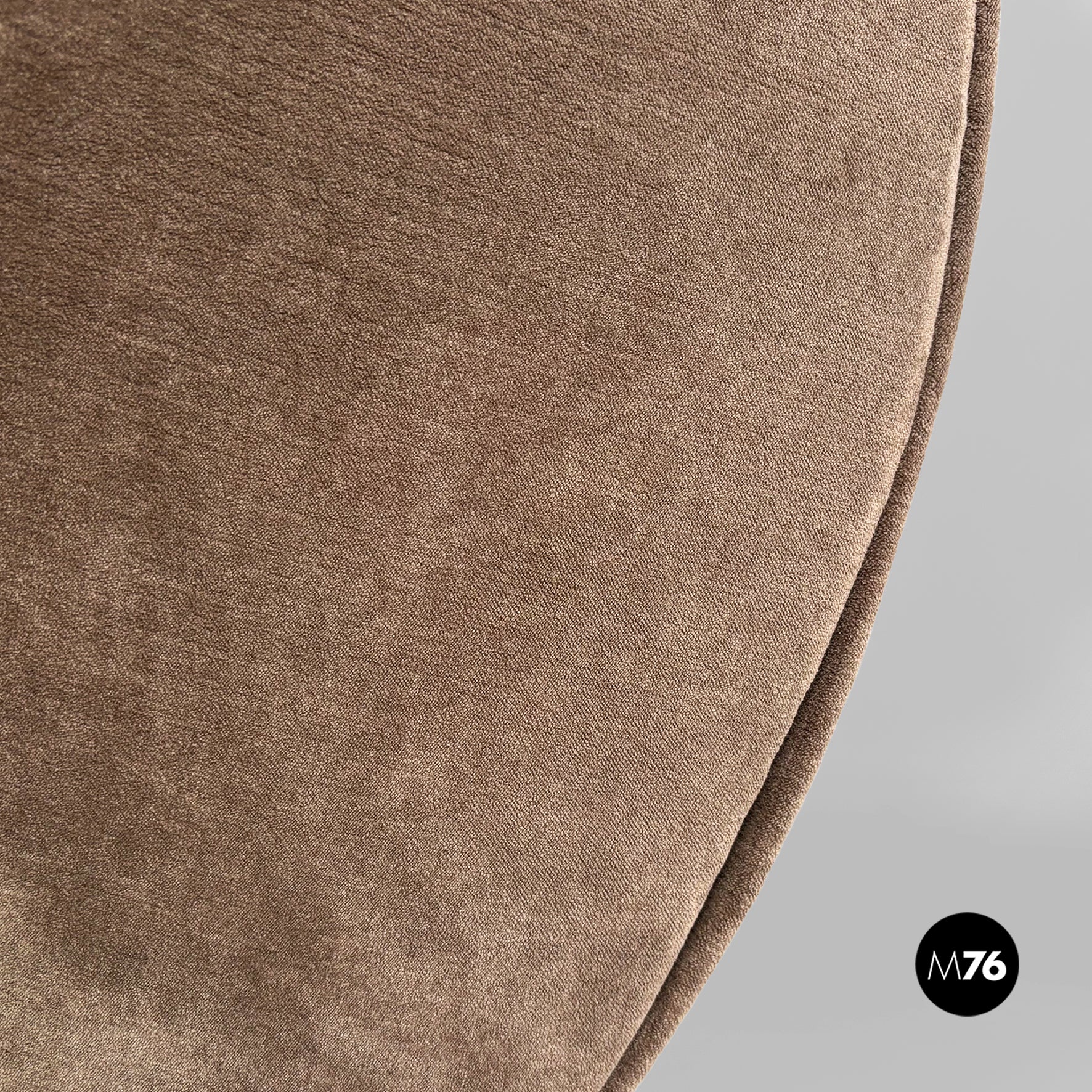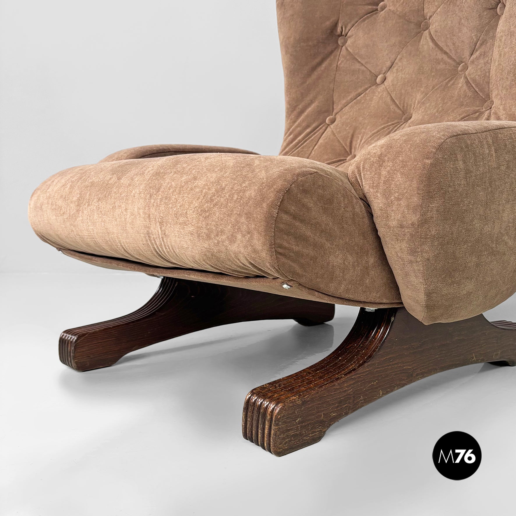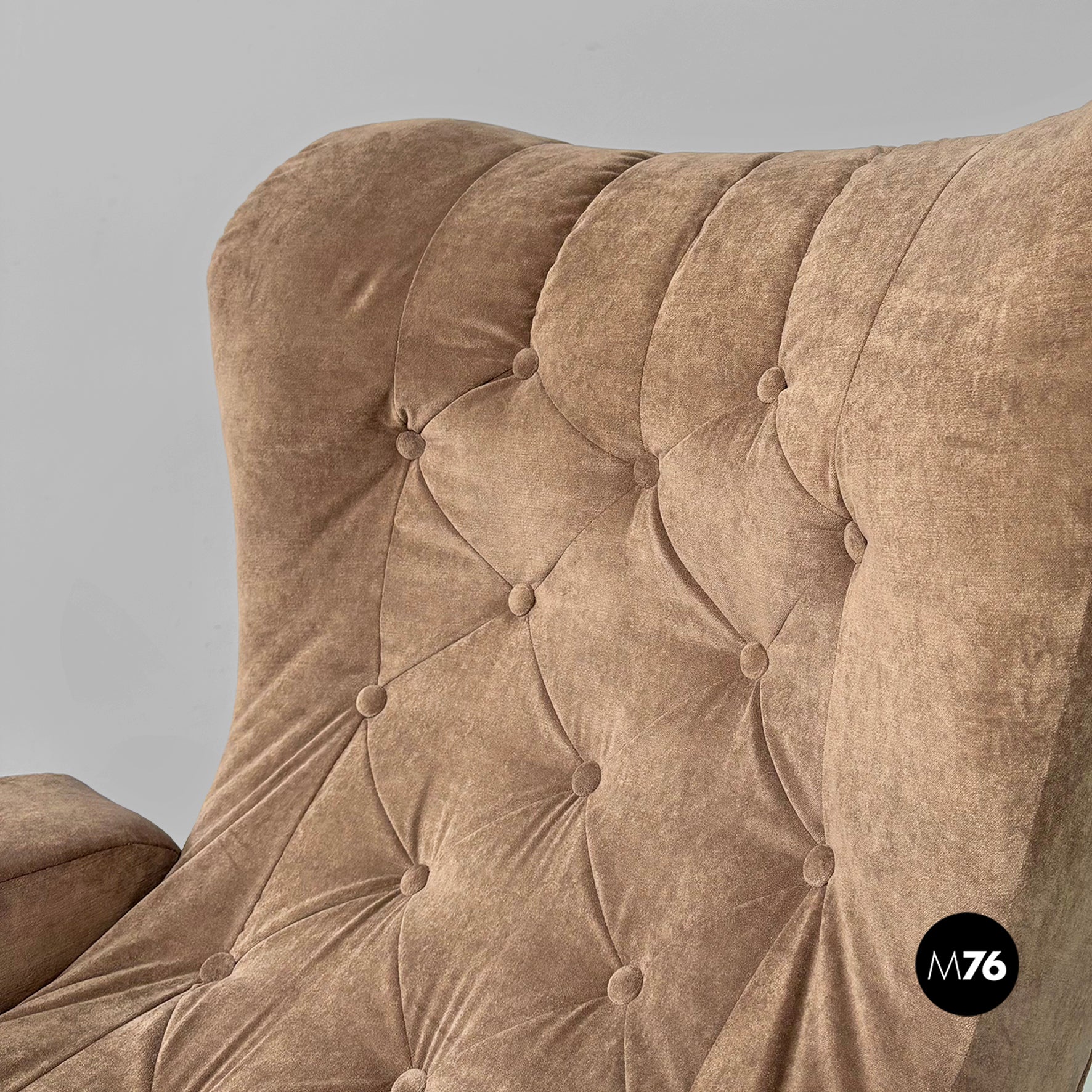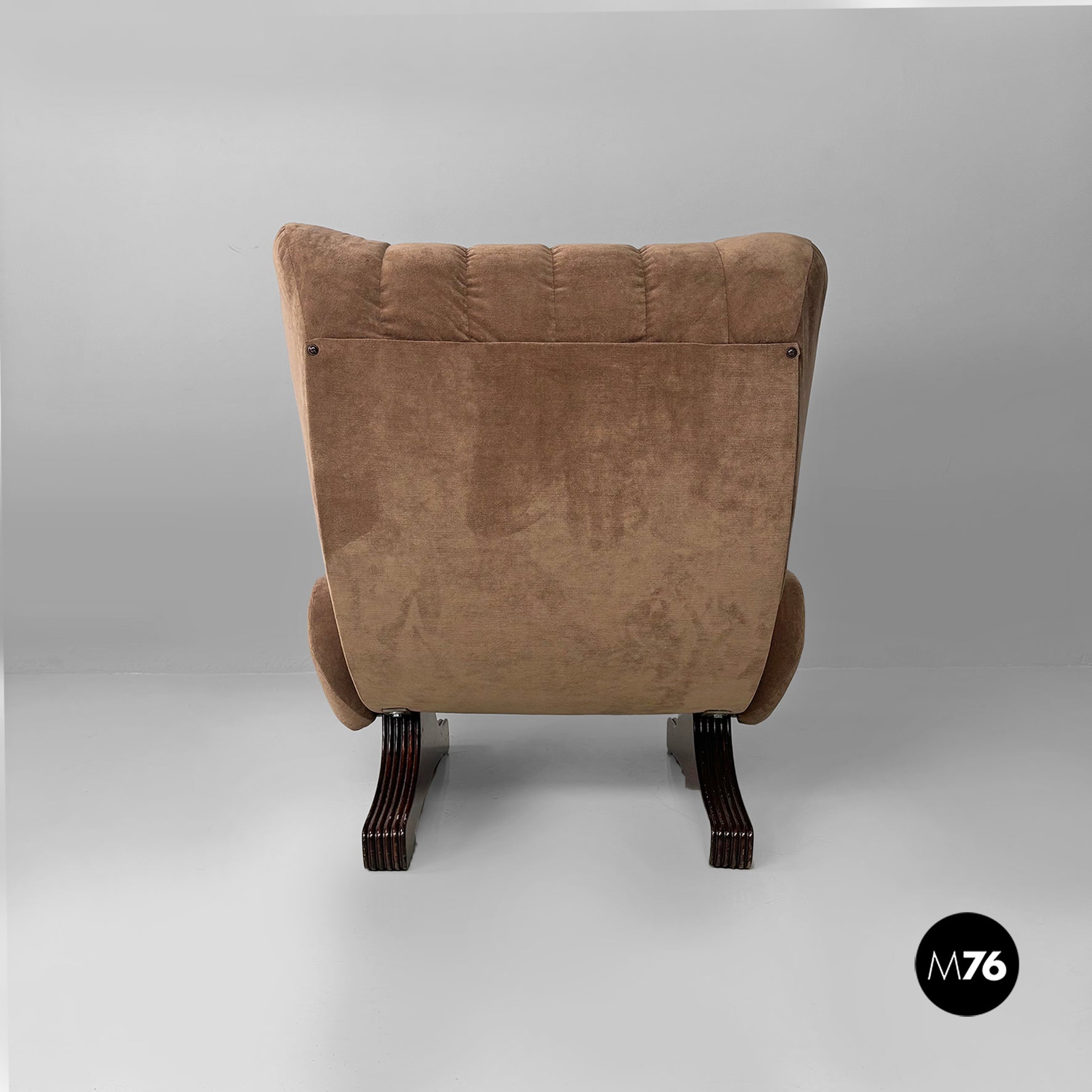 Armchair with seat, backrest and armrests, padded and upholstered in light brown velvet. The two wooden legs feature decorative grooves.