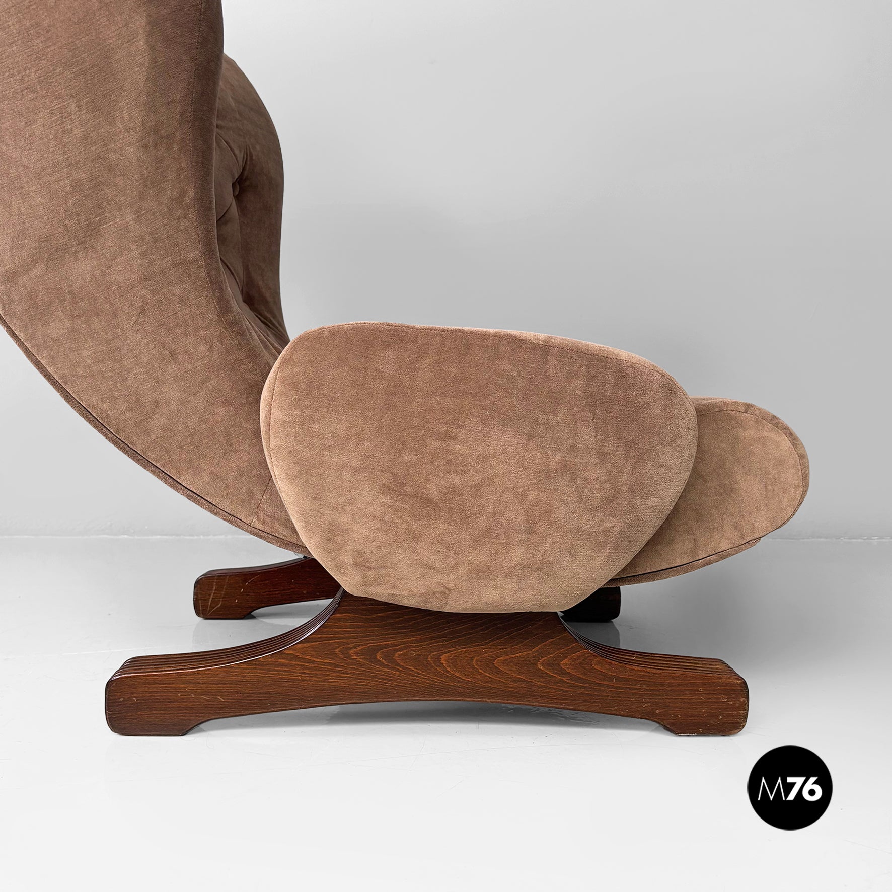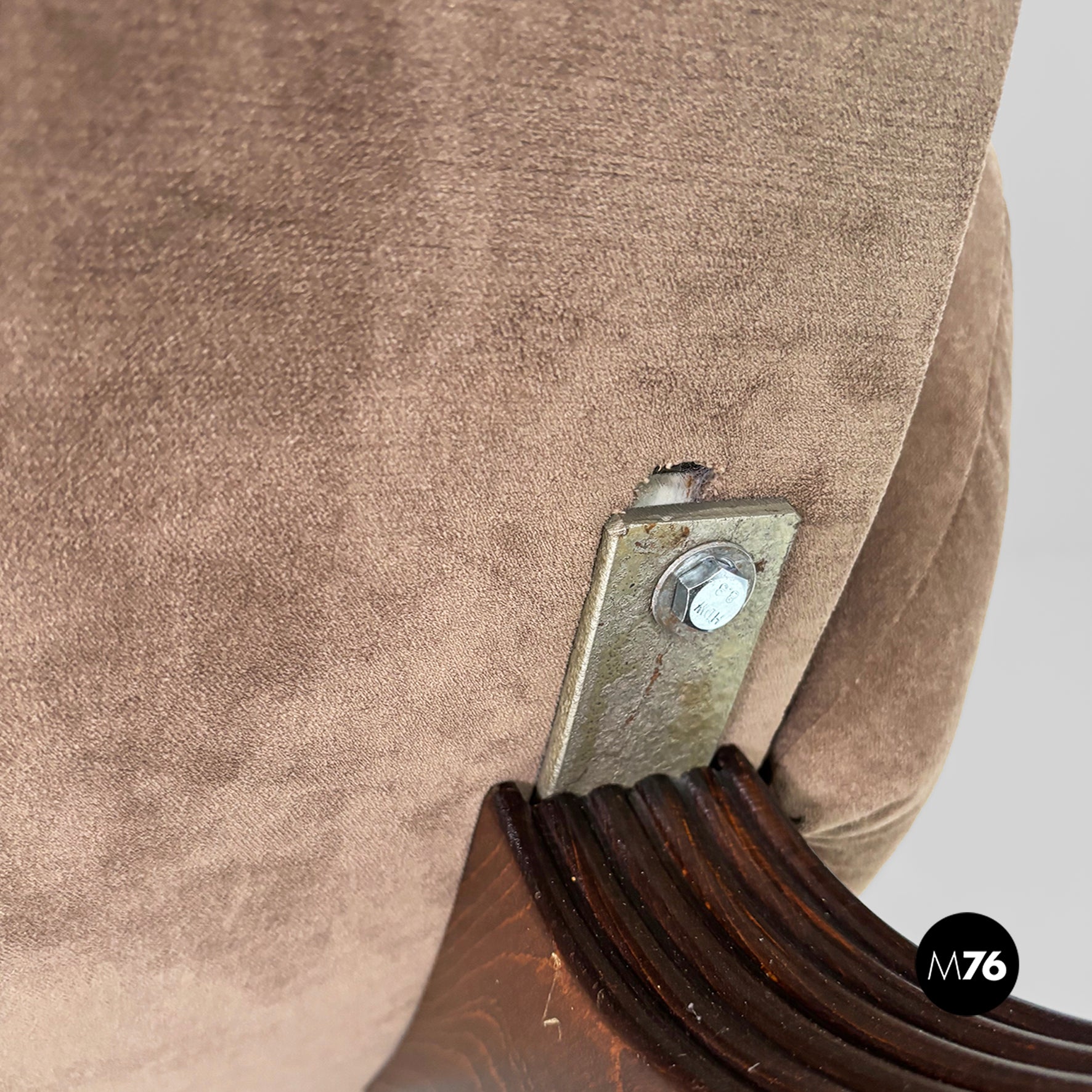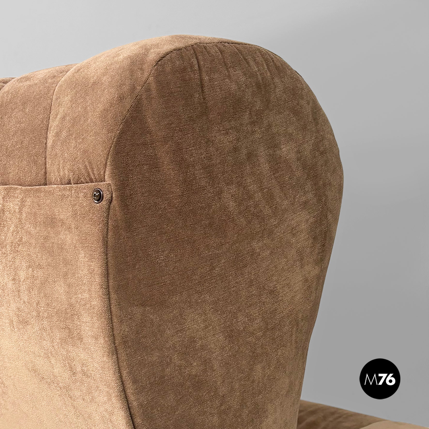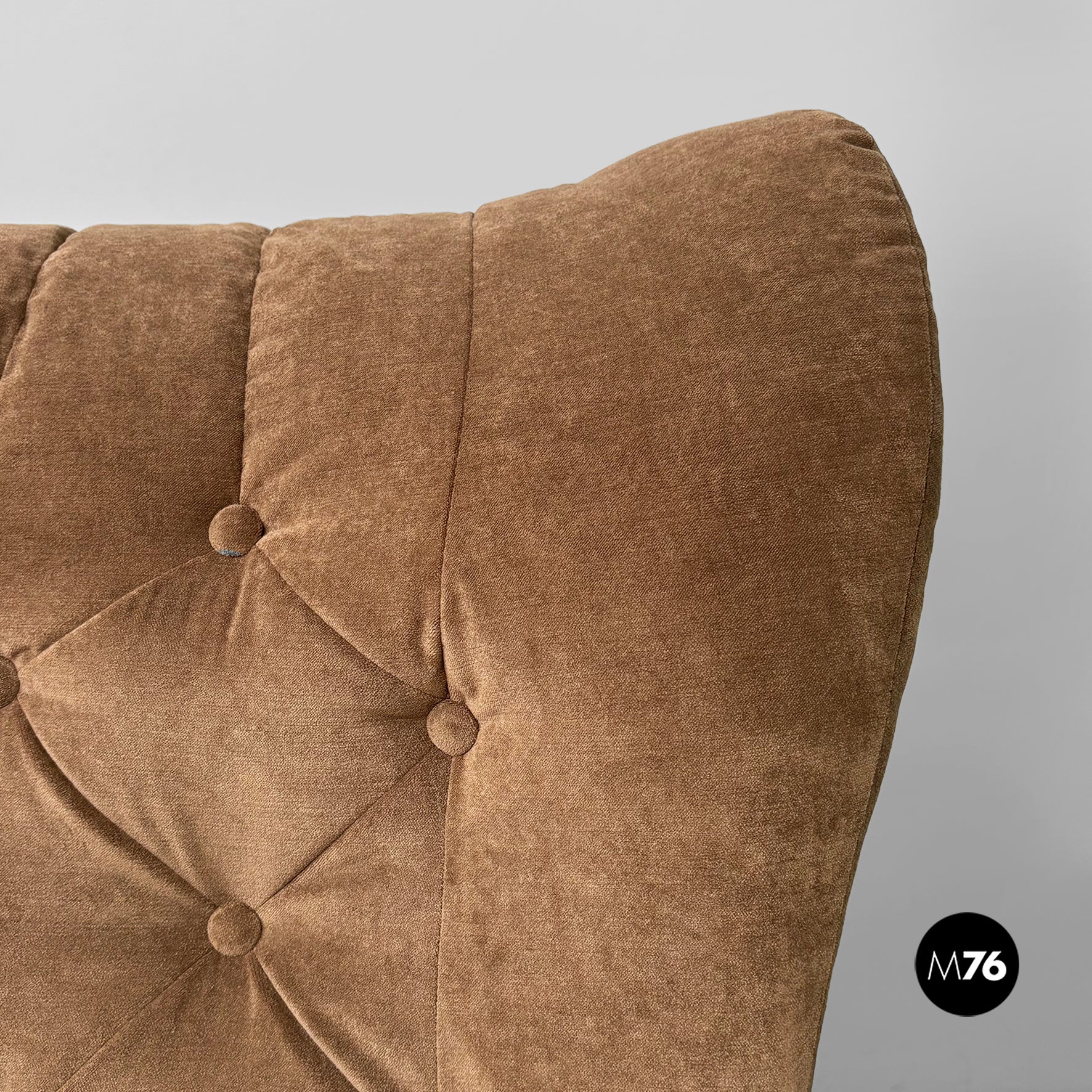 Armchair with seat, backrest and armrests, padded and upholstered in light brown velvet. The two wooden legs feature decorative grooves.