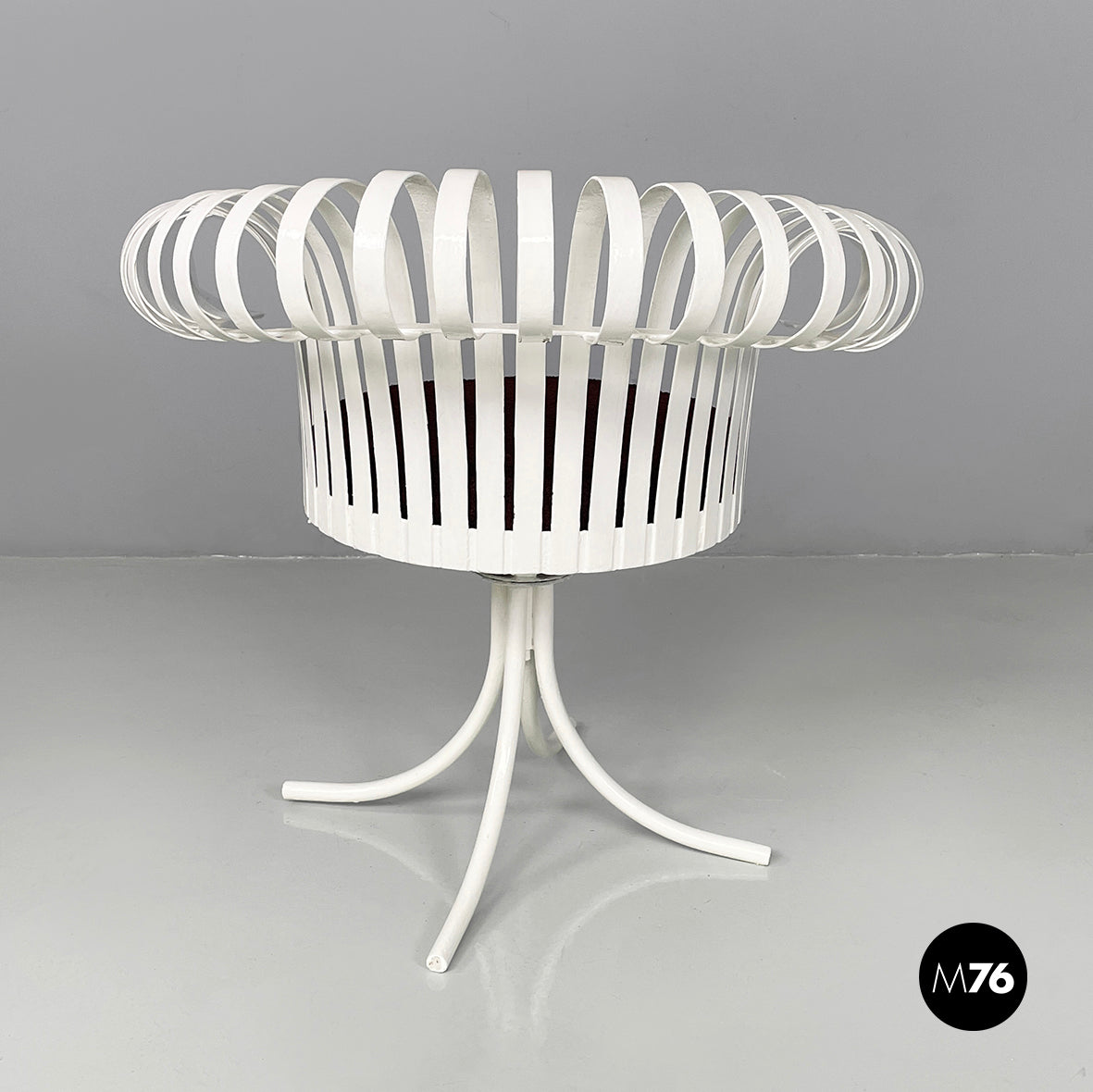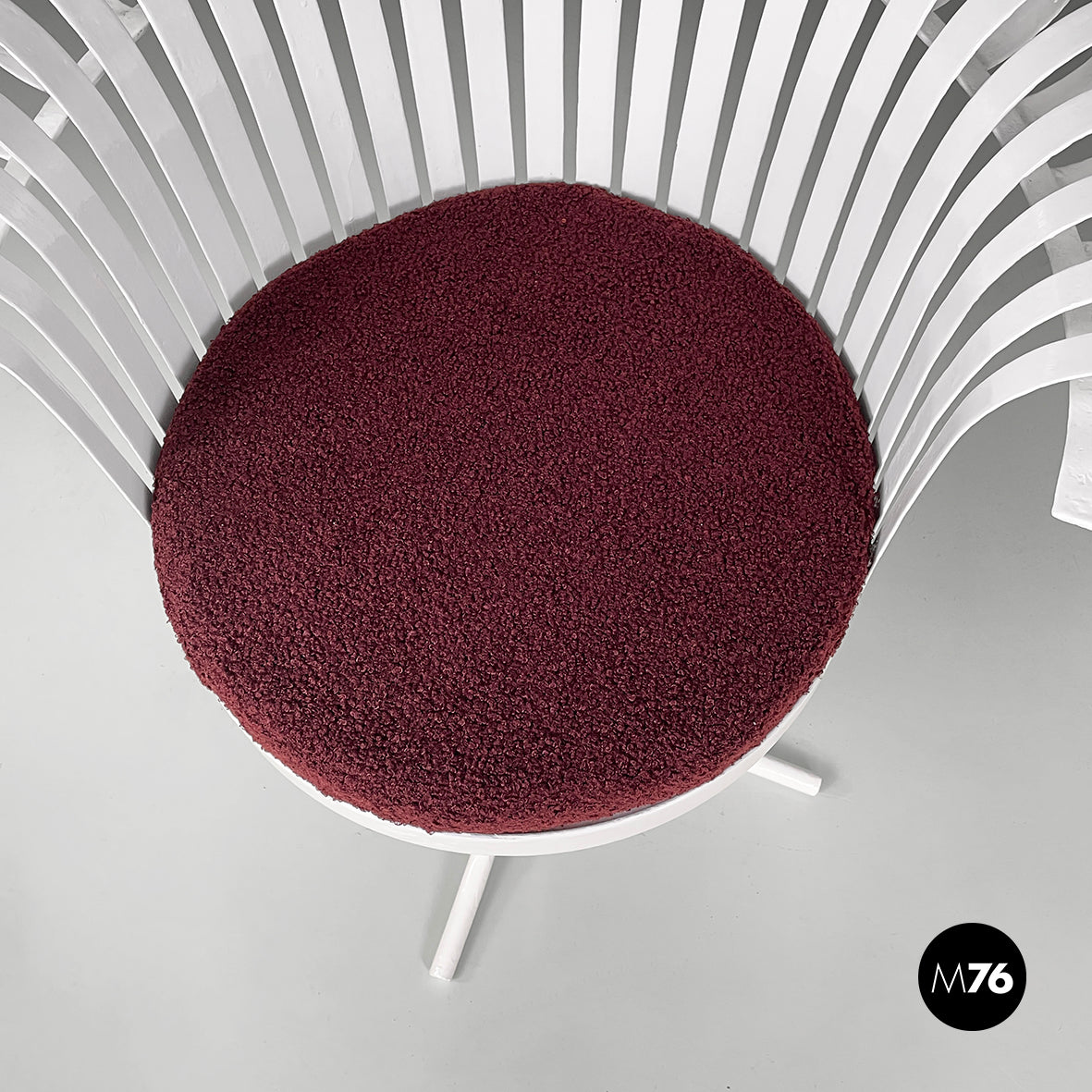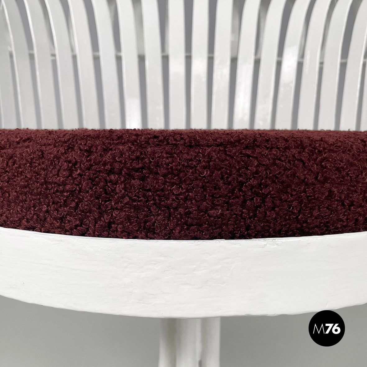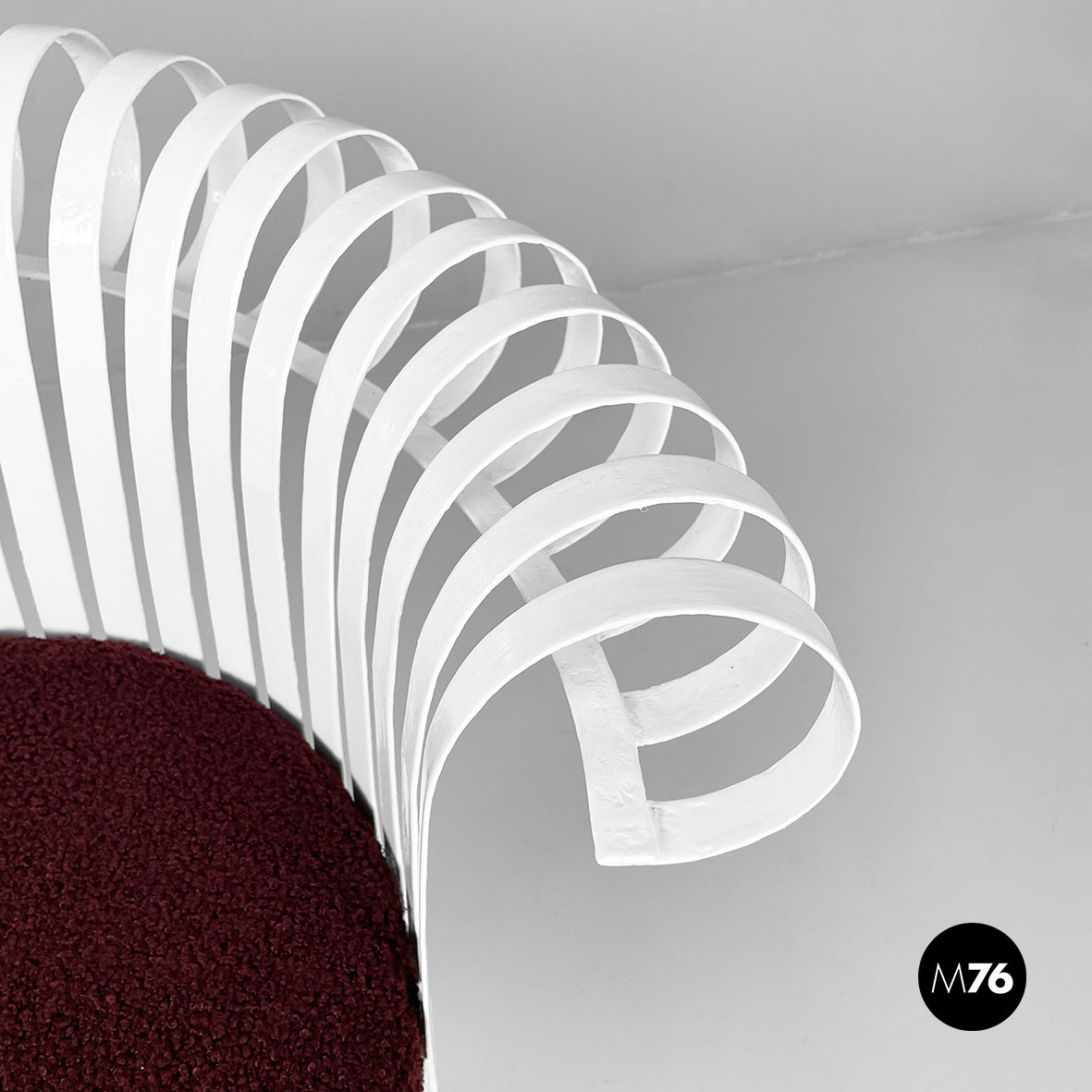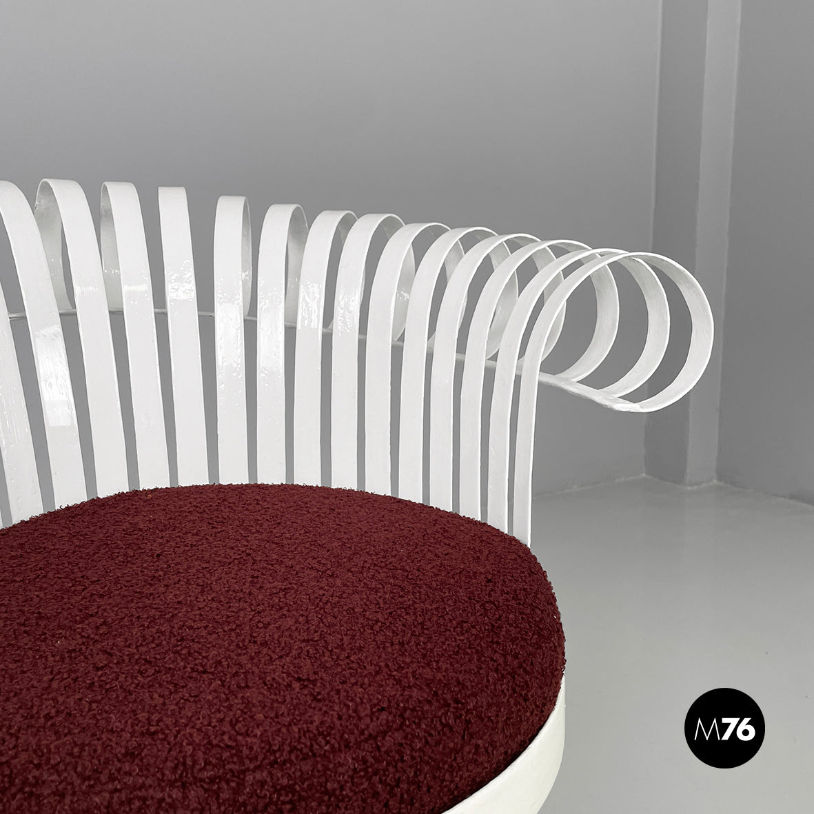 Set of four armchairs with round seat padded in brown teddy fabric, the brown tending towards red. The backrest and armrests are made of curved curly strips, in white painted metal. Four-spoke base in white painted metal rod. Suitable for outdoor use as garden chairs.